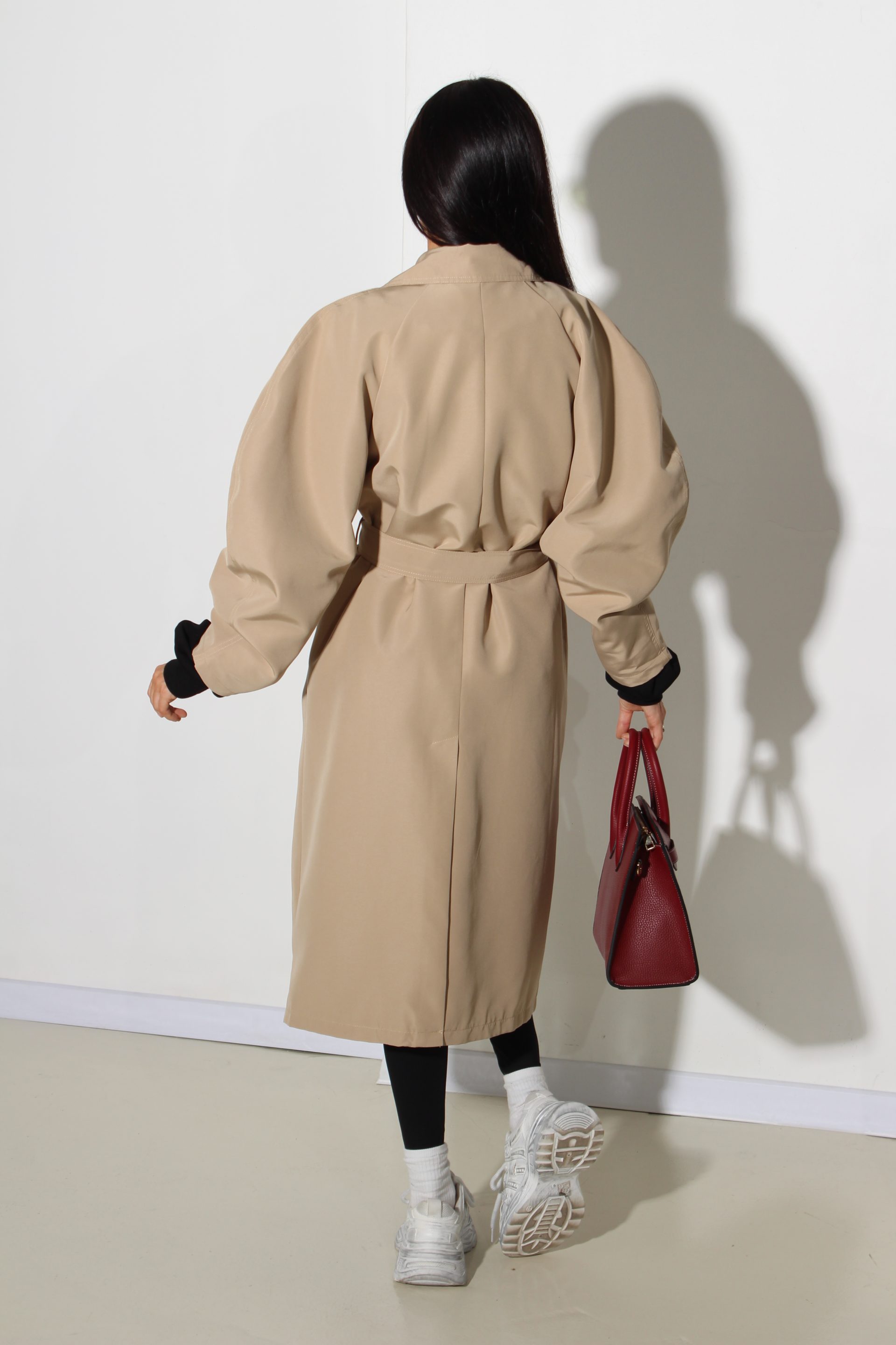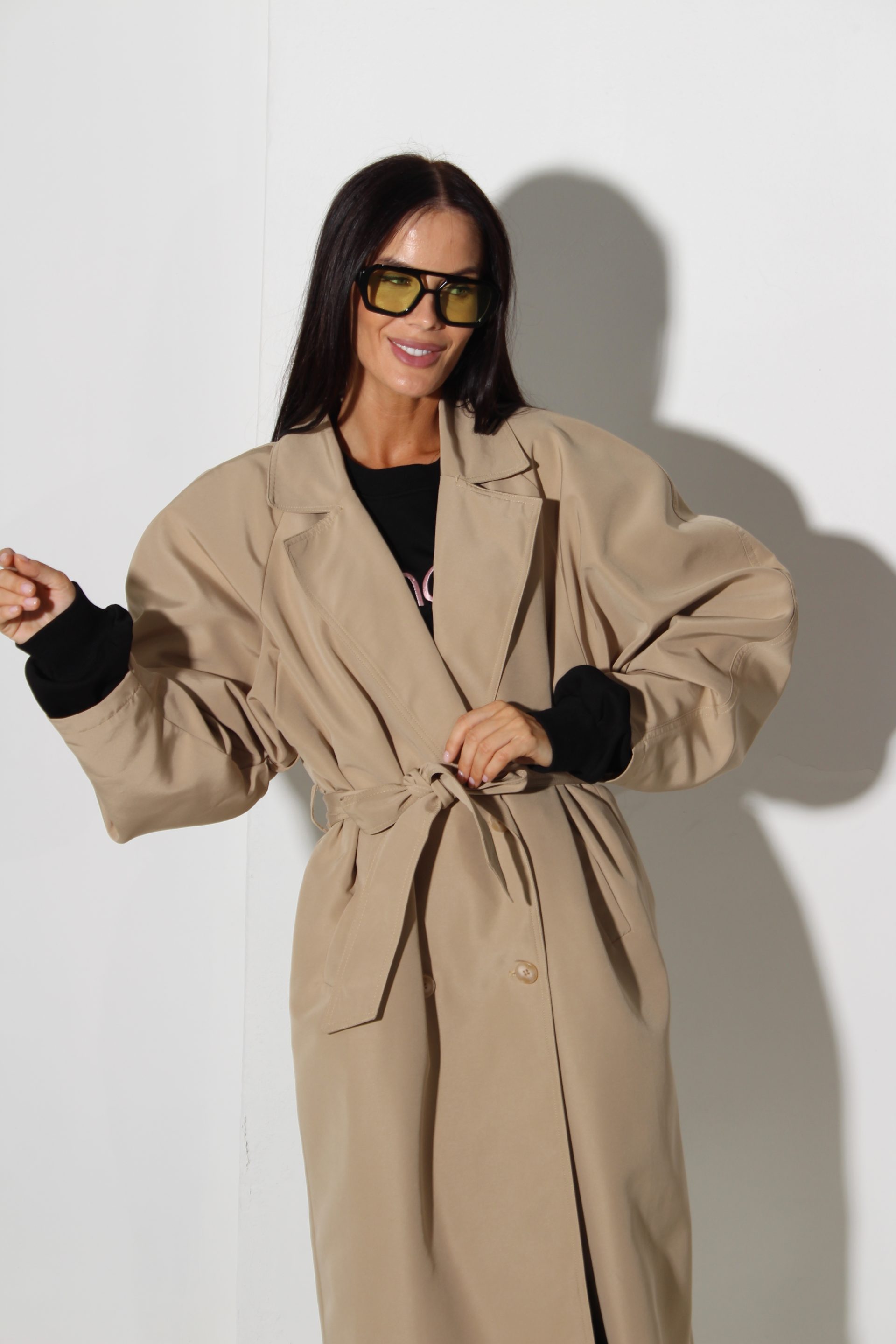 Bēšas krāsas trencis ar stilizētu augšdelnu – 16028