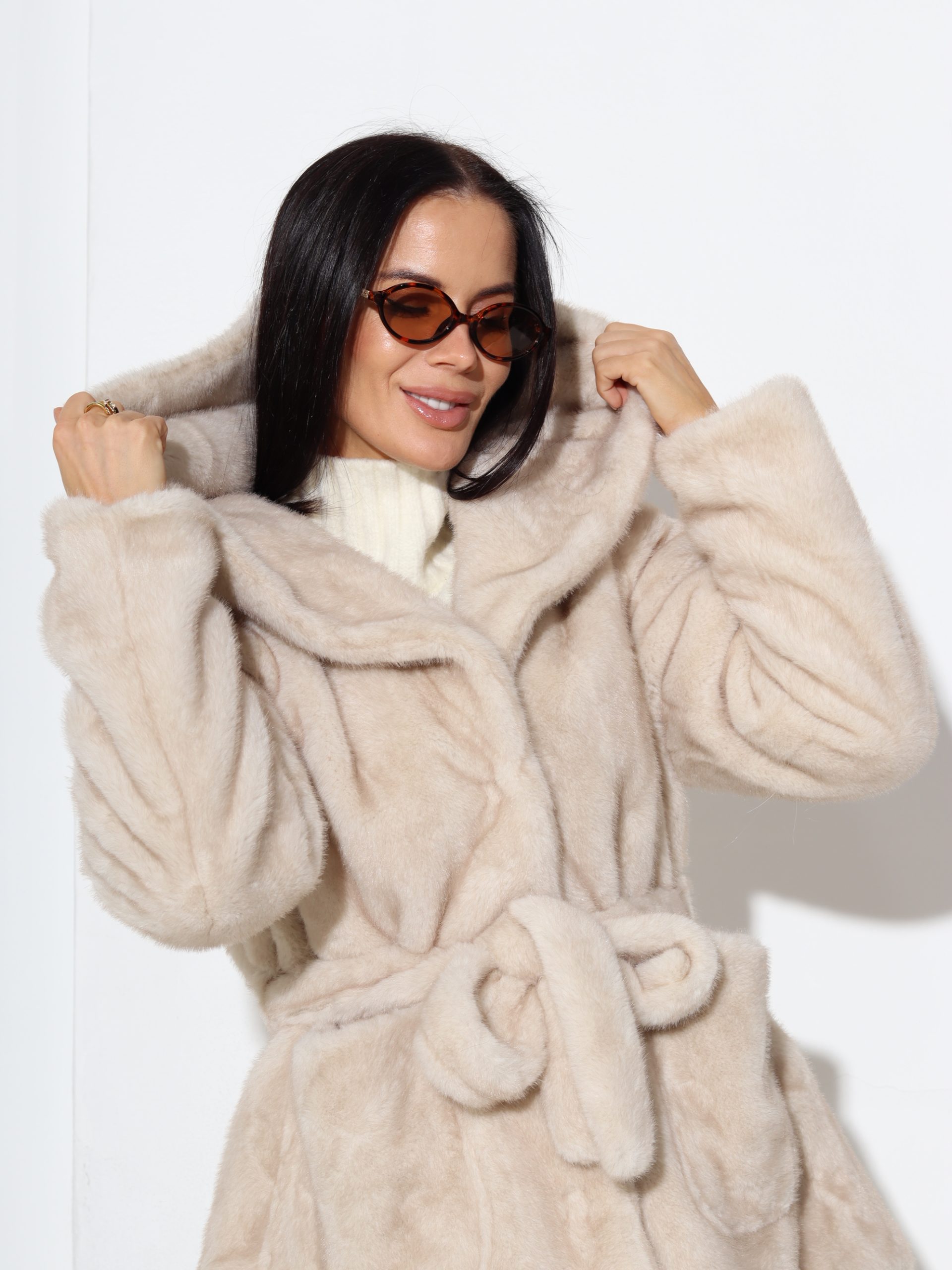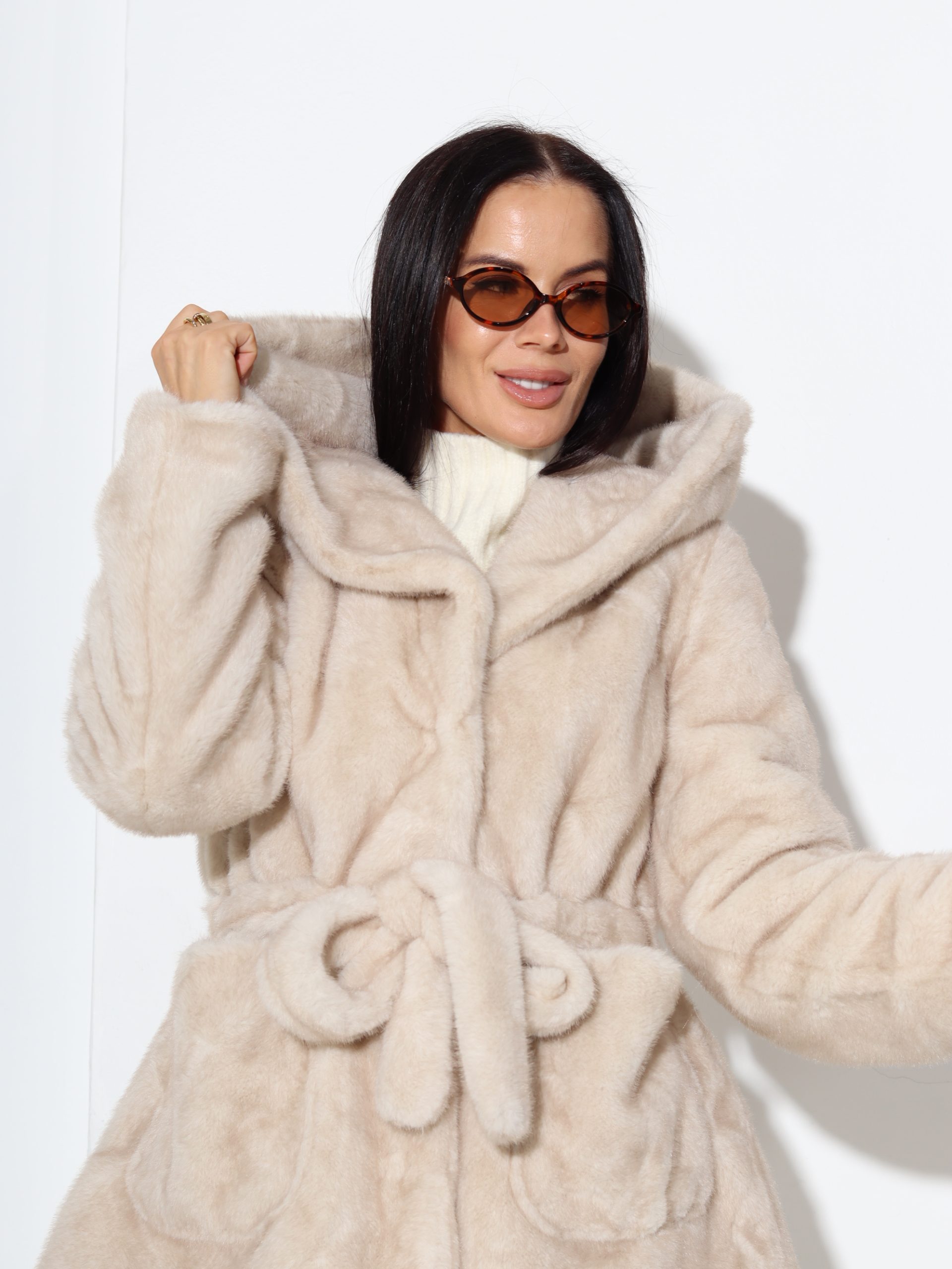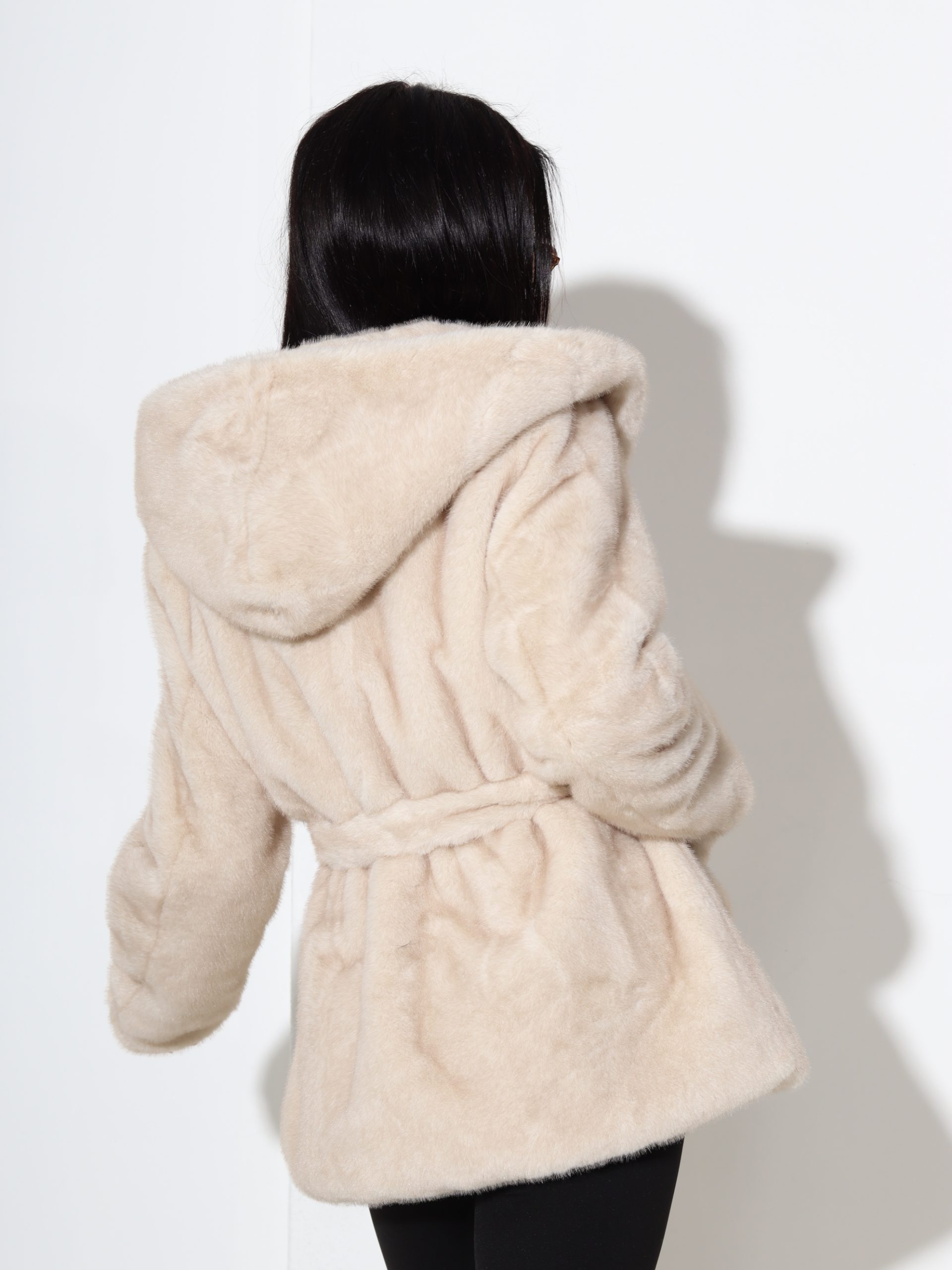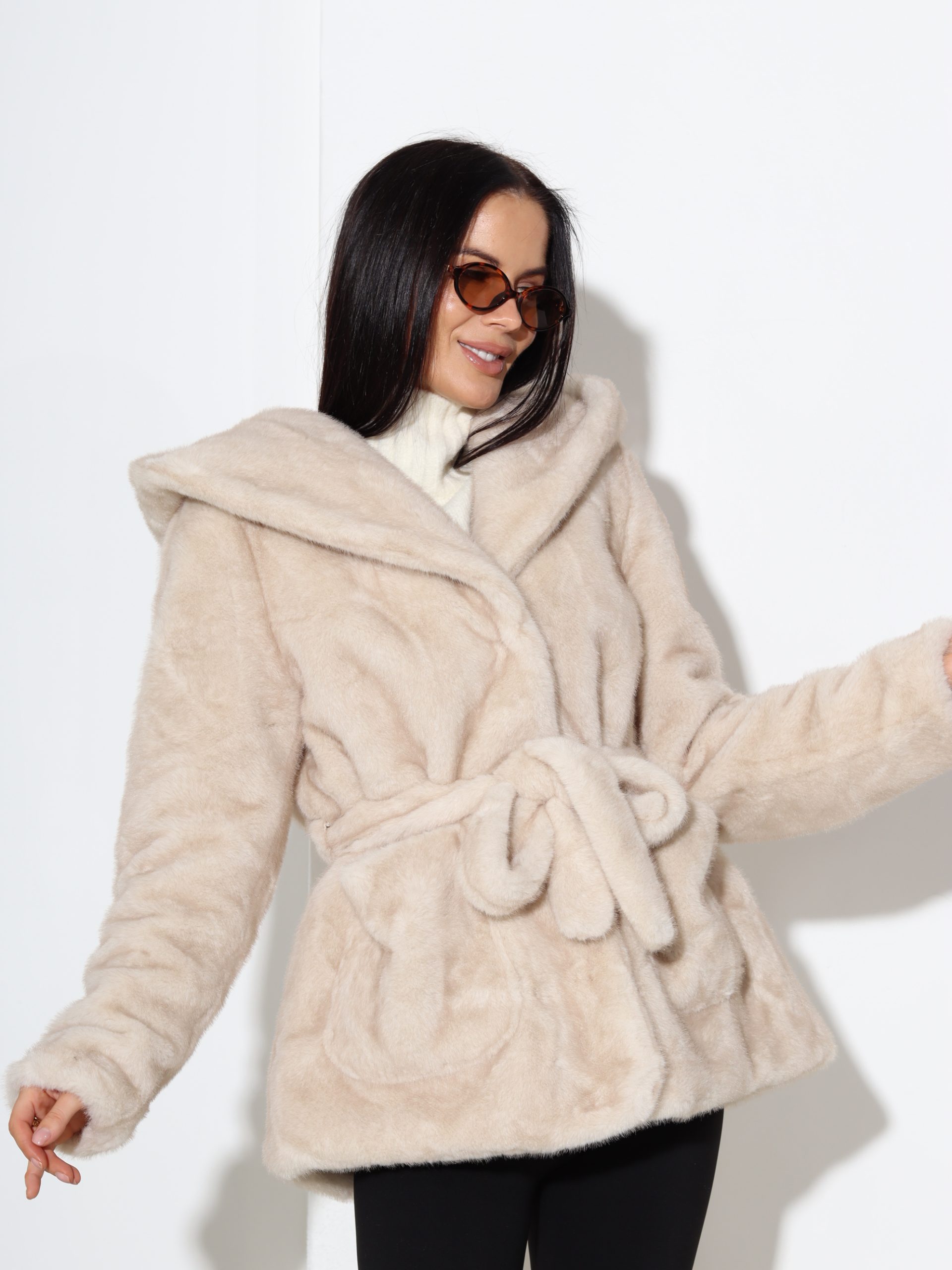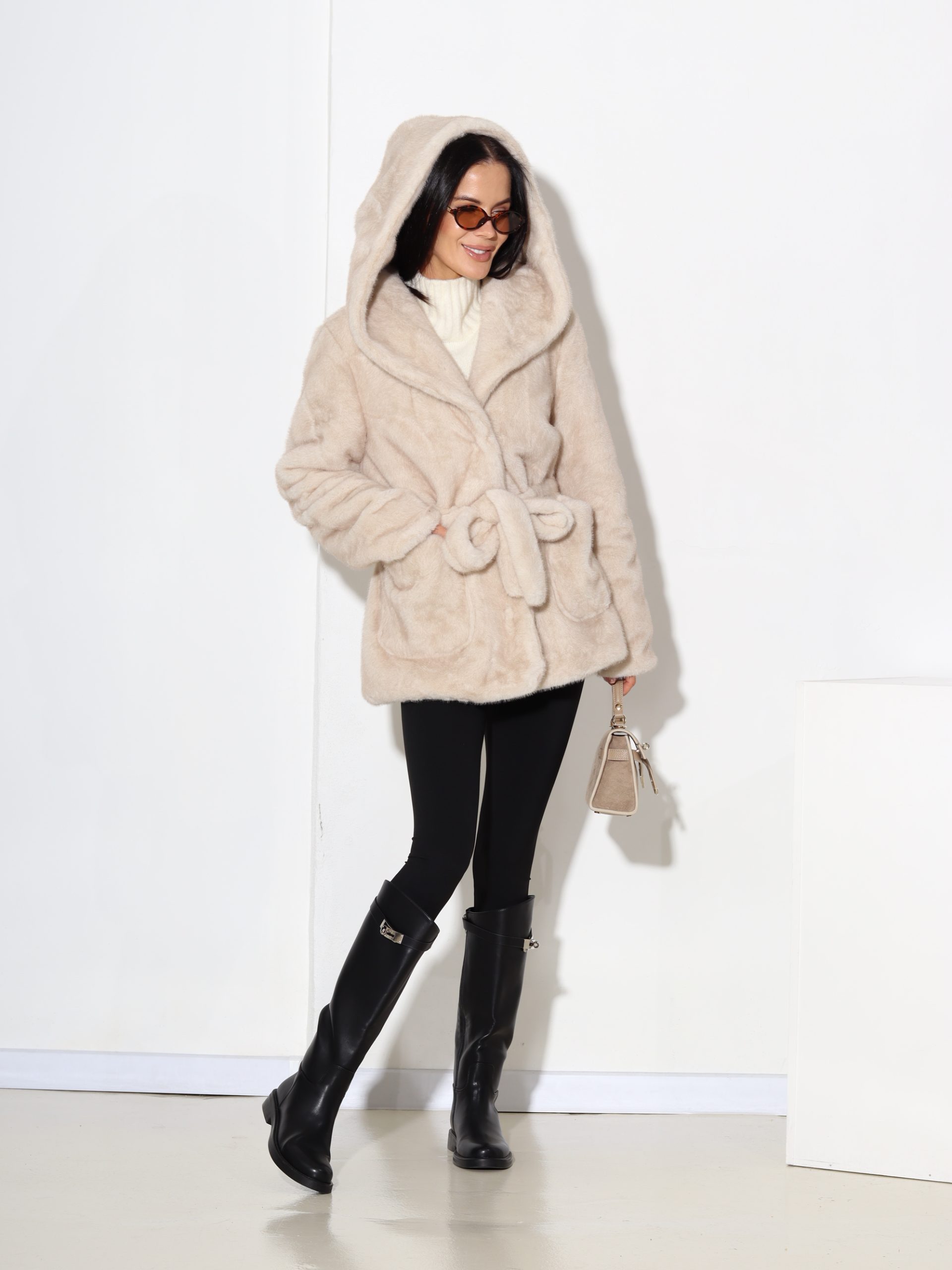 Bēšs īss, gludas spalvas kažkoks ar jostu. Kažokam ir kabatas, kapucis un kažoka krāsai pieskaņota odere.
