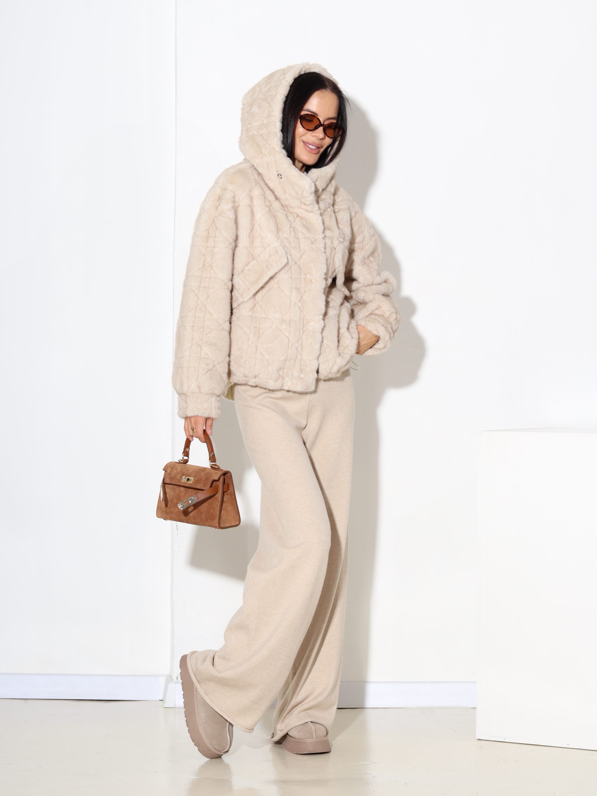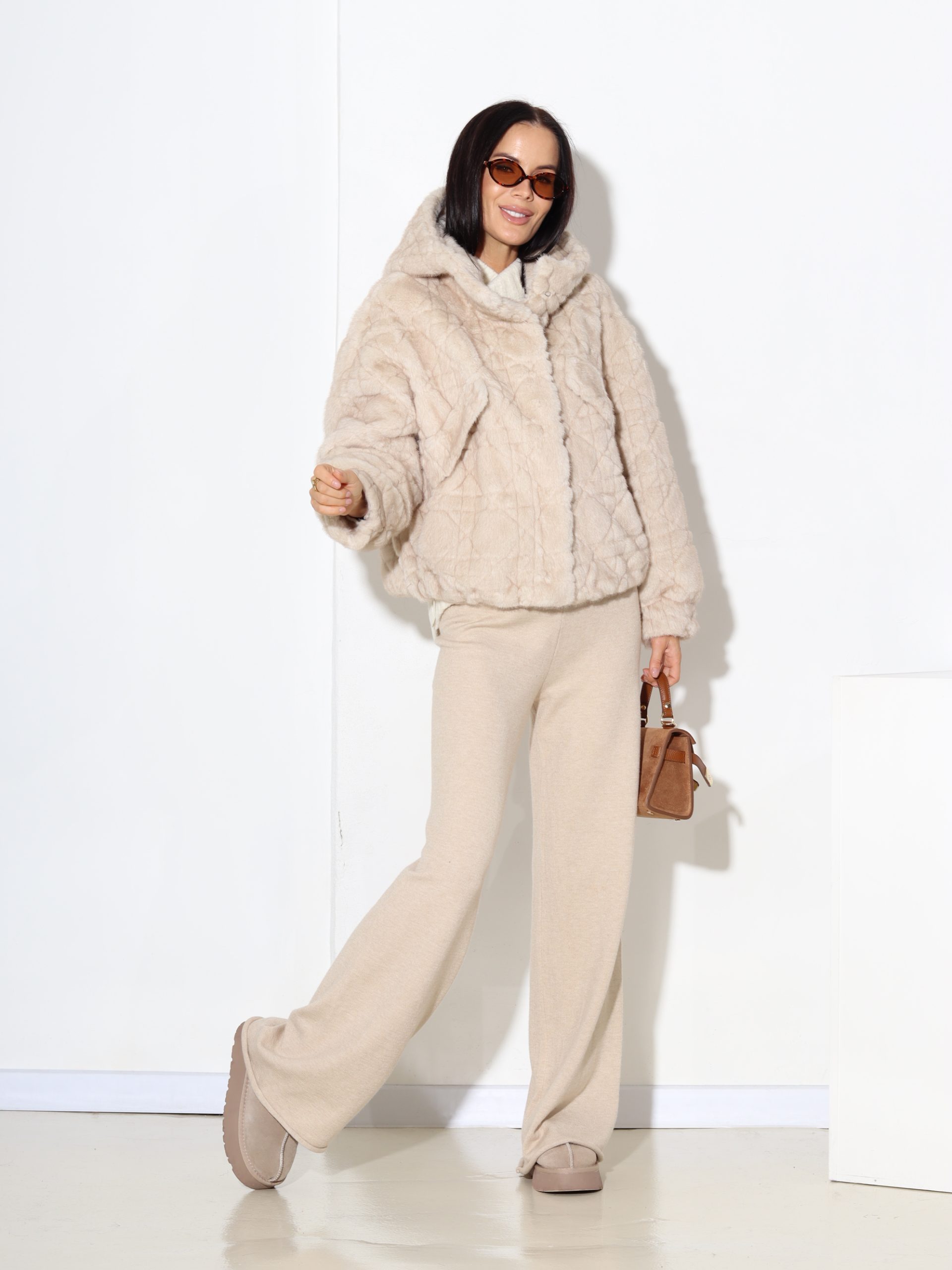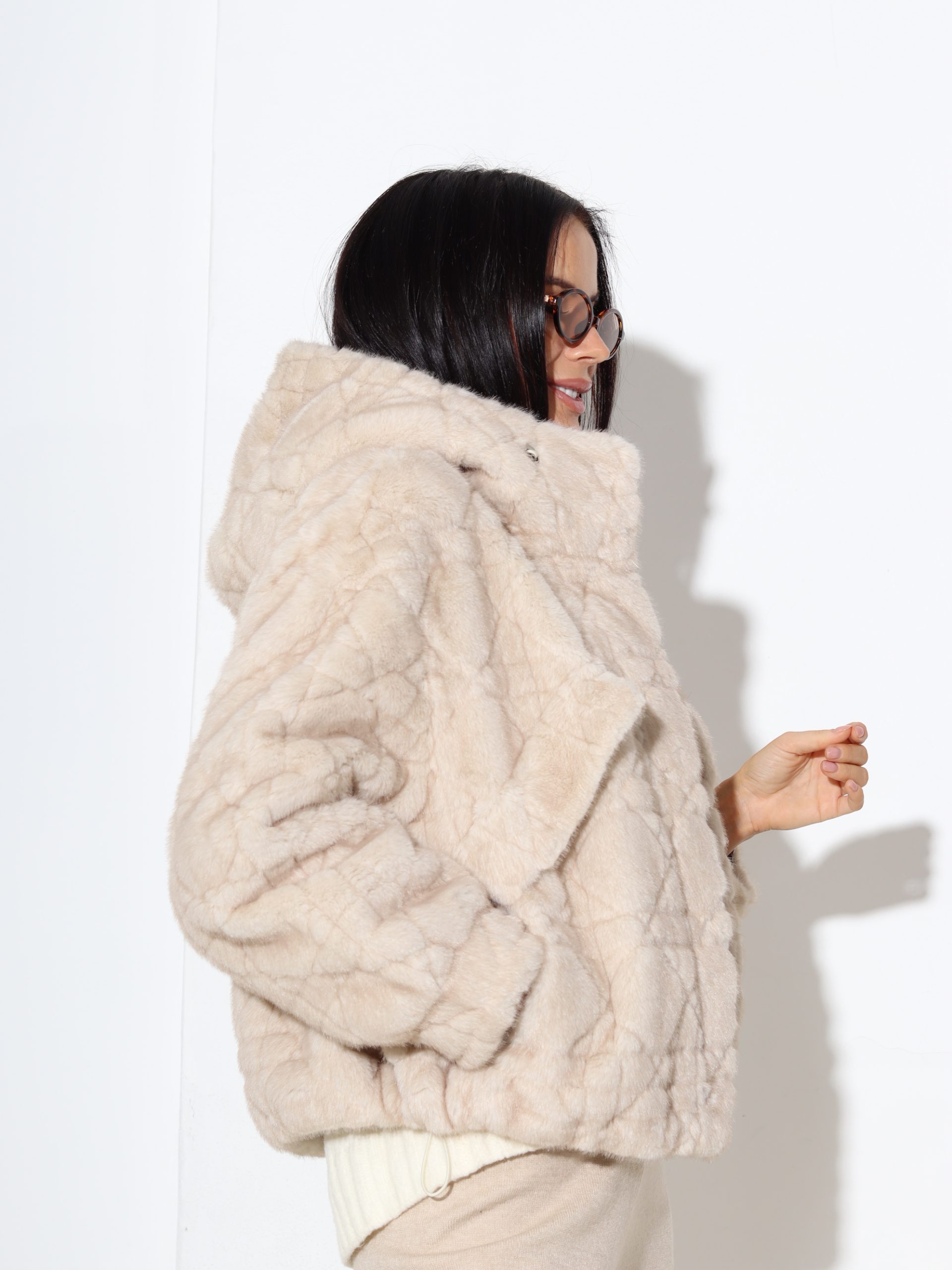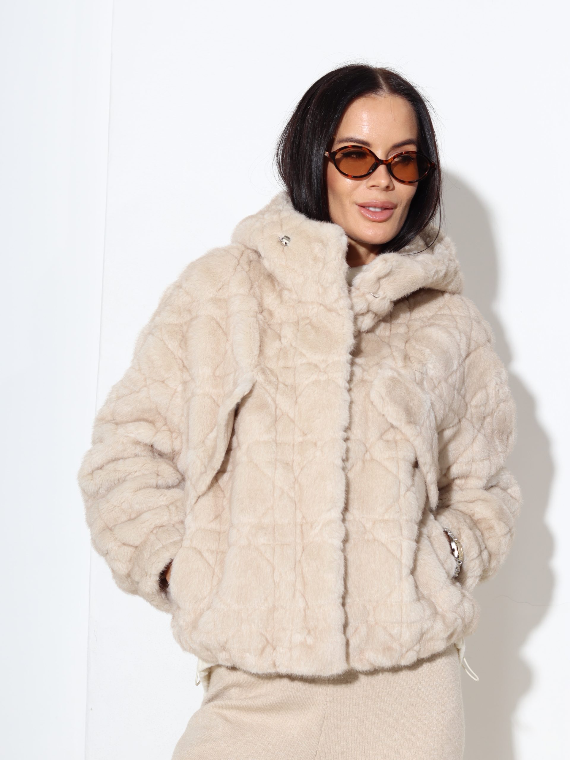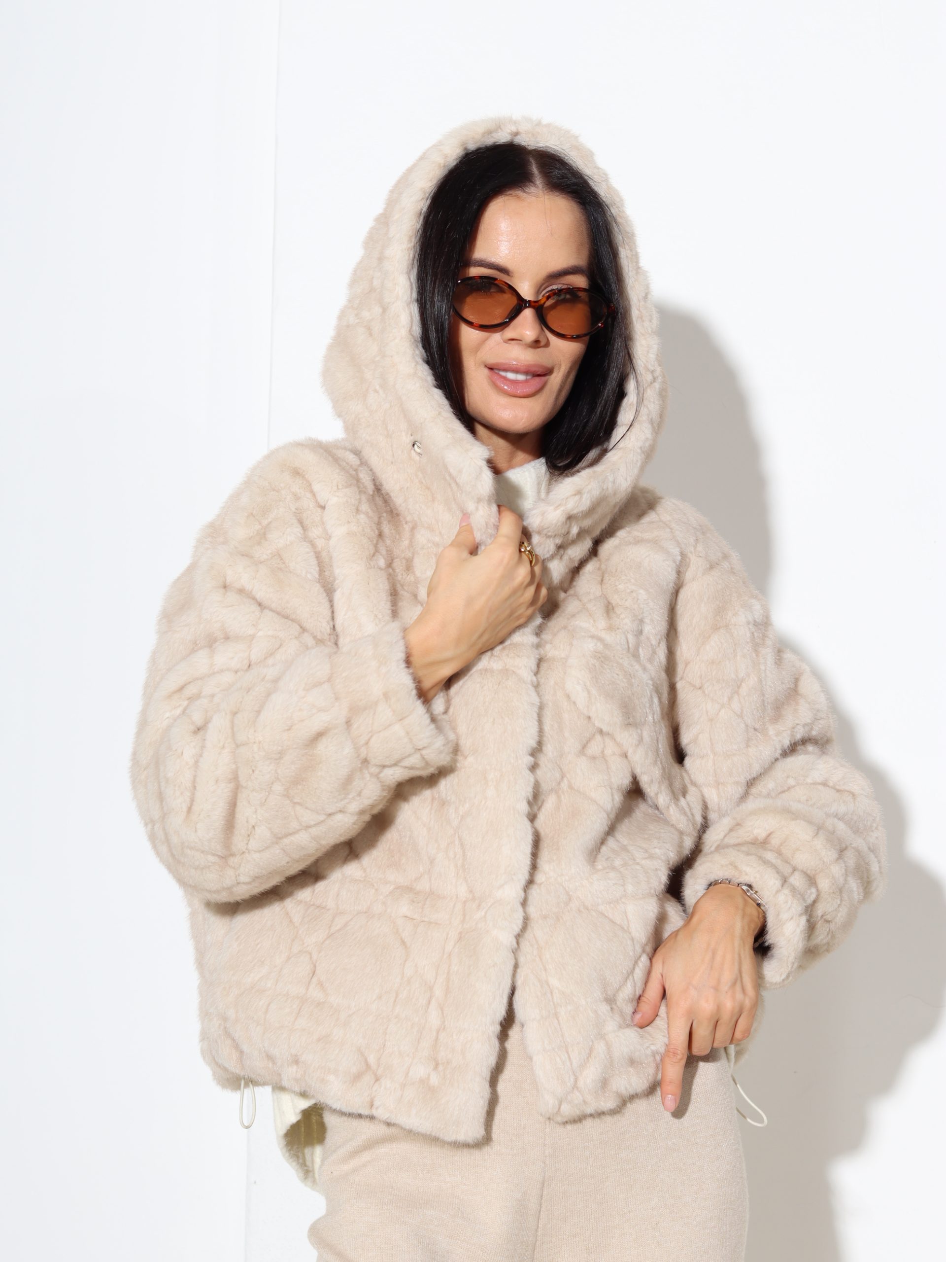 Bēšs īss m/ā kažoks ar izšūtu rakstu un kapuci – 17321