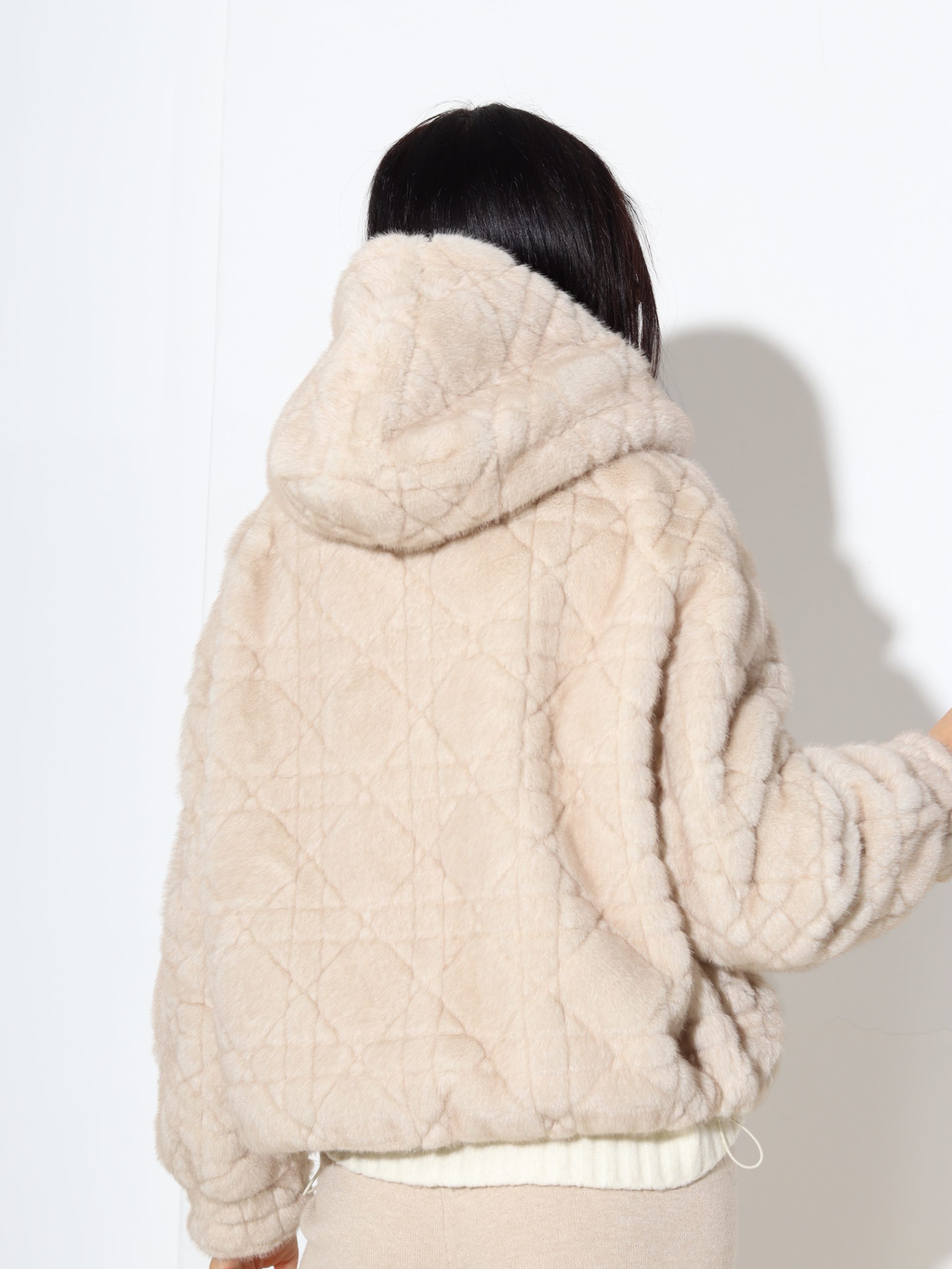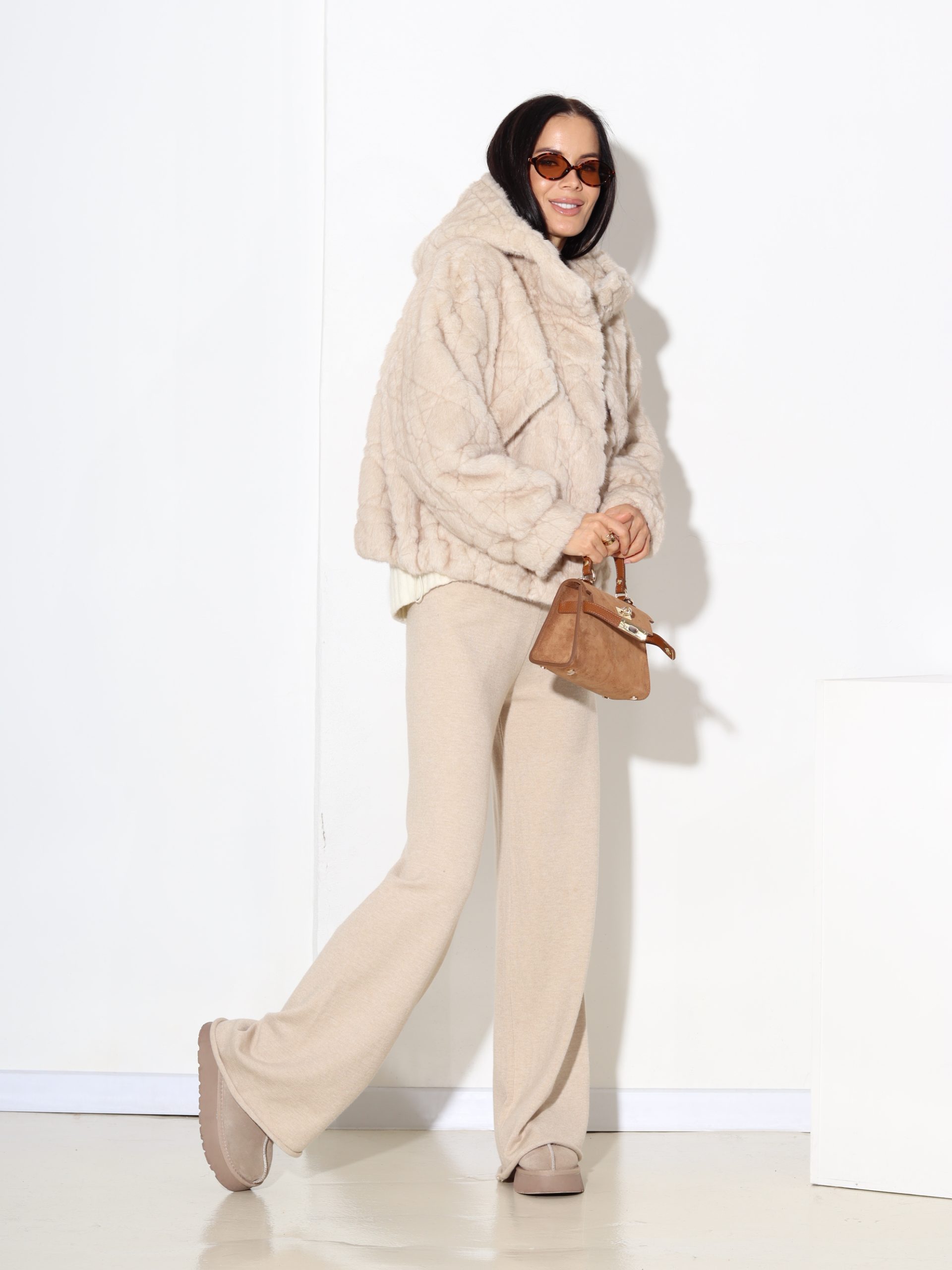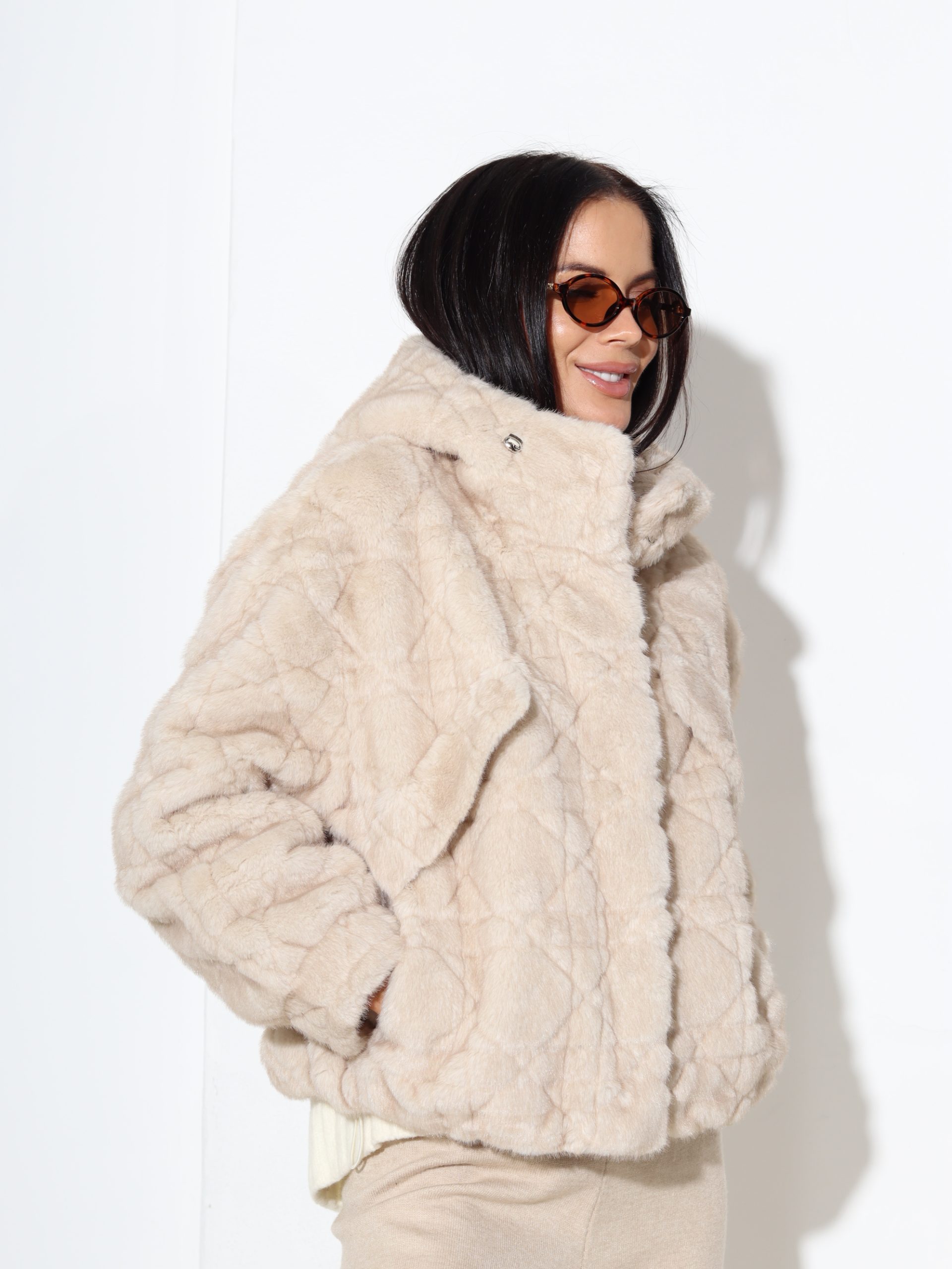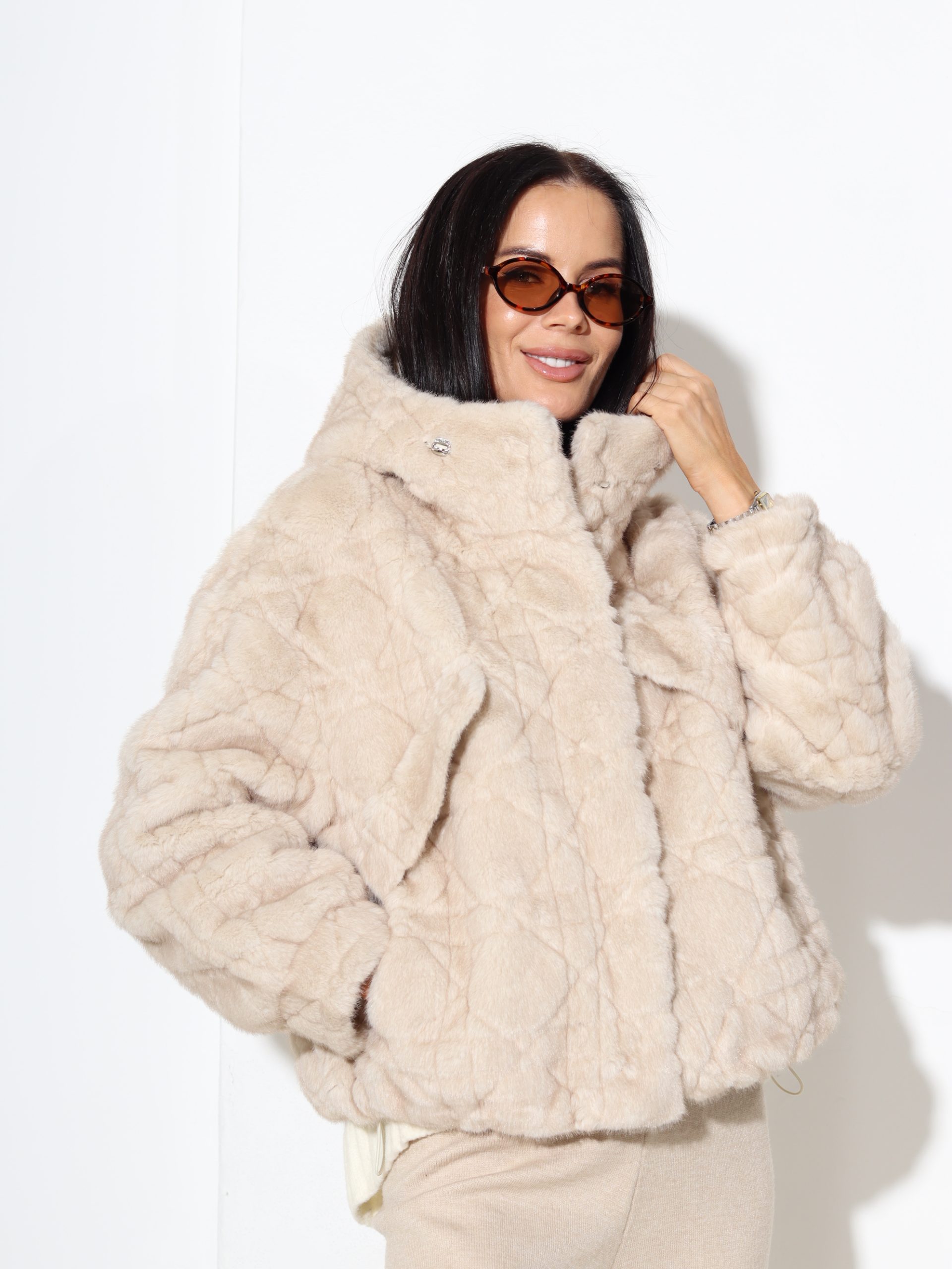 Bēšs īss, gludas spalvas kažoks ar izšūtu rakstu. Kažokam ir savelkama apakšdaļa, dekoratīvas kabatas priešpusē, kapucis, kas ir savelkams un kabatas. Kažokam ir odere un āķīšu aizdare.