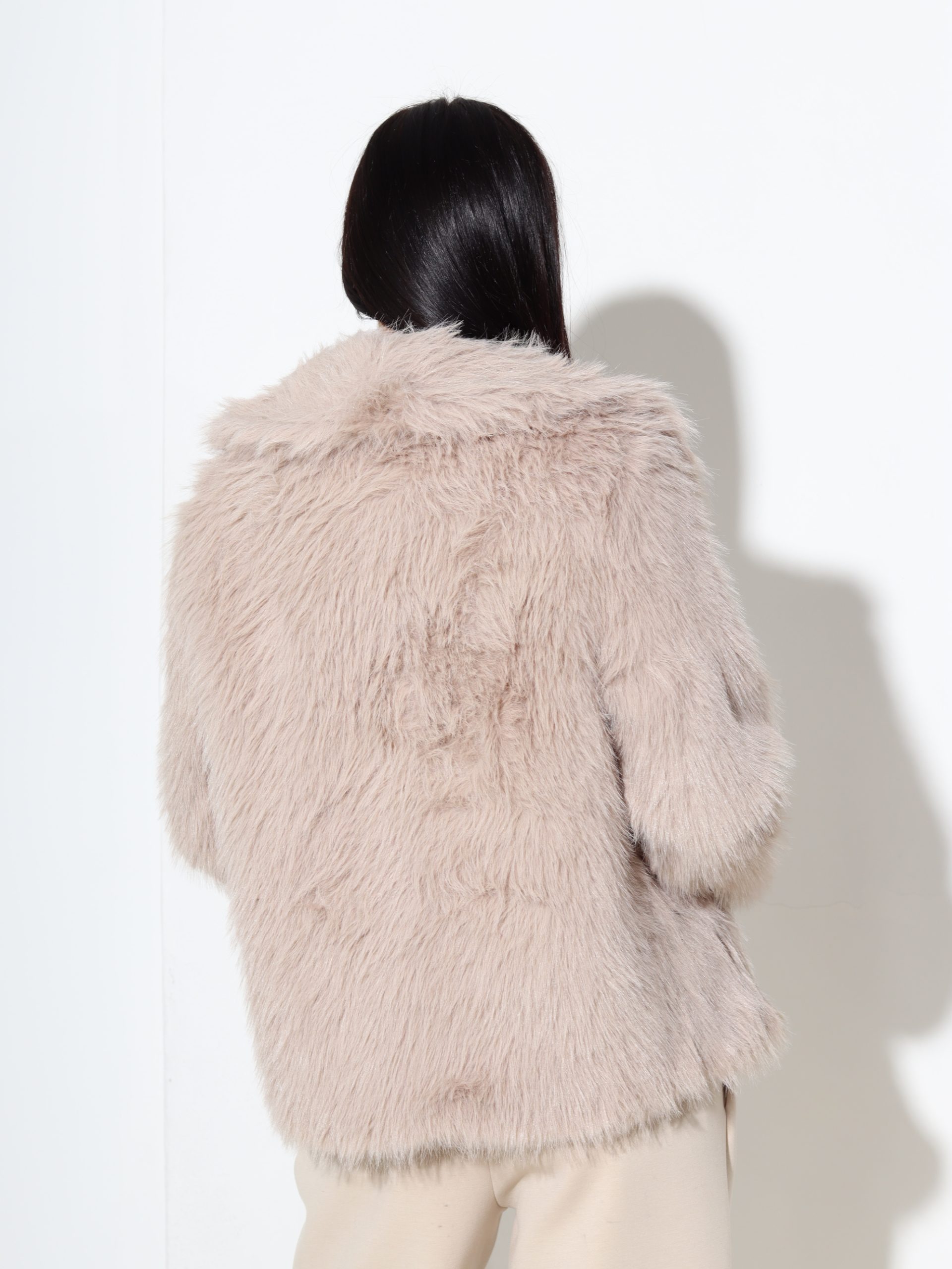 Bēšas krāsas kažoks ar apkakli un sānos iestrādātām kabatā. Kažoks ir bez aizdares. Iekšpusē ir iestrādāta pieskaņotas krāsas odere.