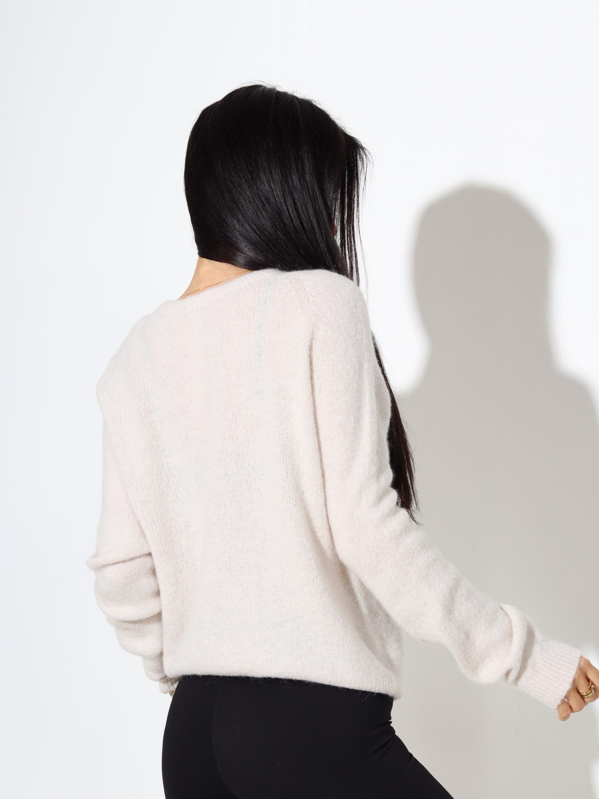 Smalka adījuma alpakas džemperis. Džemperim ir garas piedurknes un “U” veida kakla daļa.