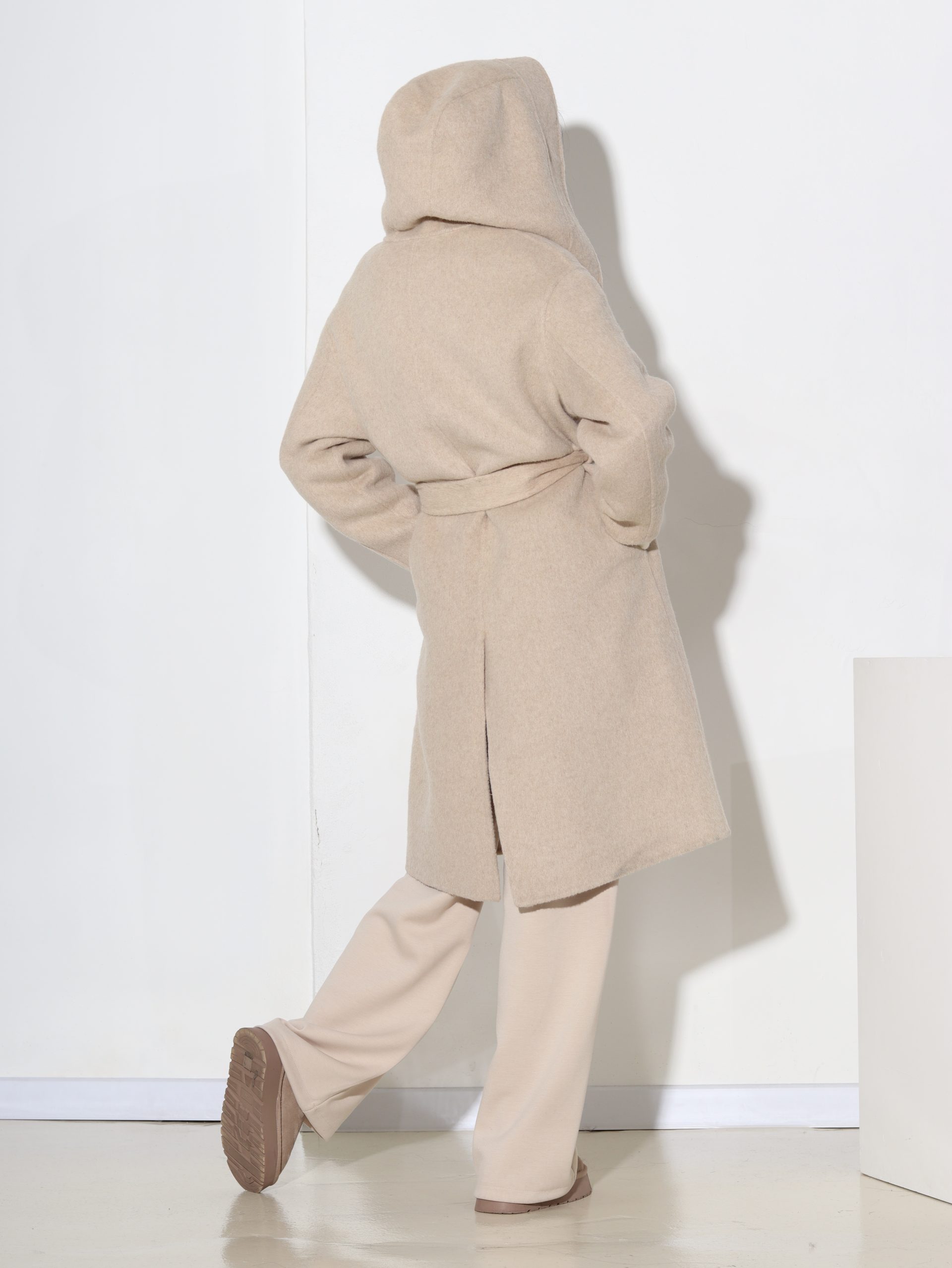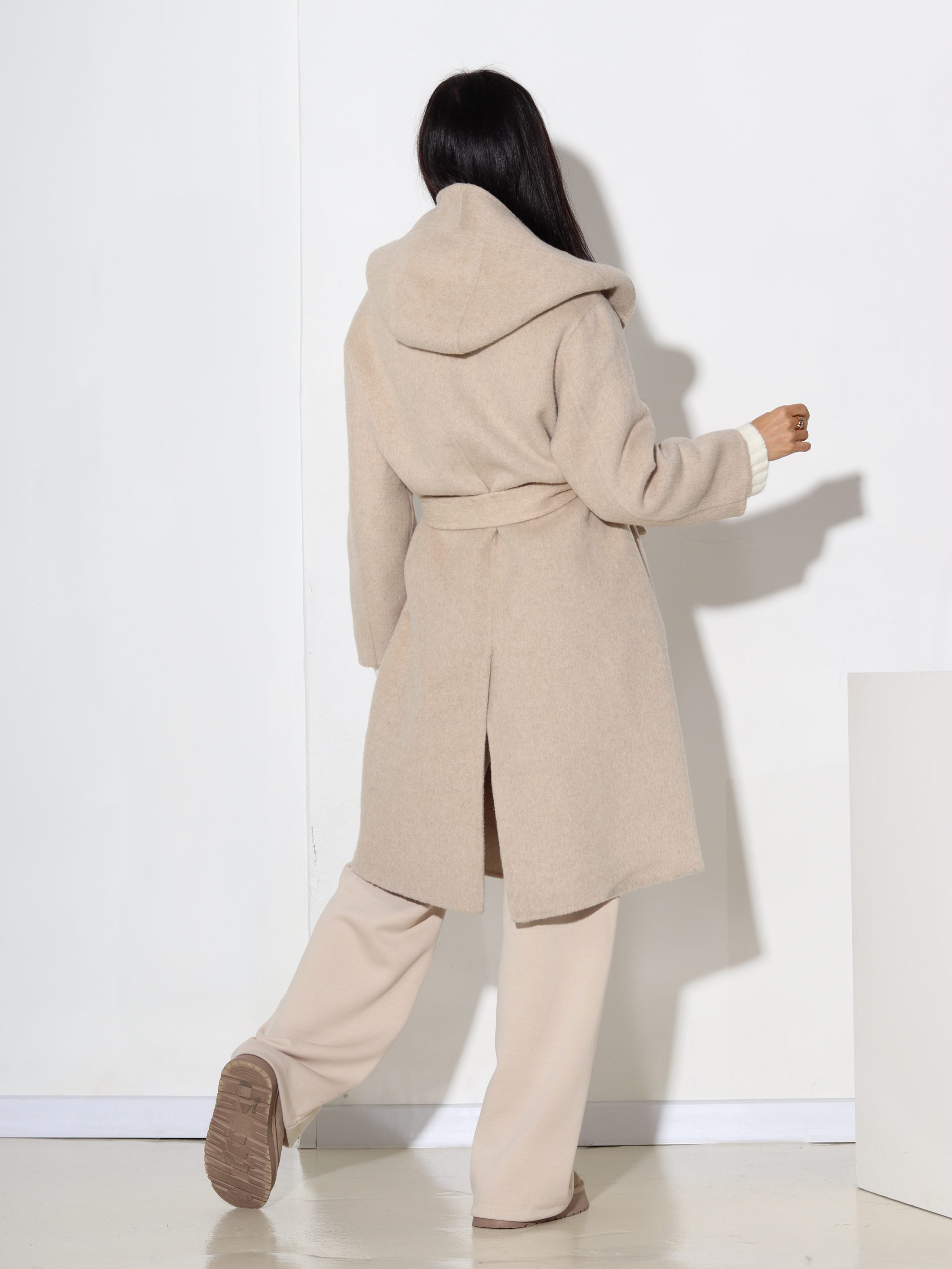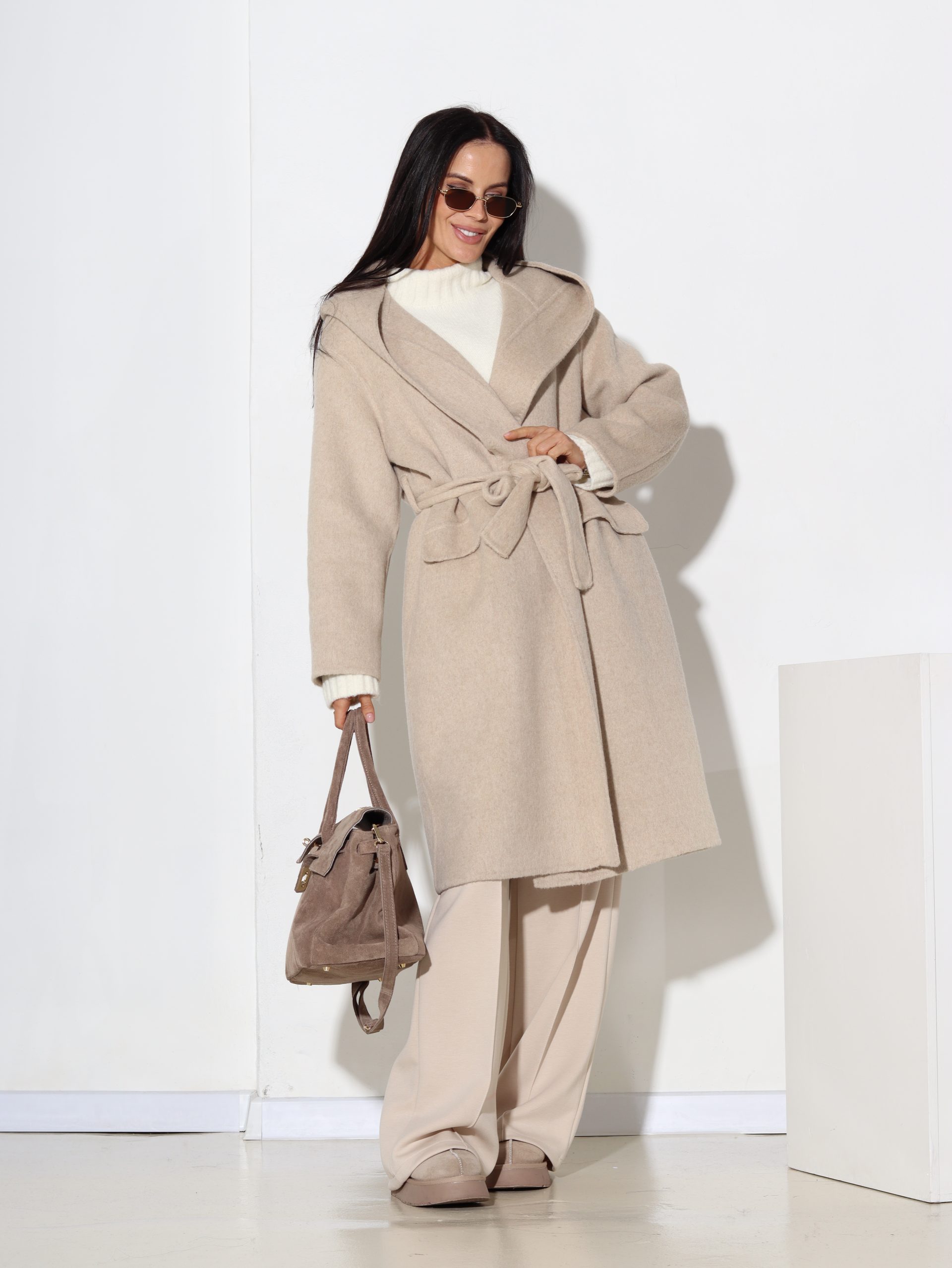 Klasisks auduma mētelis bez oderes. Mētelim ir kapuce, sānos iestrādātas kabatas, jostiņa vidukļa daļā. Mētelis atvērta modeļa bez aizdares