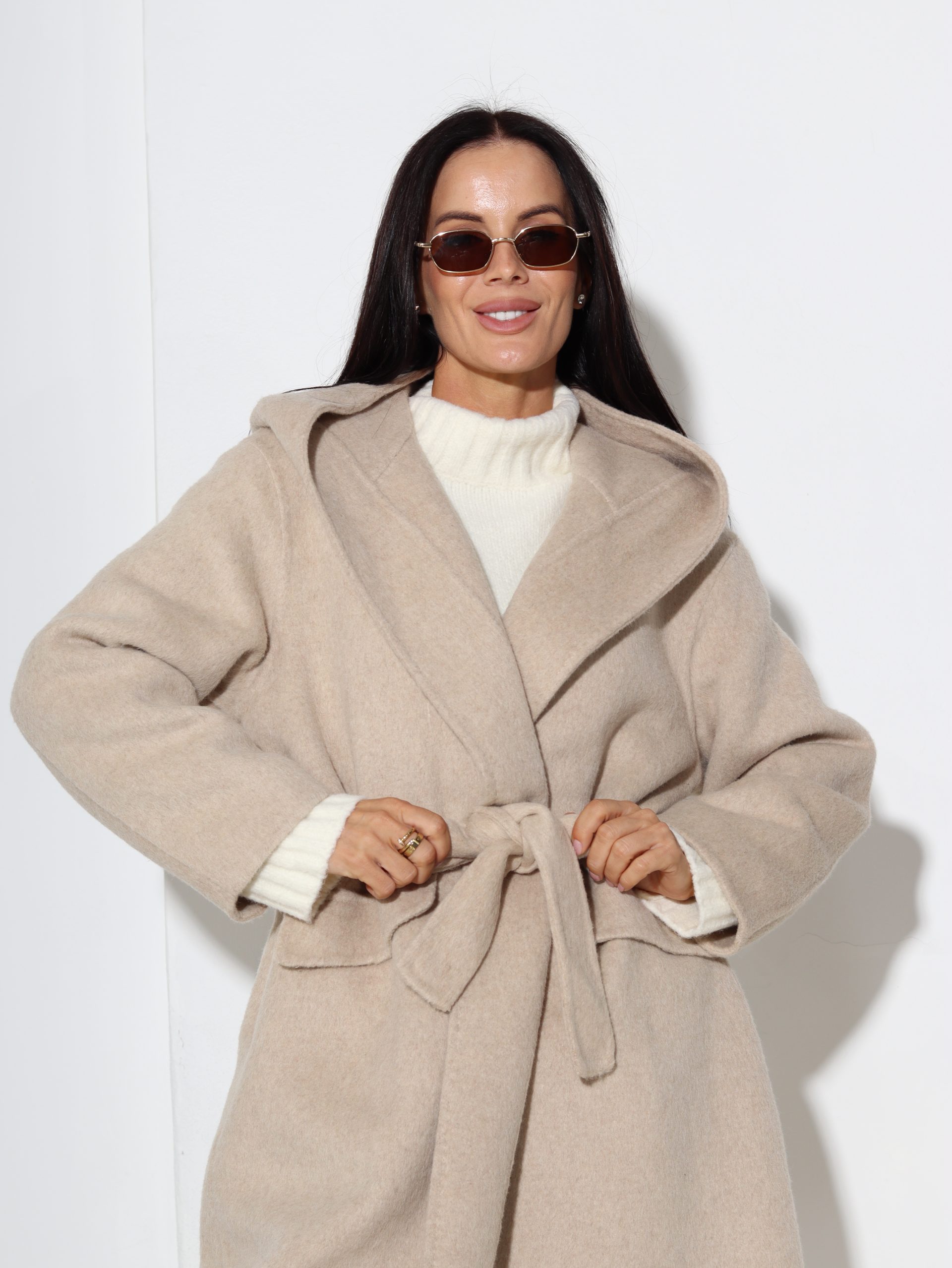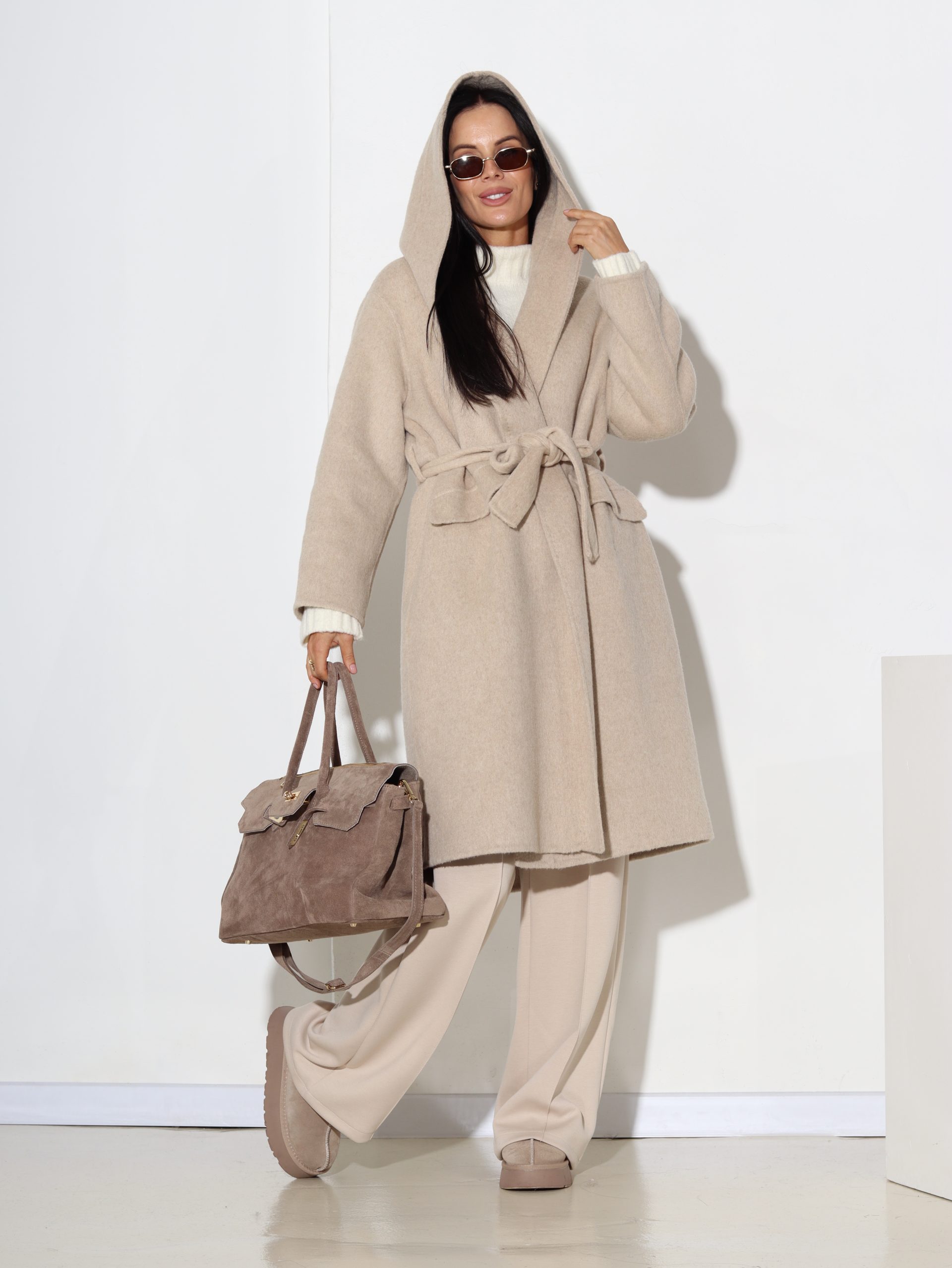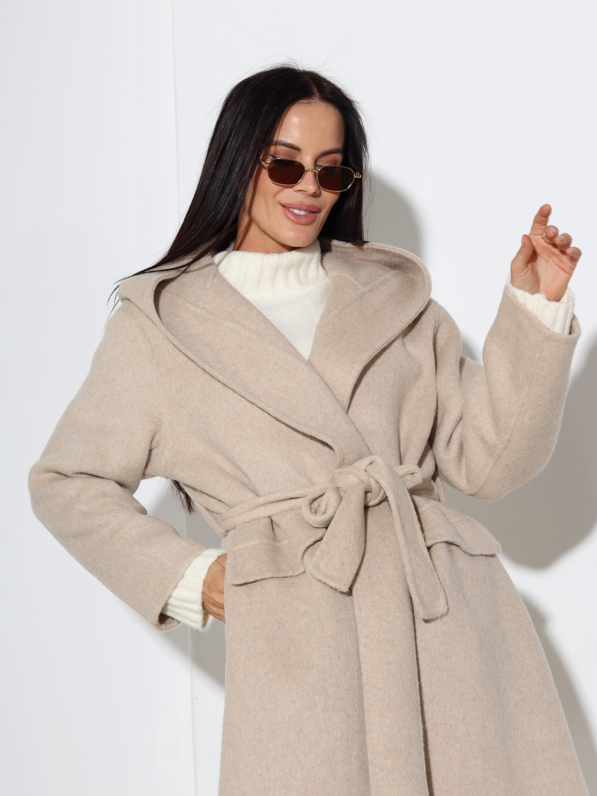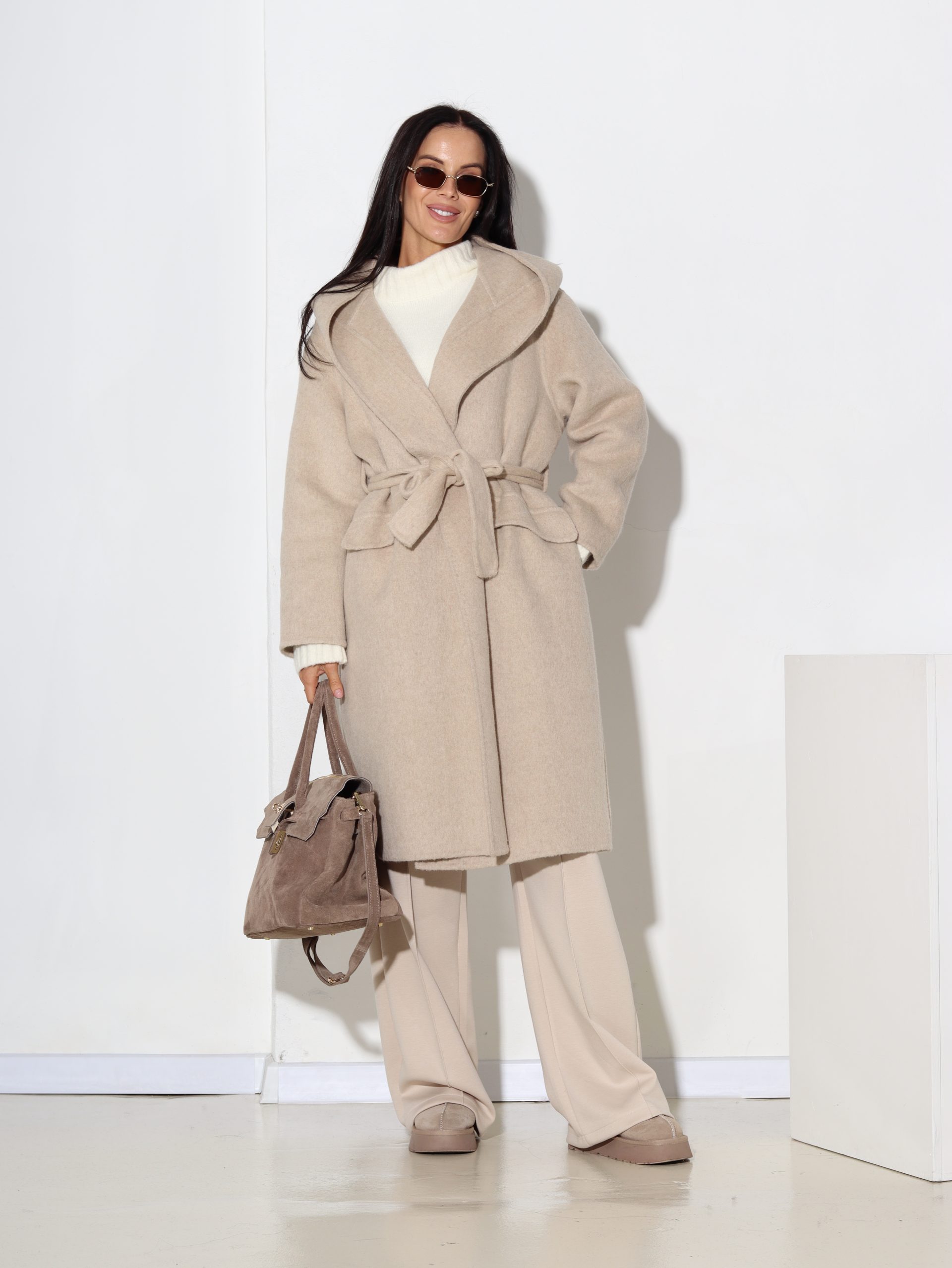 Klasisks auduma mētelis bez oderes. Mētelim ir kapuce, sānos iestrādātas kabatas, jostiņa vidukļa daļā. Mētelis atvērta modeļa bez aizdares