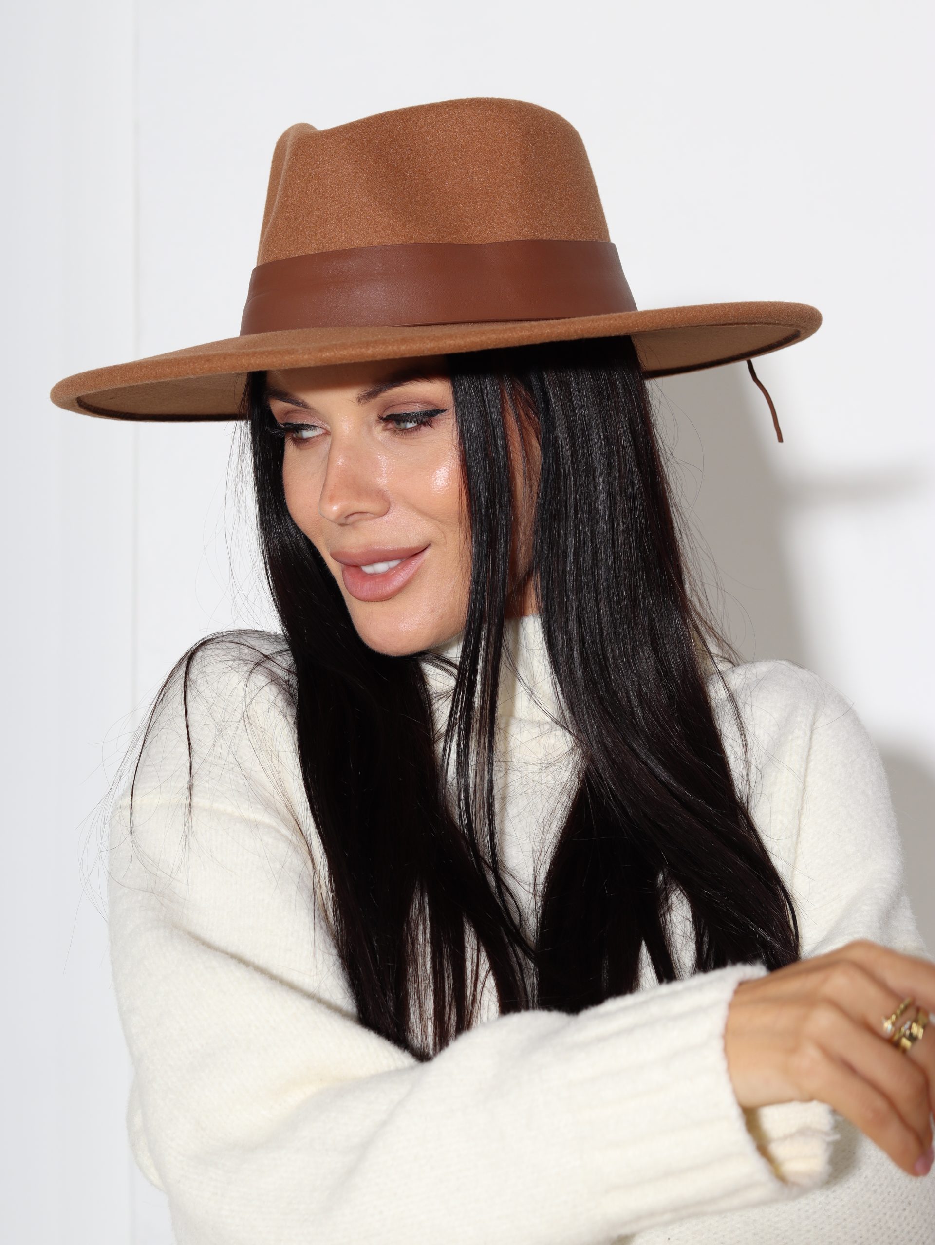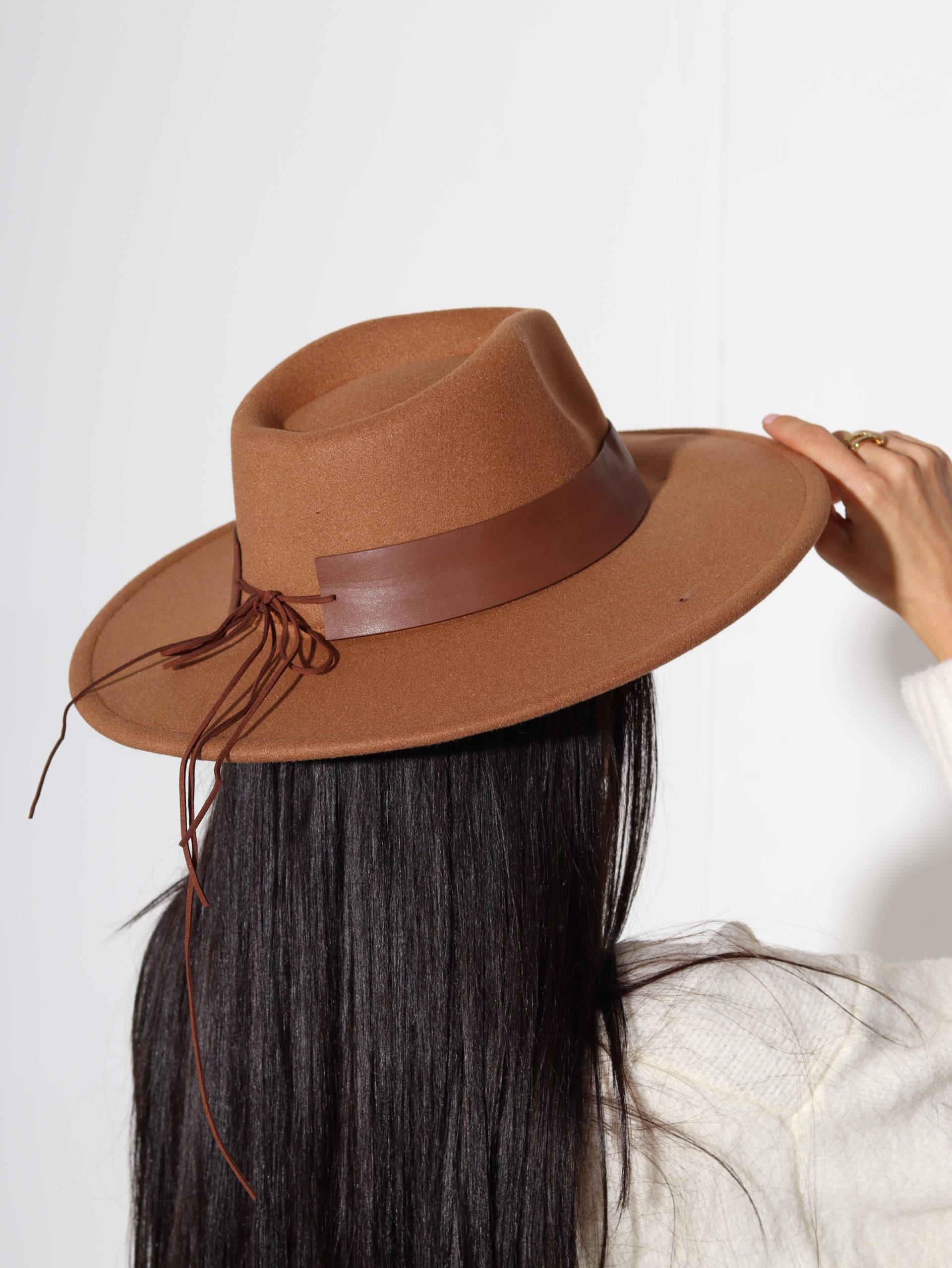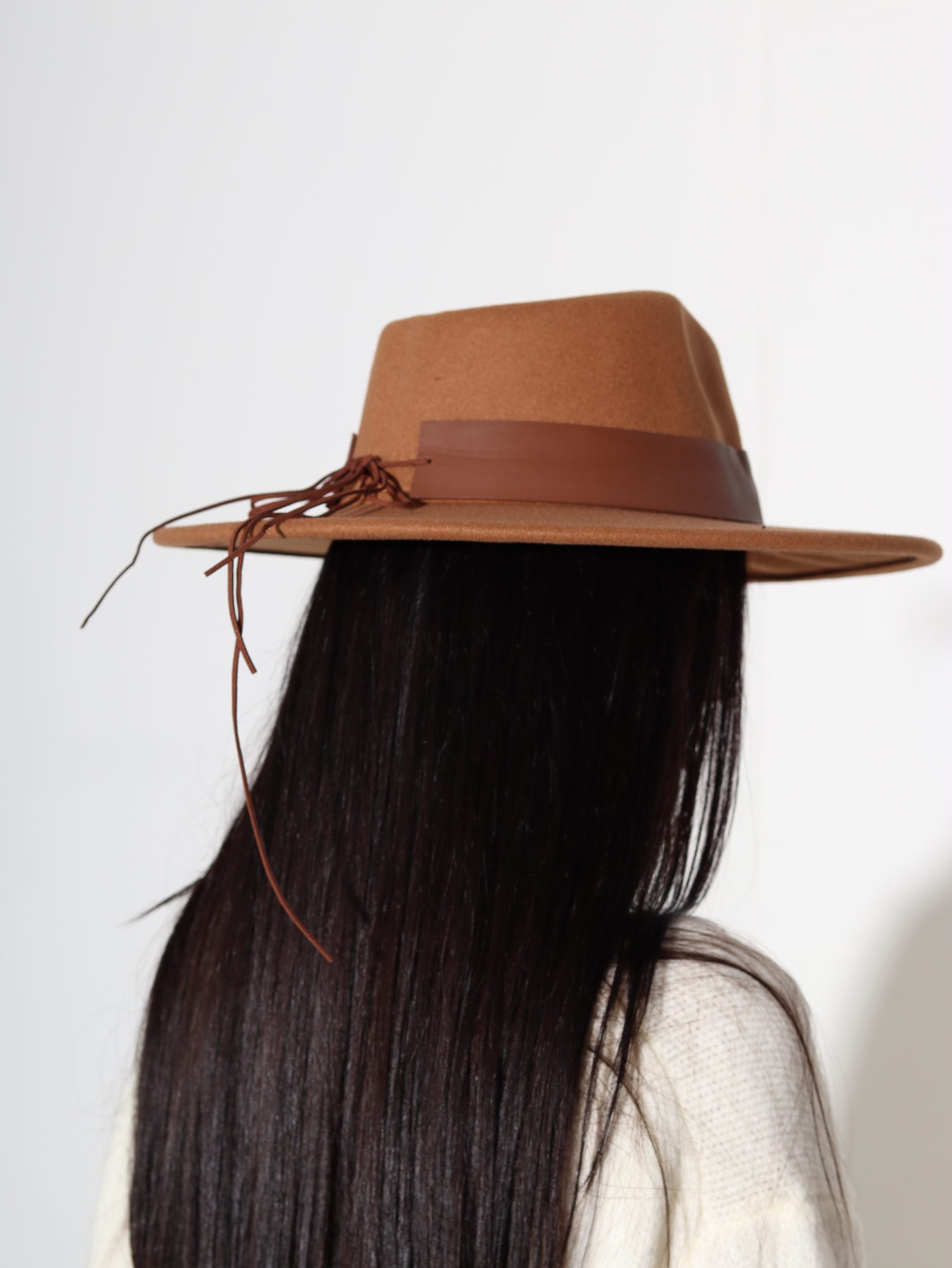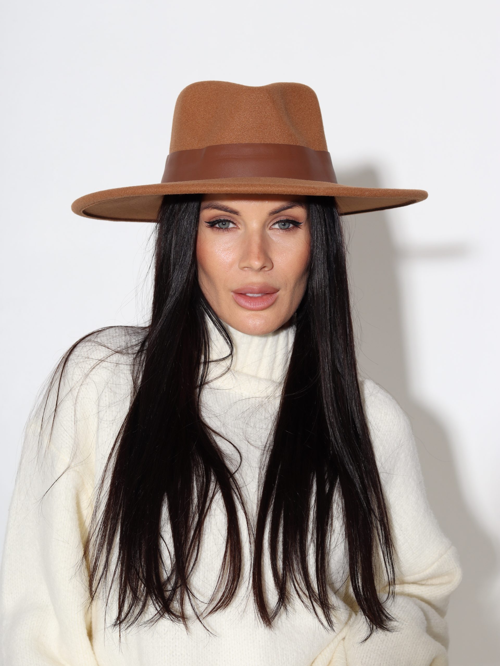 Platmale/ cepure ar platām malām, iekšēji regulējams galvas apkārtmērs, akcents- tumši brūna ādas dekors