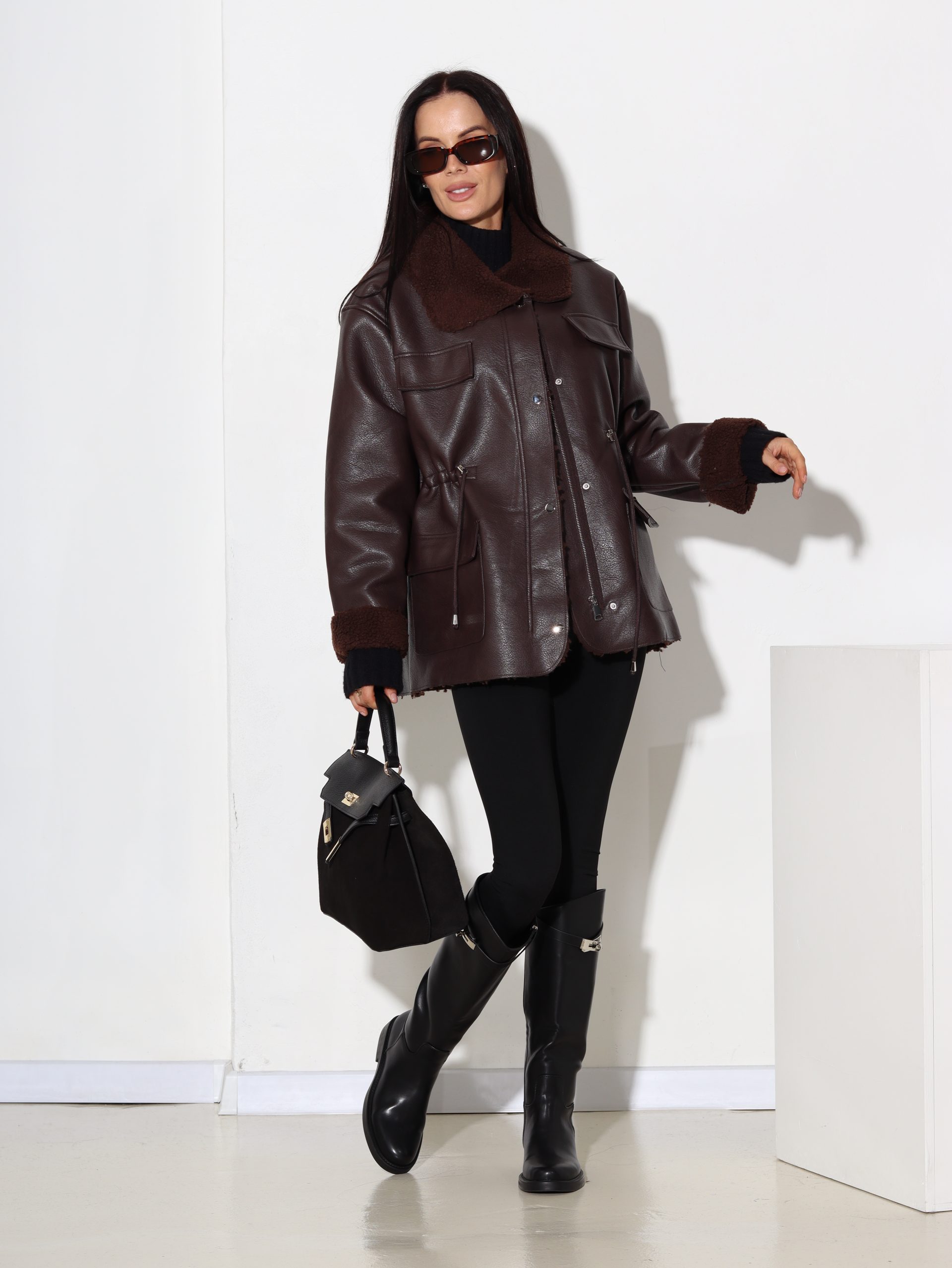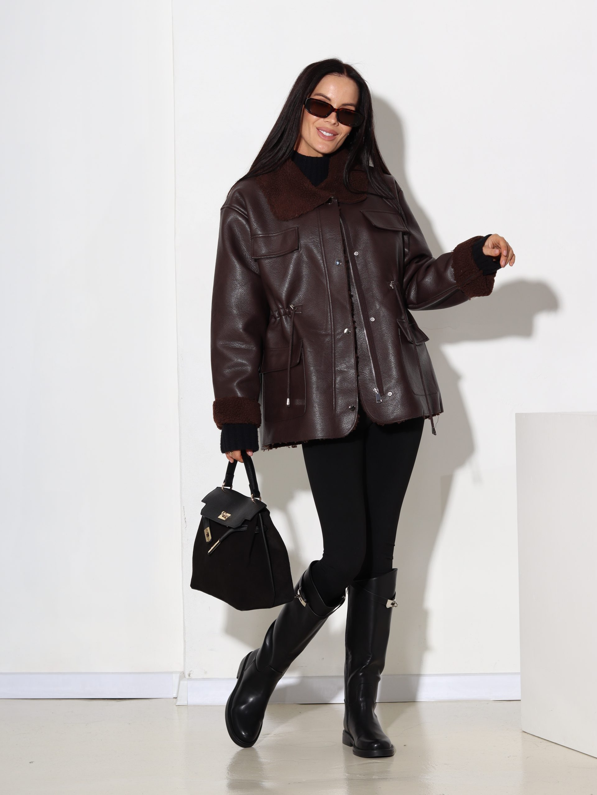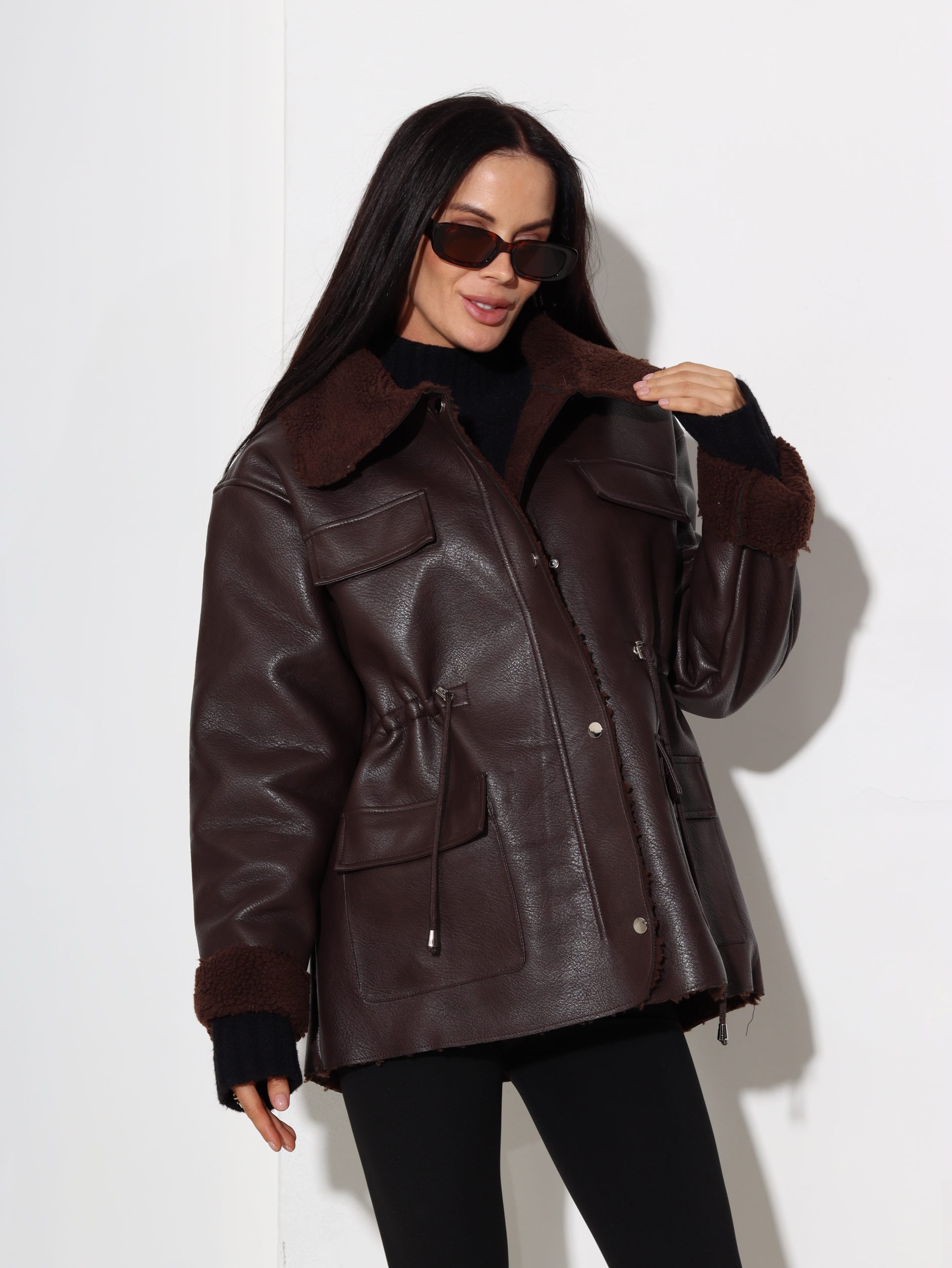 Brūnas krāsas virsjaka no stingras mākslīgās ādas. Virsjakai iekšpusē ir brūnas krāsas siltinājums, vidukļa daļā ir iestrādāta aukliņa savilkšanai.