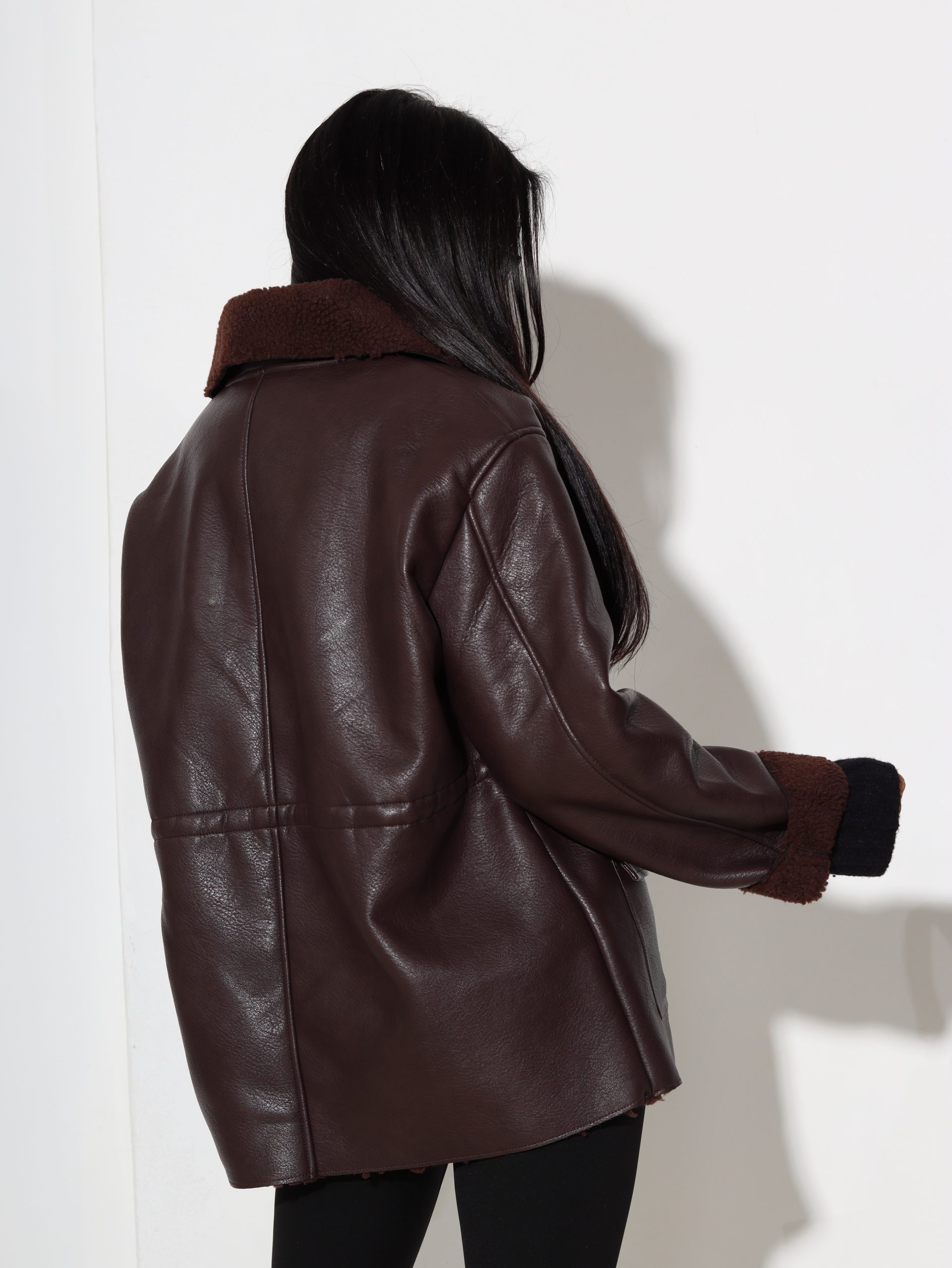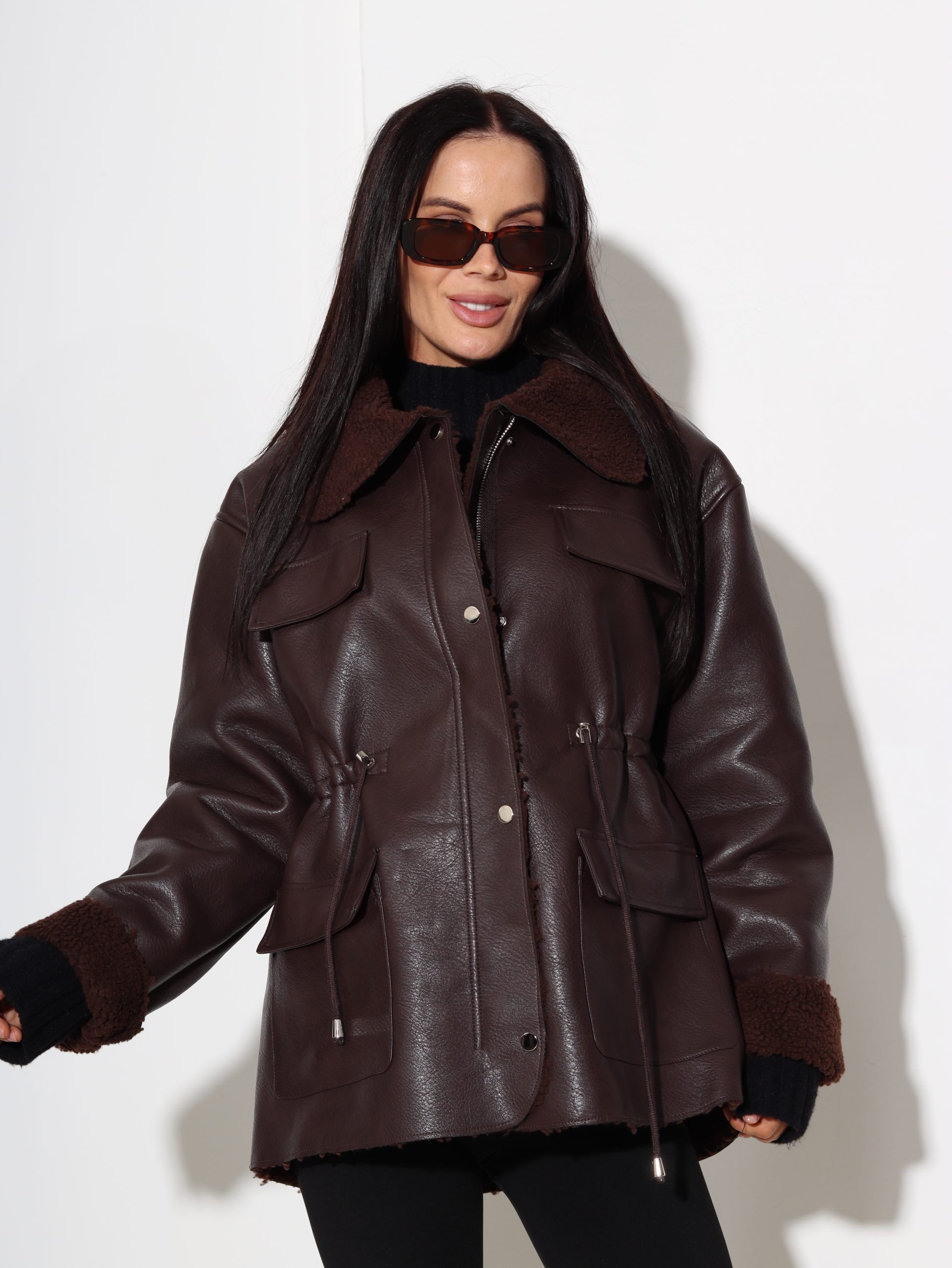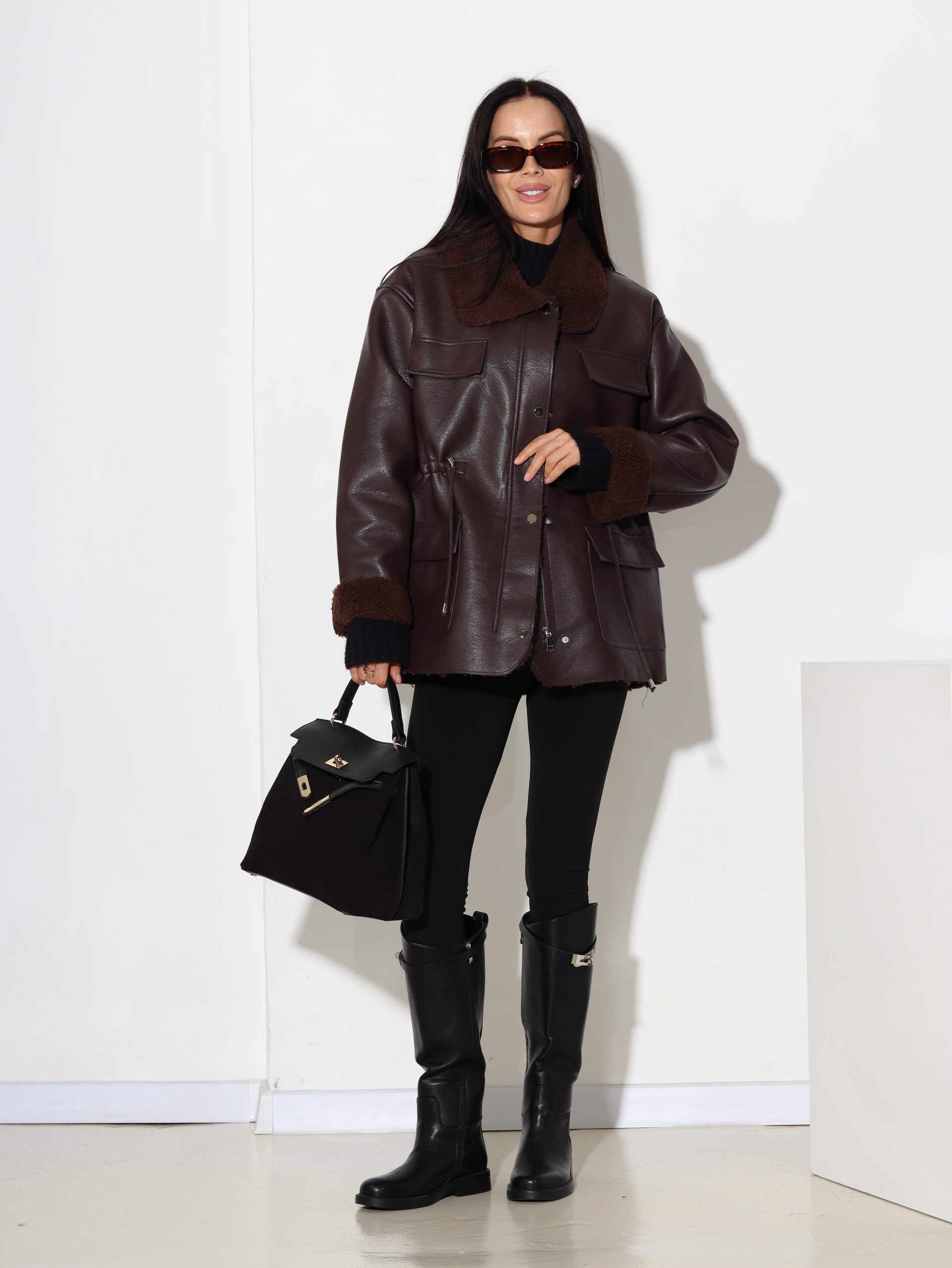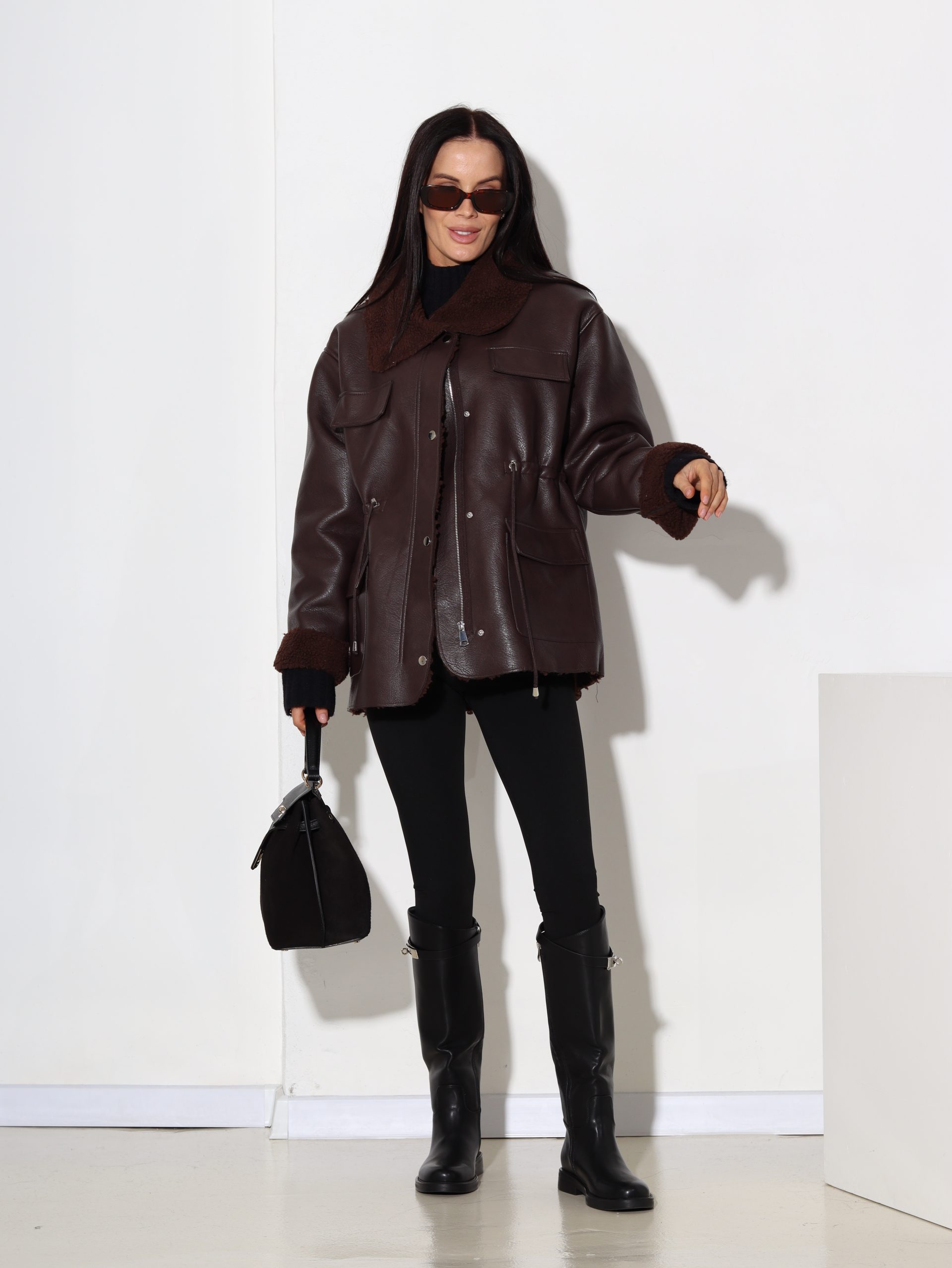 Brūnas krāsas virsjaka no stingras mākslīgās ādas. Virsjakai iekšpusē ir brūnas krāsas siltinājums, vidukļa daļā ir iestrādāta aukliņa savilkšanai.