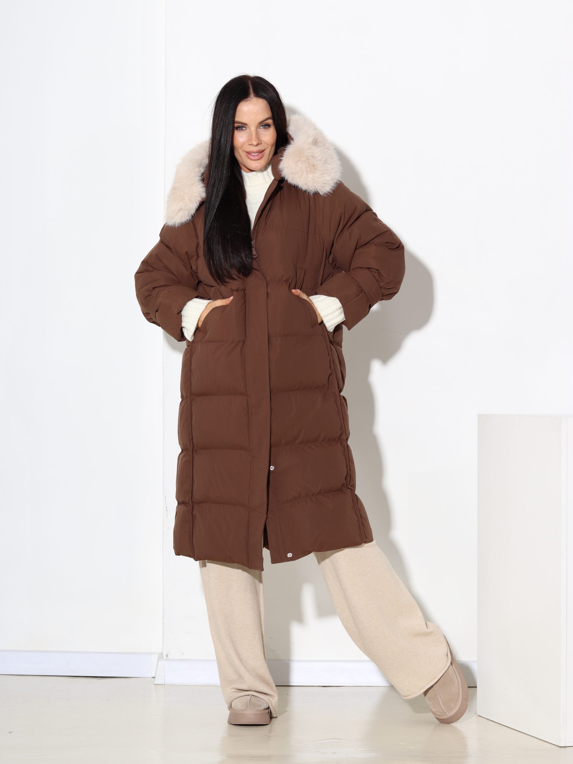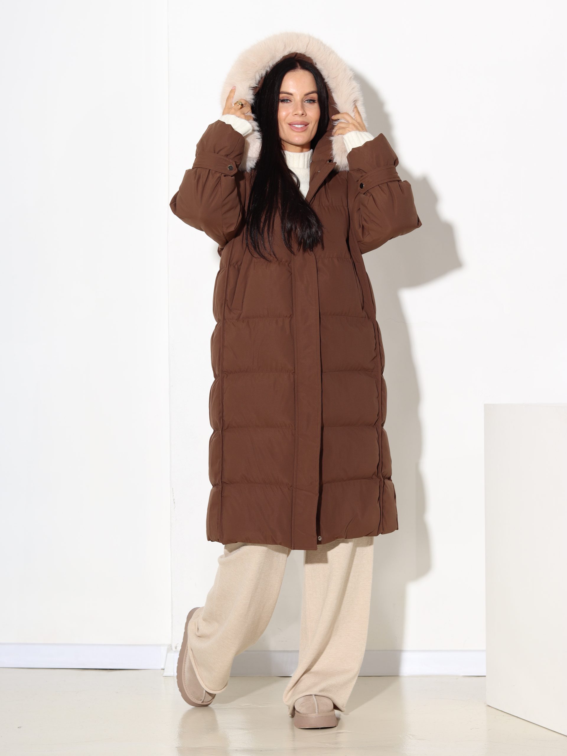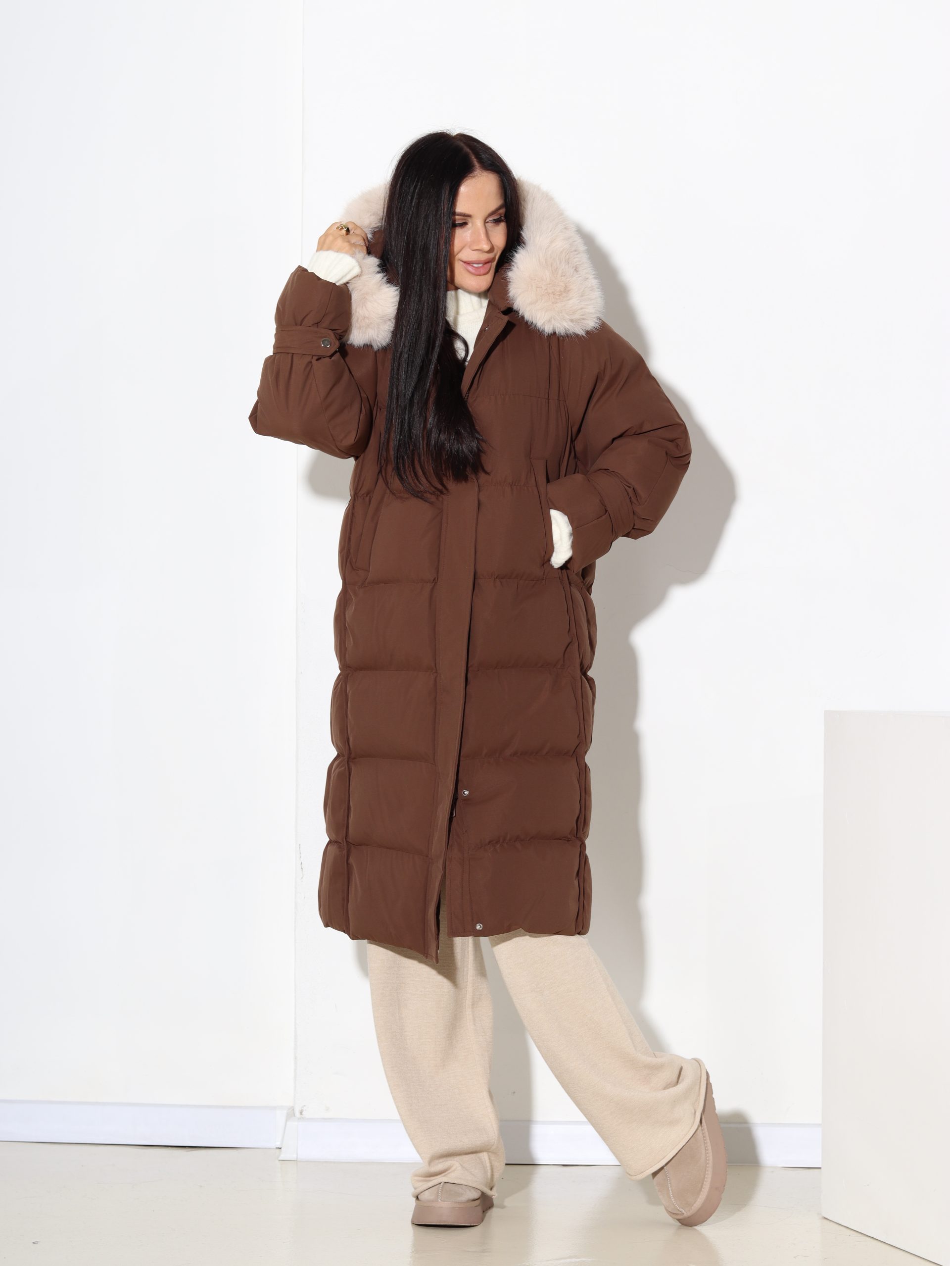 Brūna, Midi, virsjaka ar gaišu apkakles pūciņu un kapuci – 17076