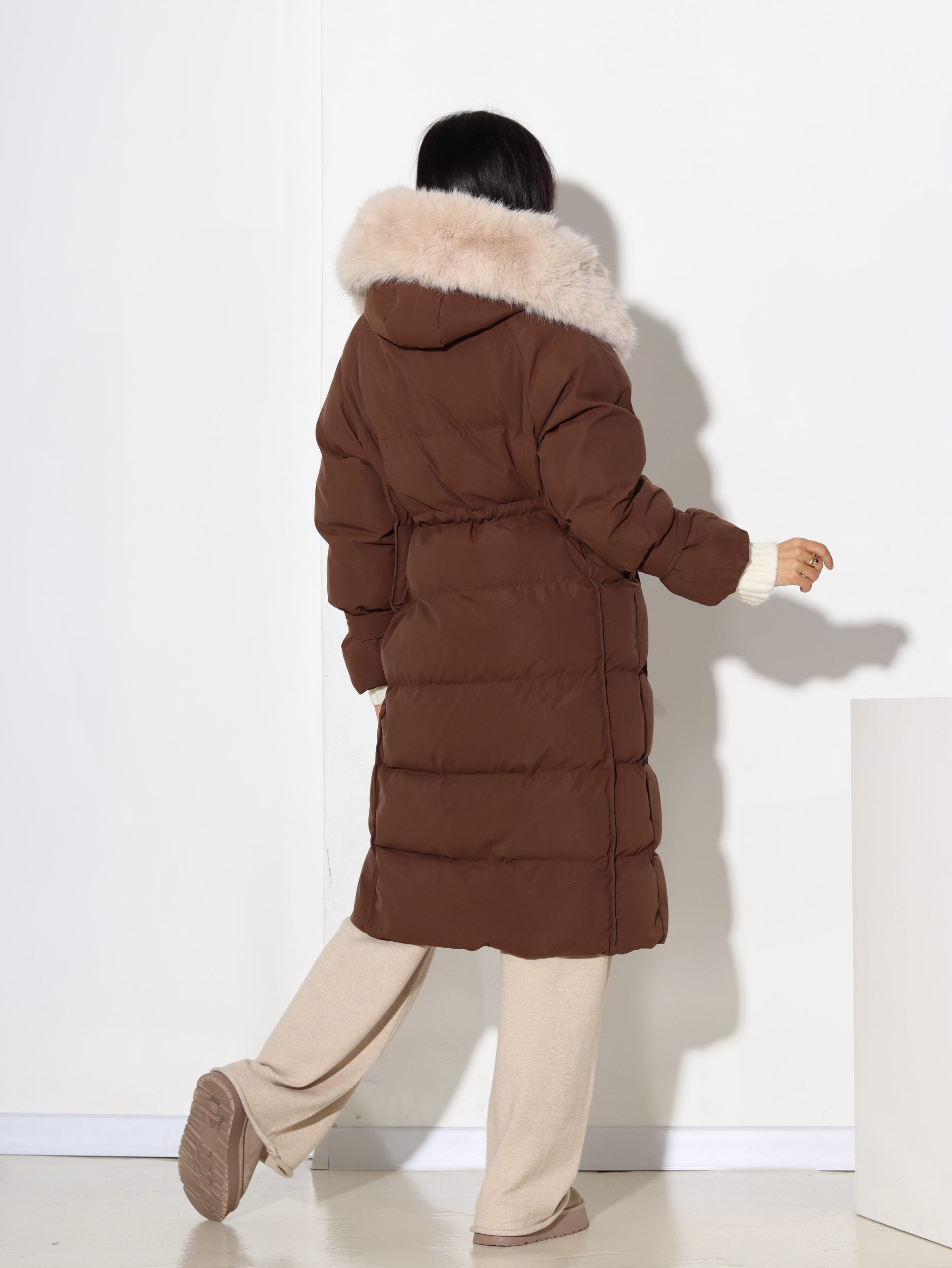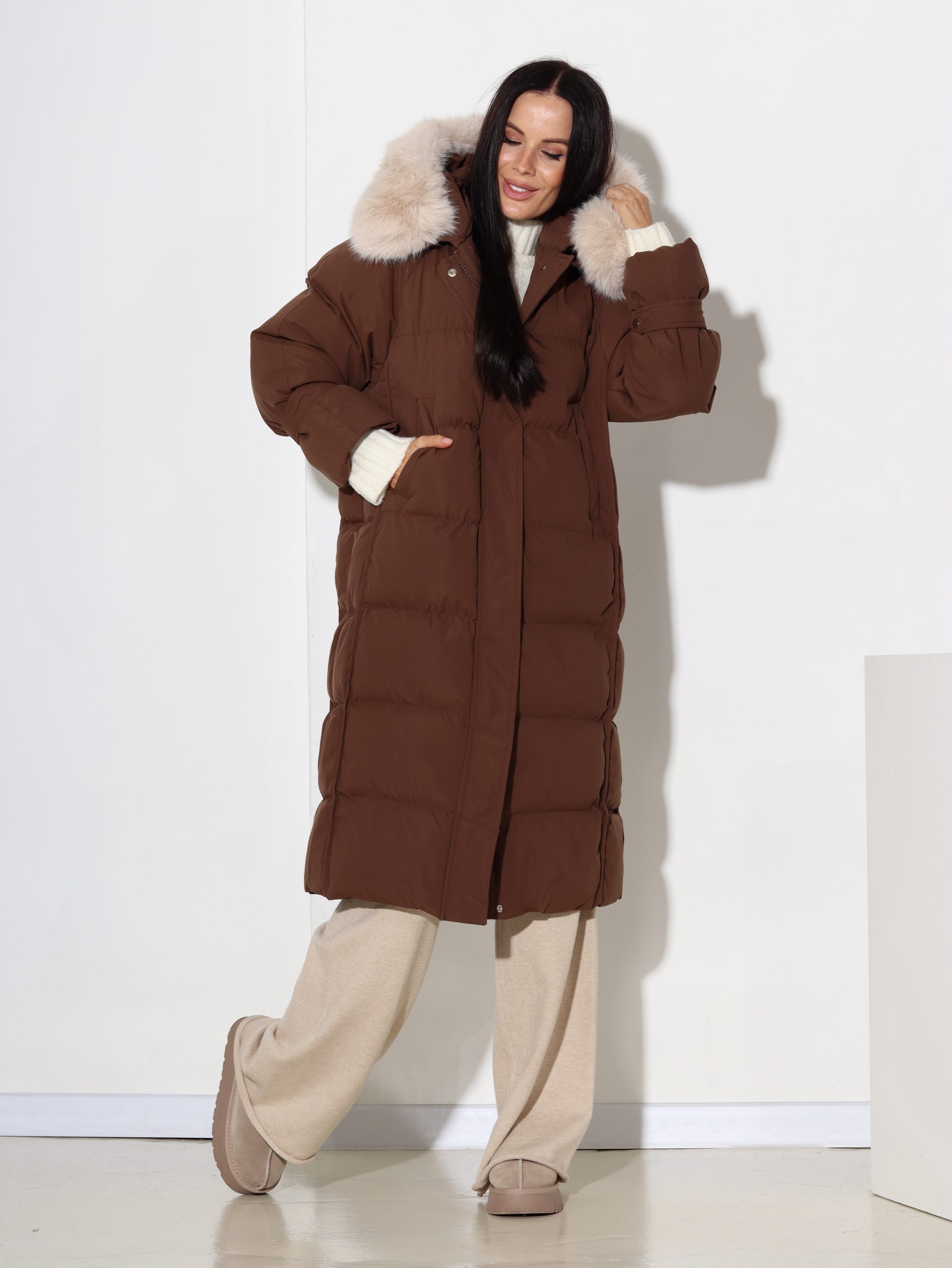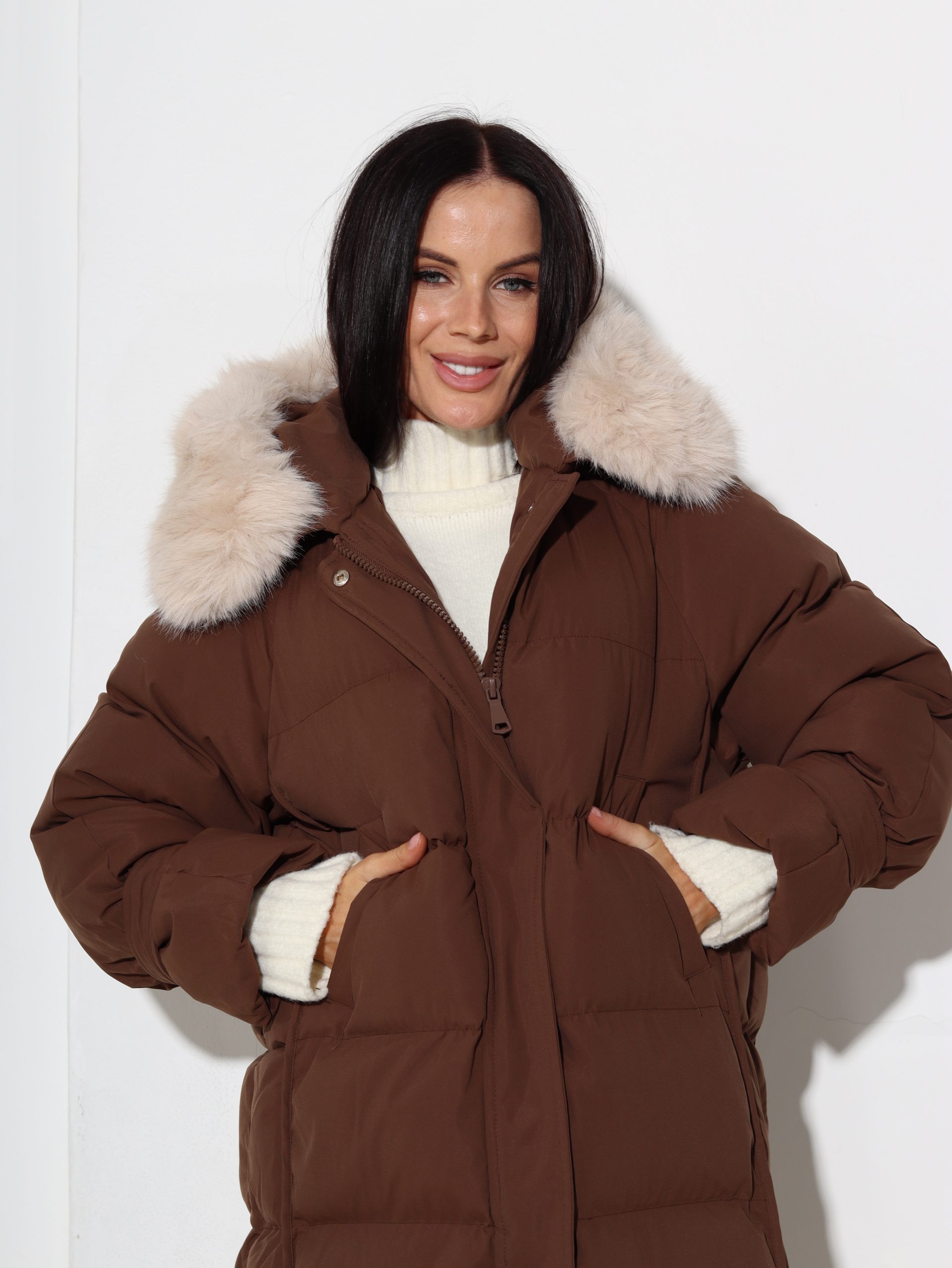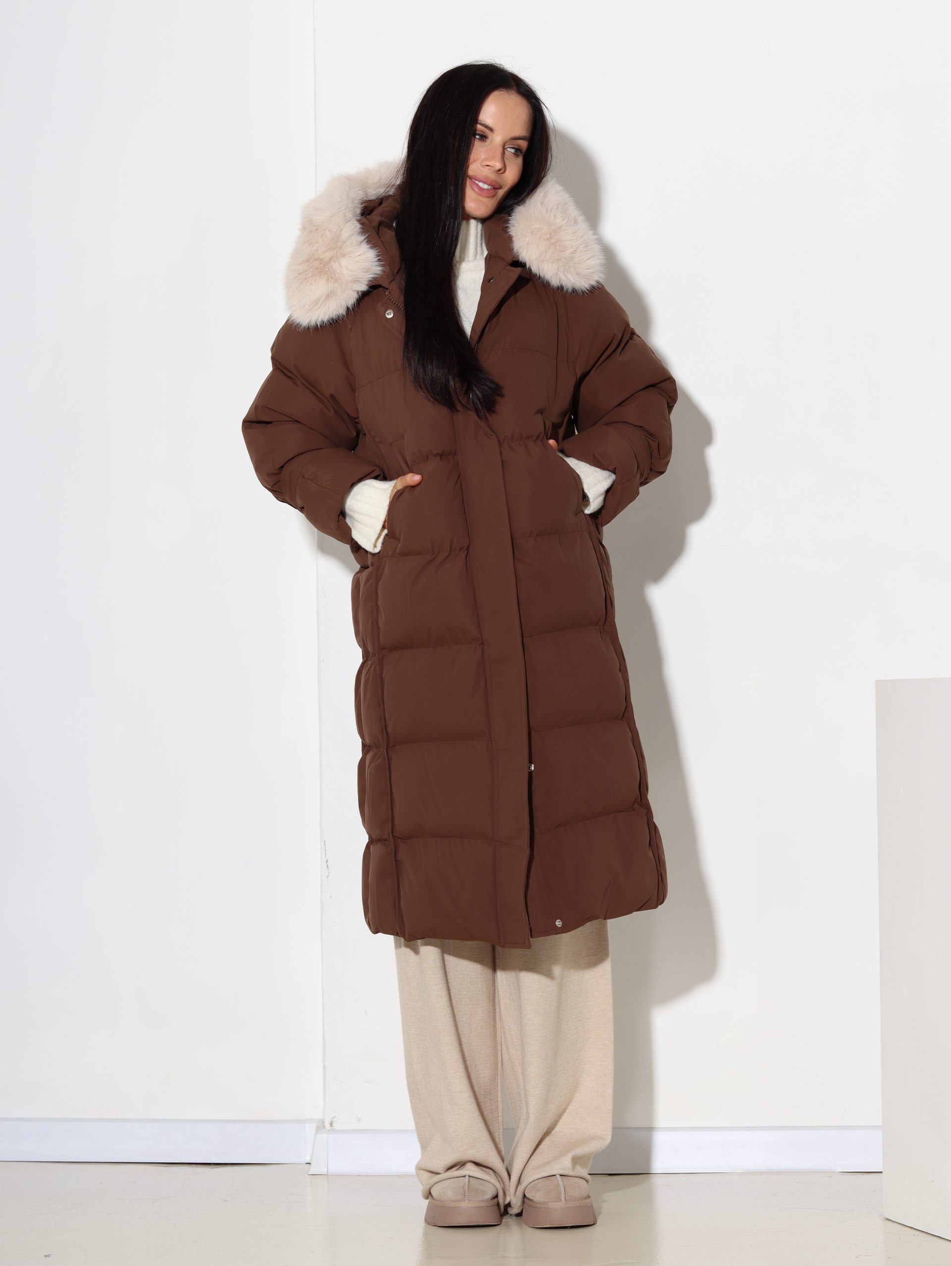 Brūna, Midi, virsjaka ar gaišu apkakles pūciņu un kapuci – 17076