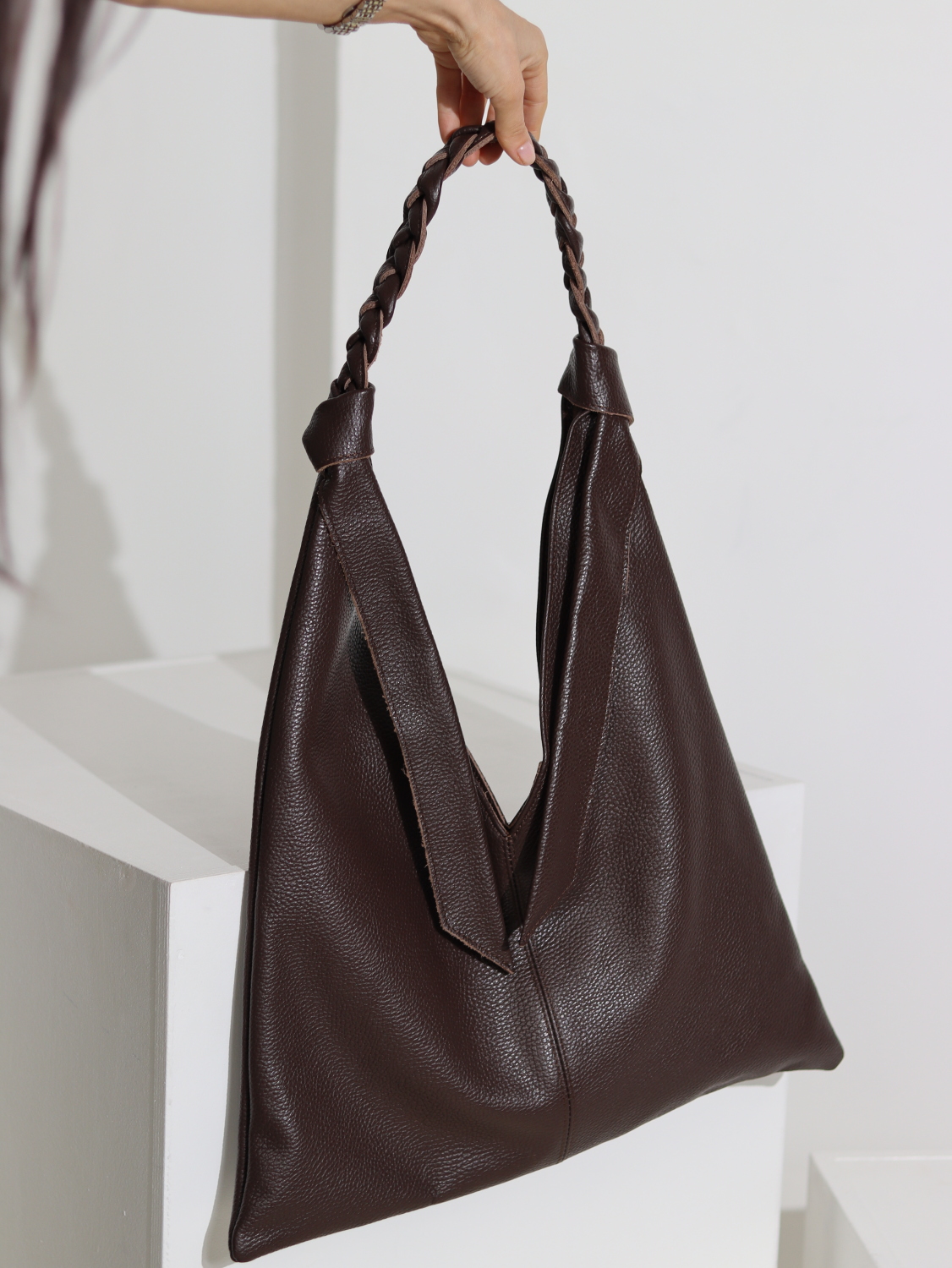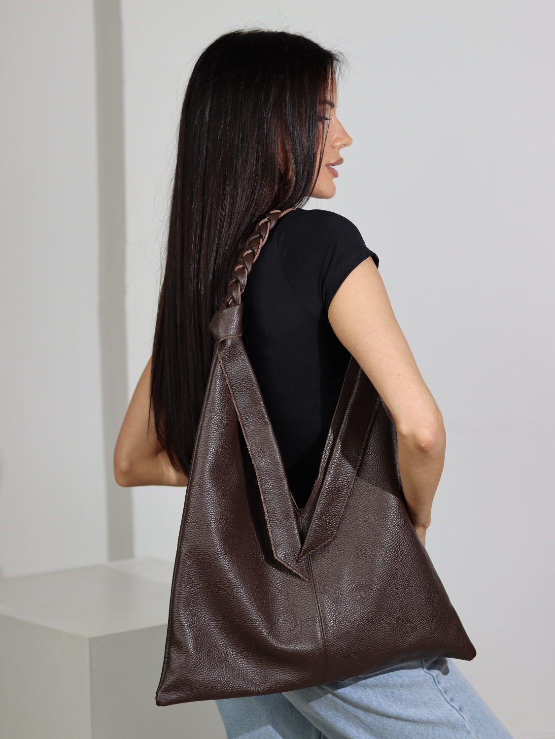 Brūna plāna d/a soma ar pītu ādas rokturi – 15760