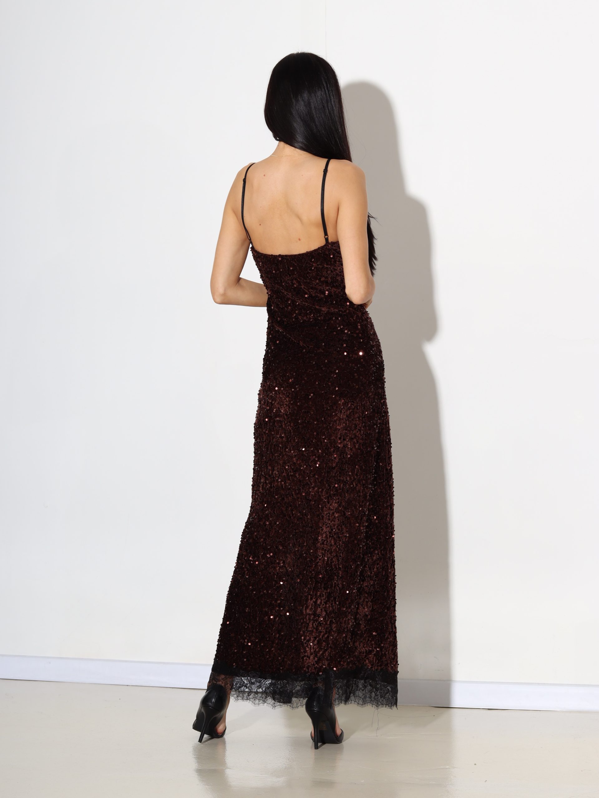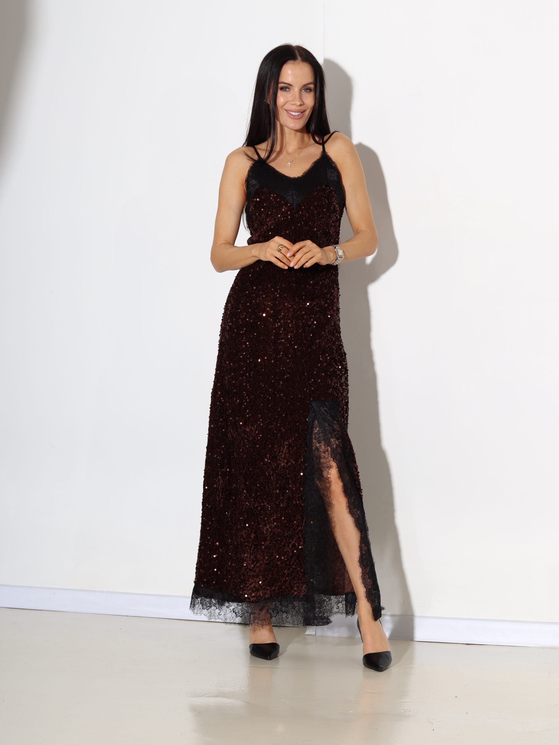Brūna samta kleita ar gliteriem un mežģīni – 17532