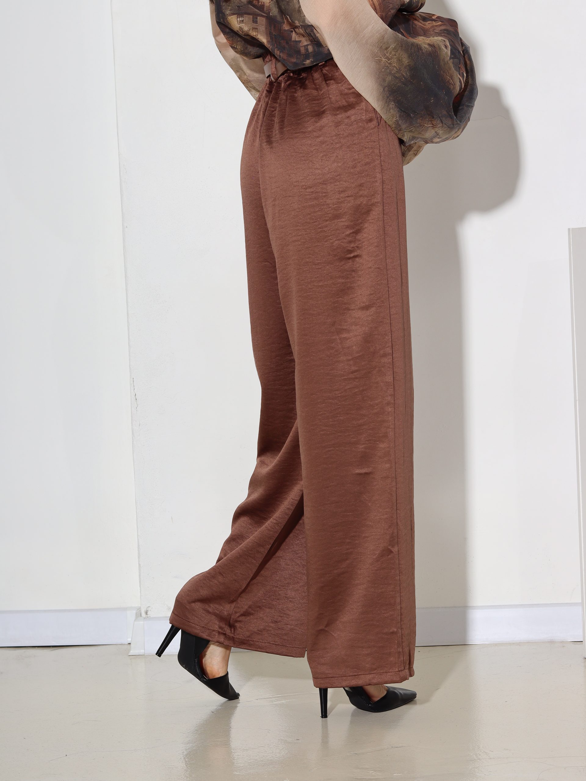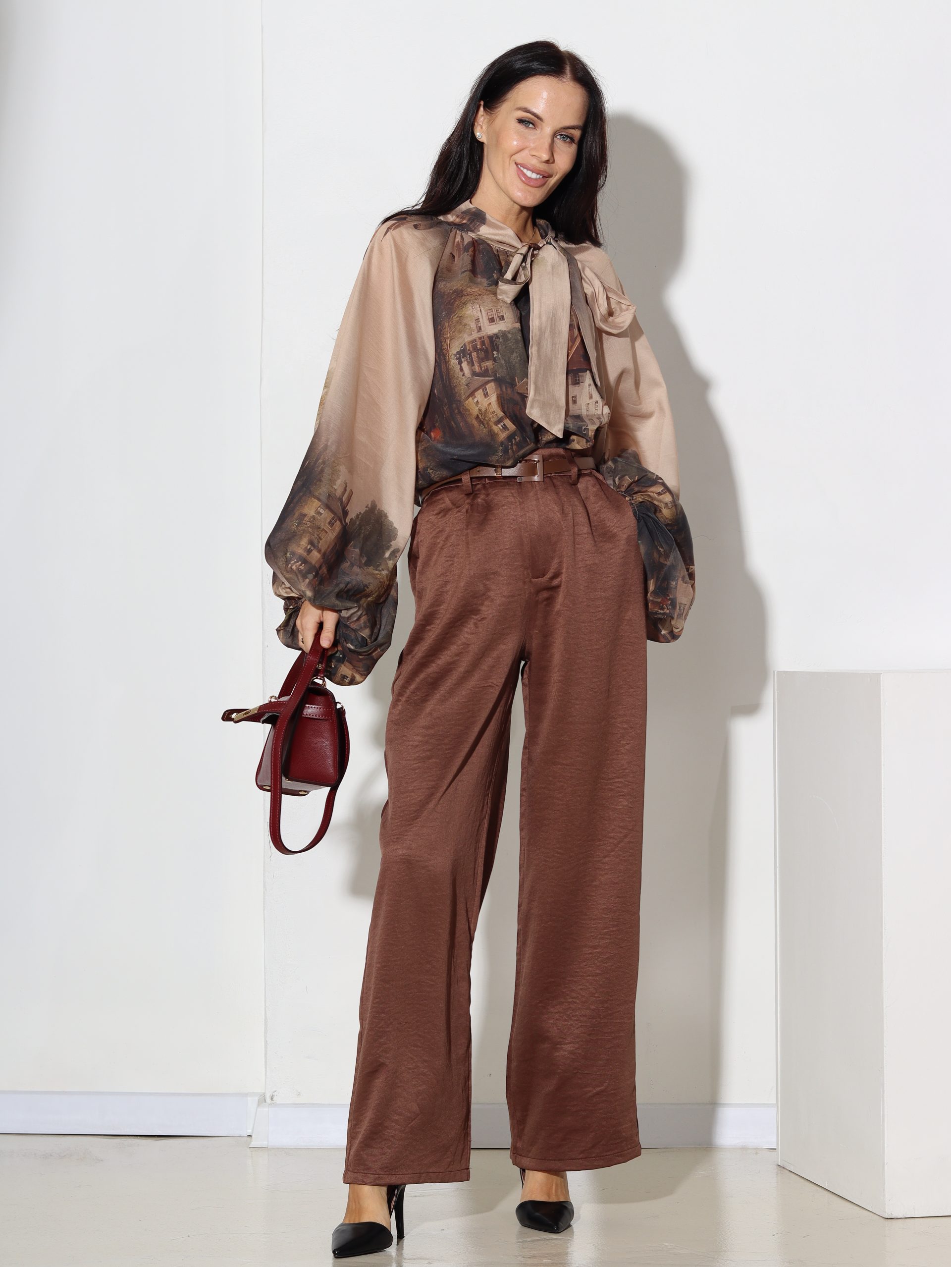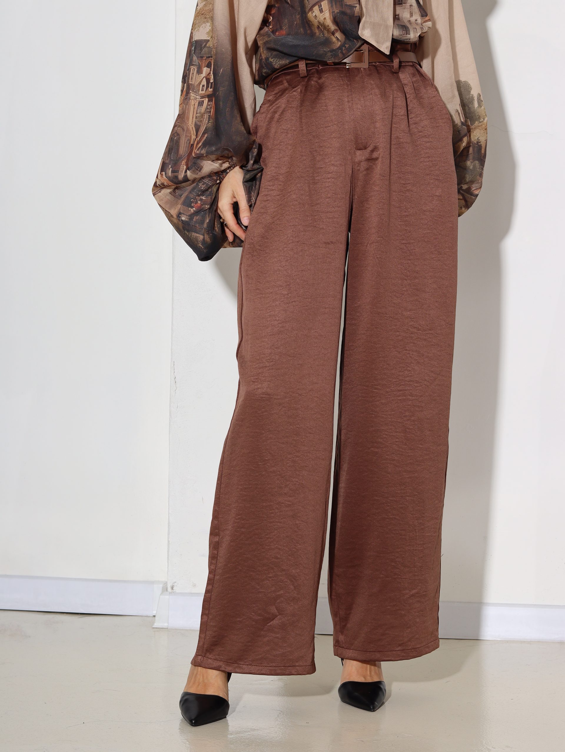 Brūnas, spīdīga audums, klasiskas bikses ar jostiņu – 16844
