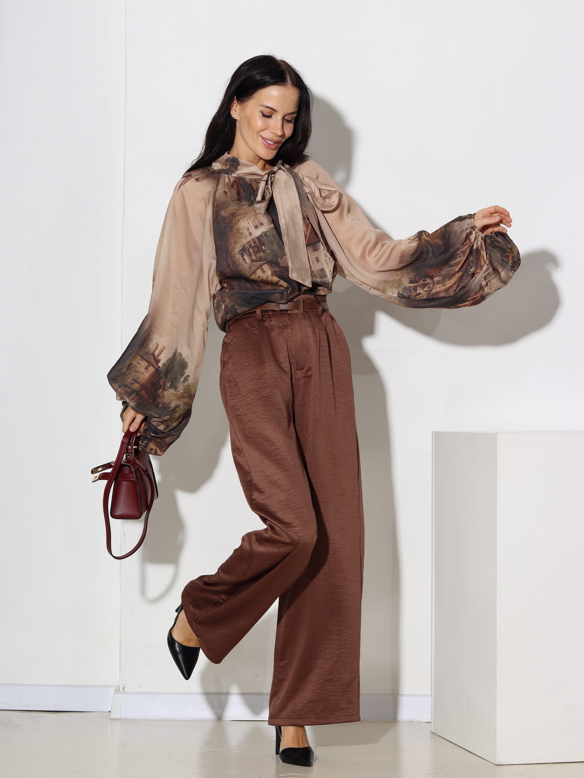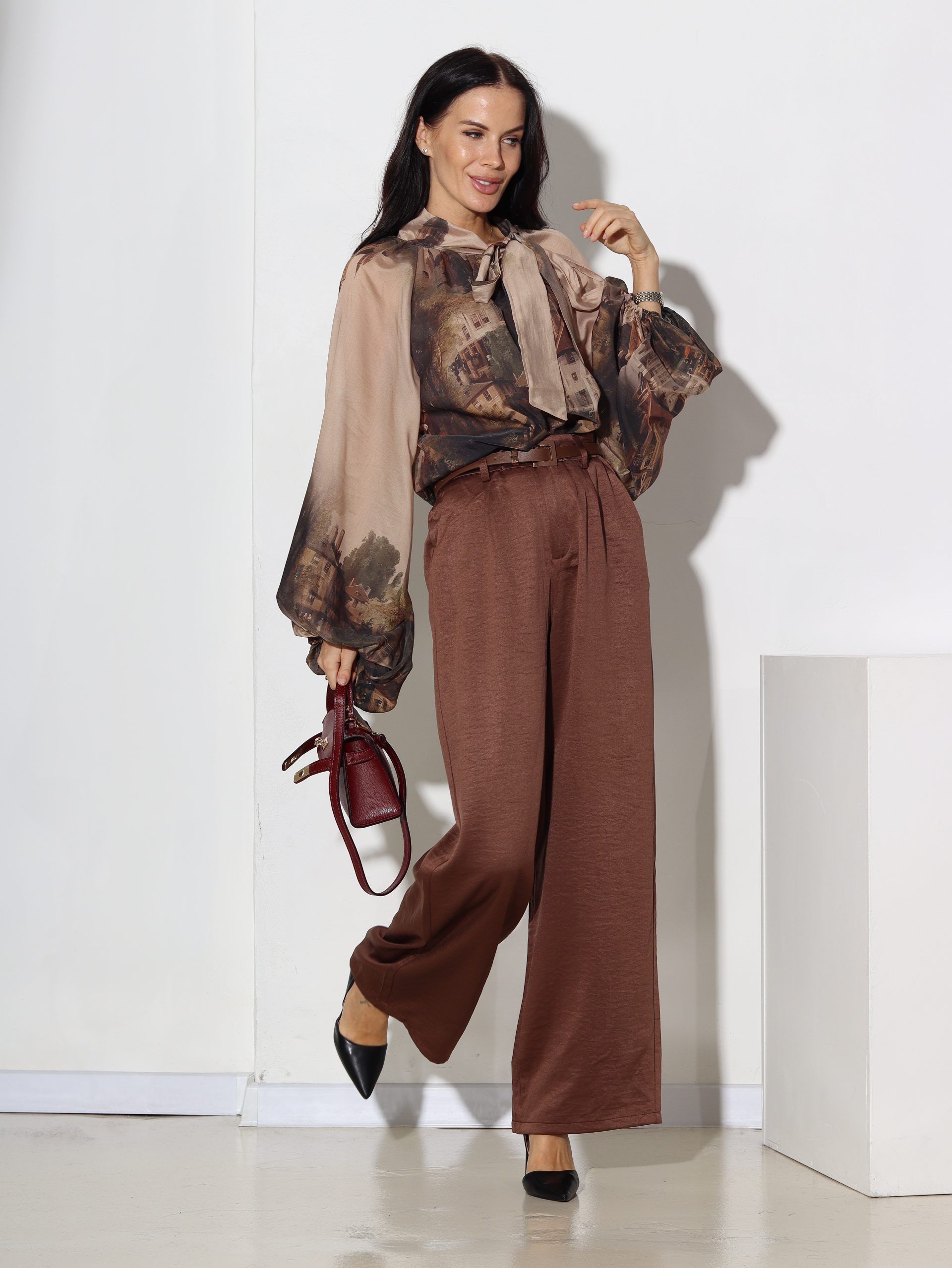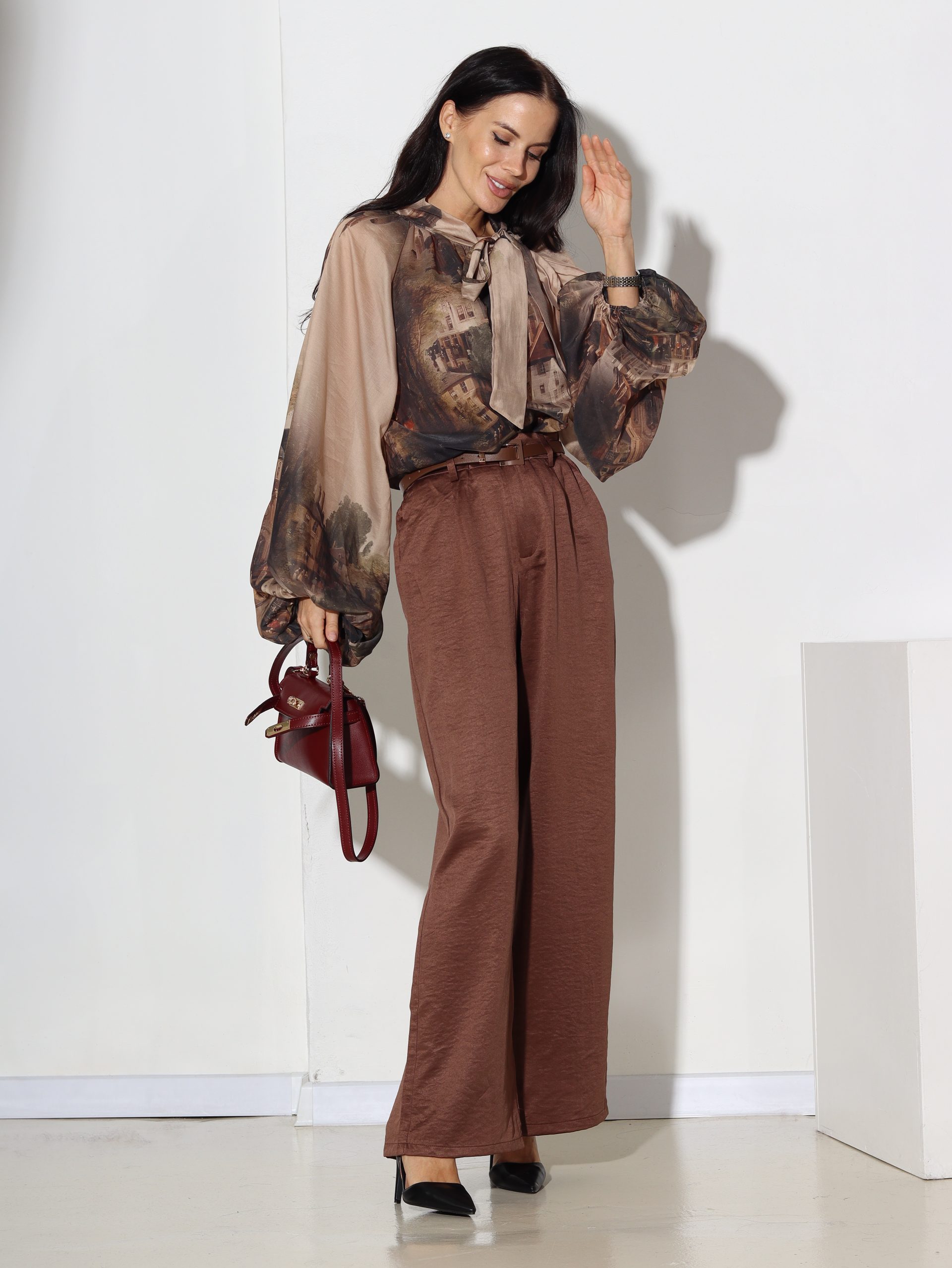 Brūnas, spīdīga audums, klasiskas bikses ar jostiņu – 16844