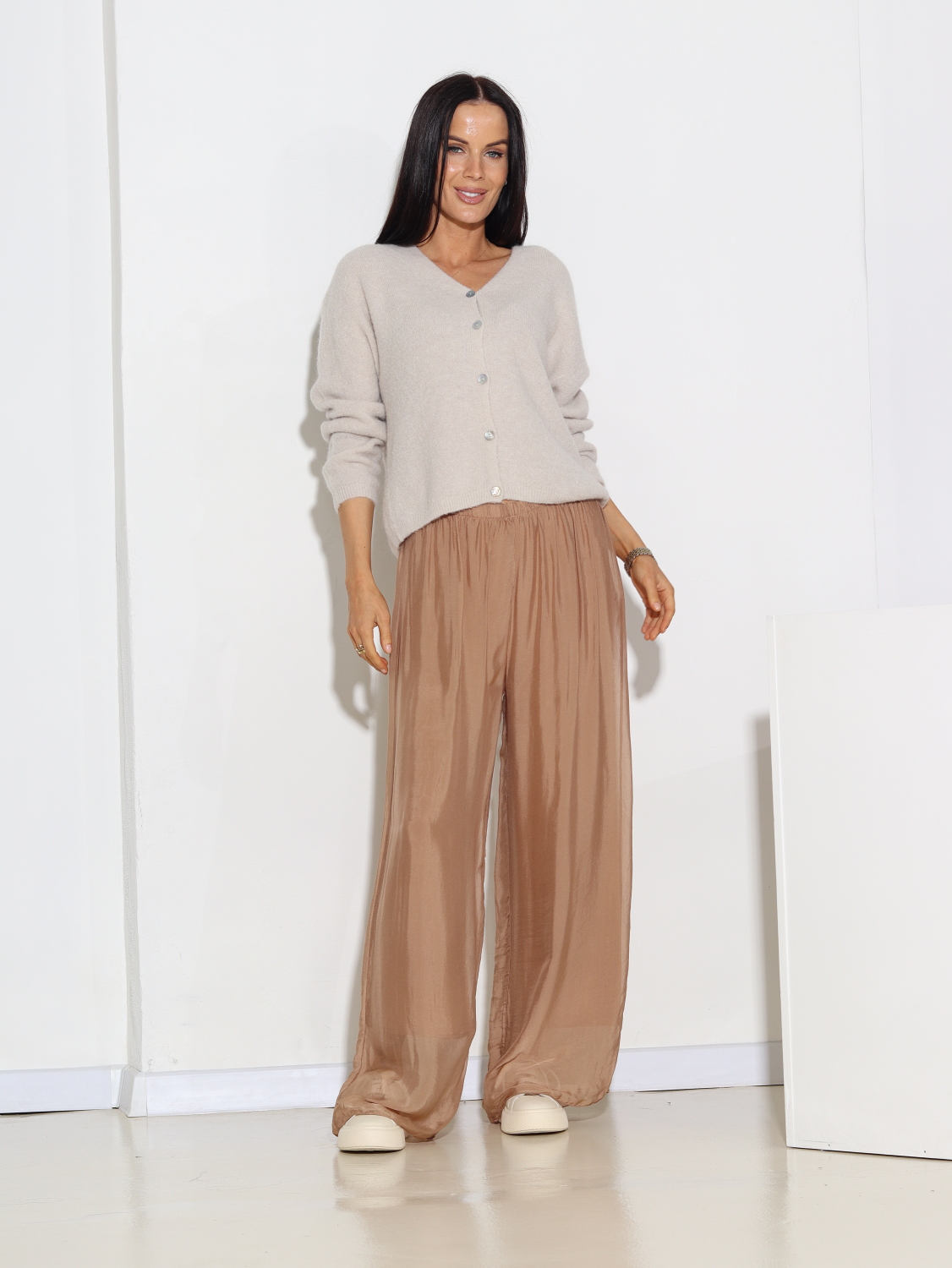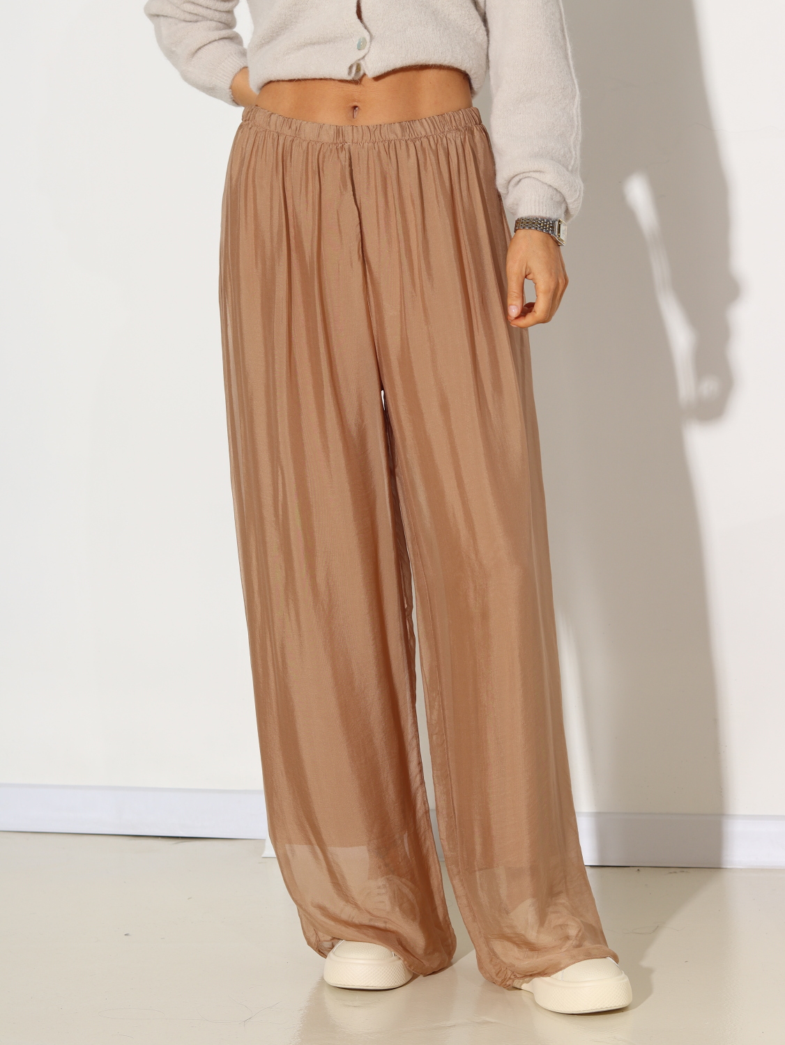 Vieglas, brīvi krītošas, vasarīgas bikses ar satīna sastāvu audumā. Bikses ar taisna, paplatināta piegriezuma starām, biksēm ir oderi. Biksēm vidukļa daļā ir iestrādāta gumija
