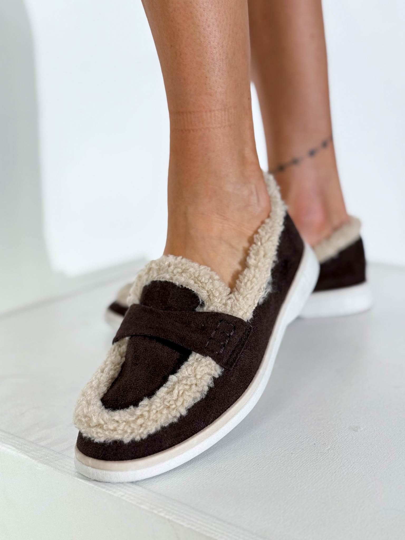 Brūnas/šoko zemas kurpītes ar pūciņas akcentu – 16043