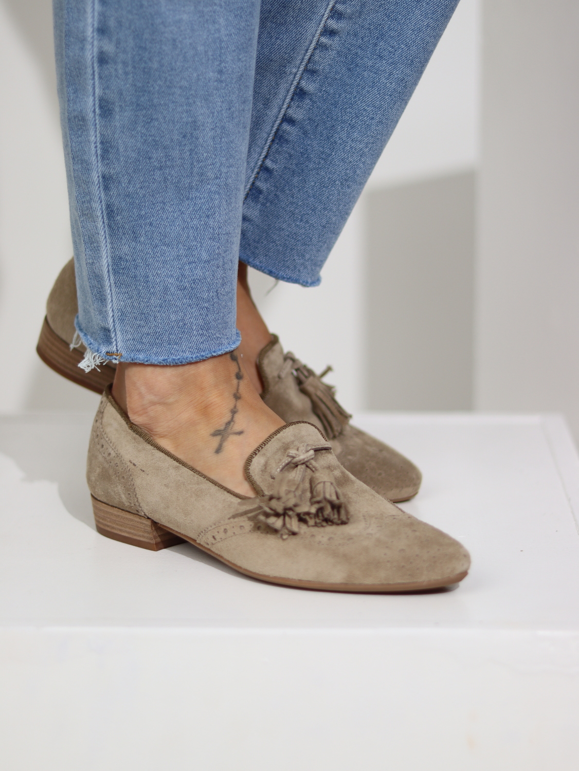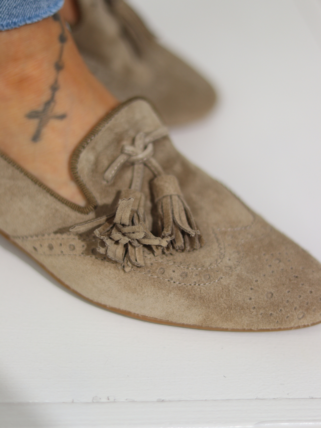 Dabīgās zamšādas kurpītes/ mokasīni slēgtas uz mini, stabilu papēdīti, smails purngals, augšpusē barkstiņu akcents