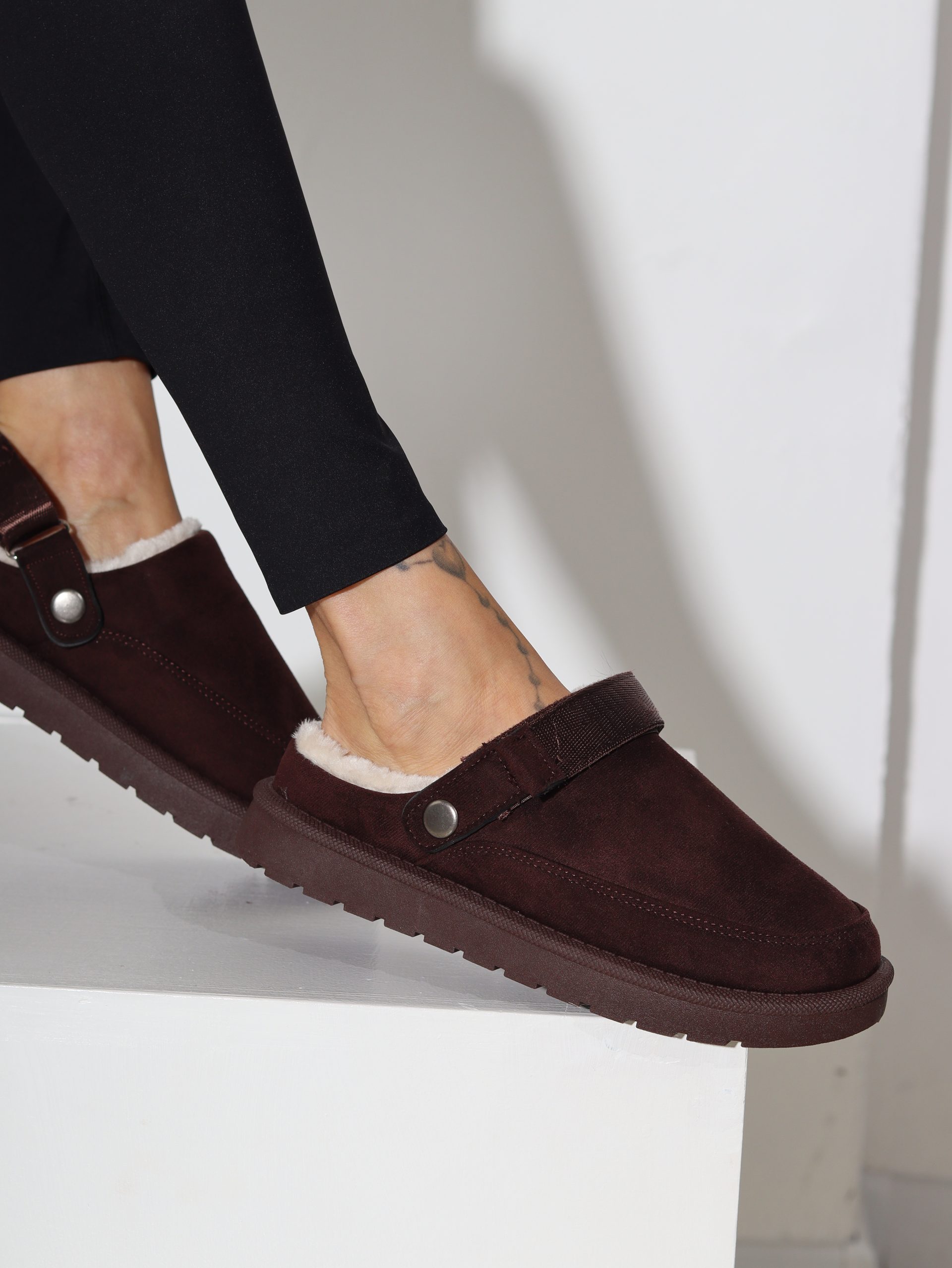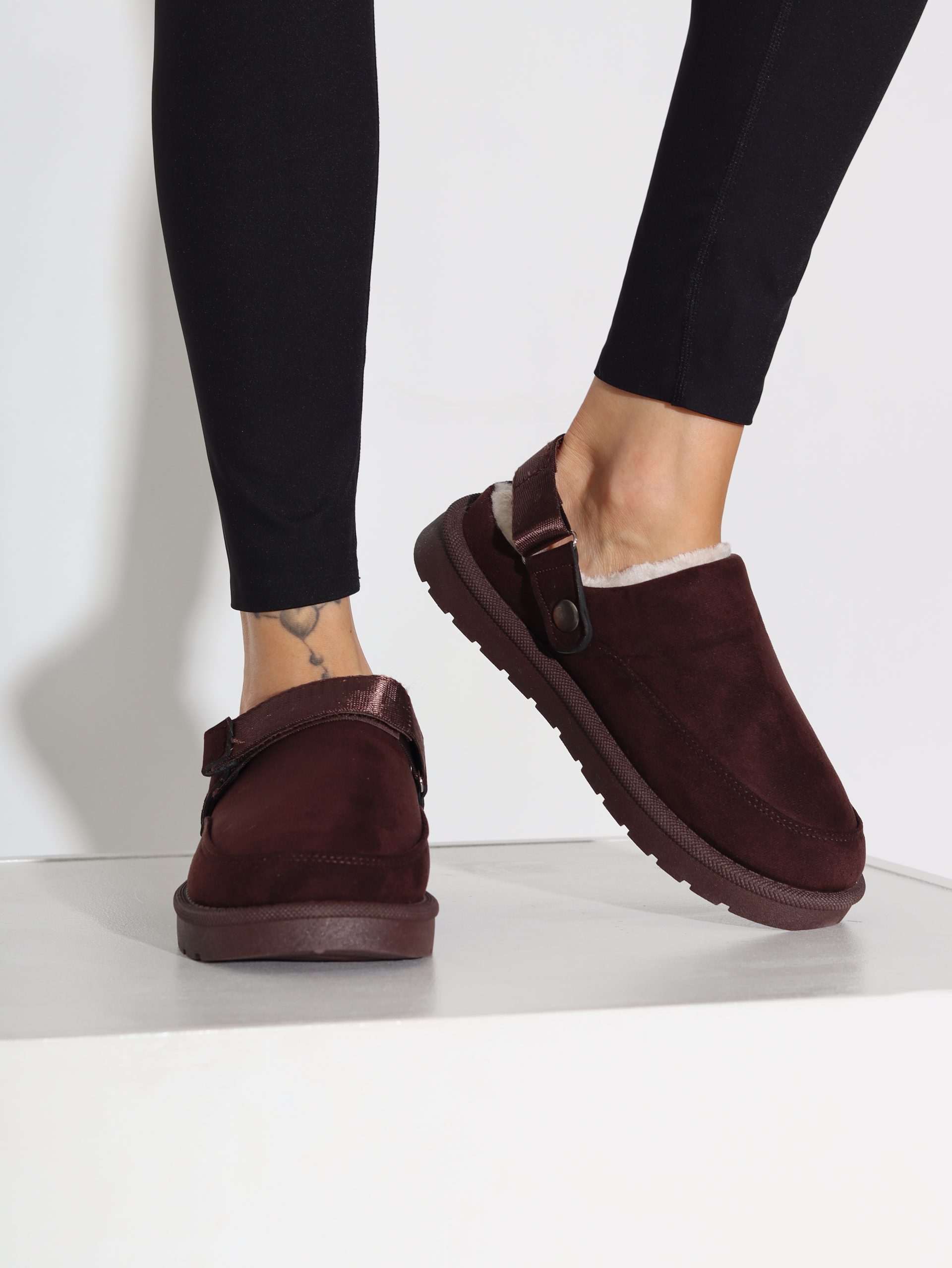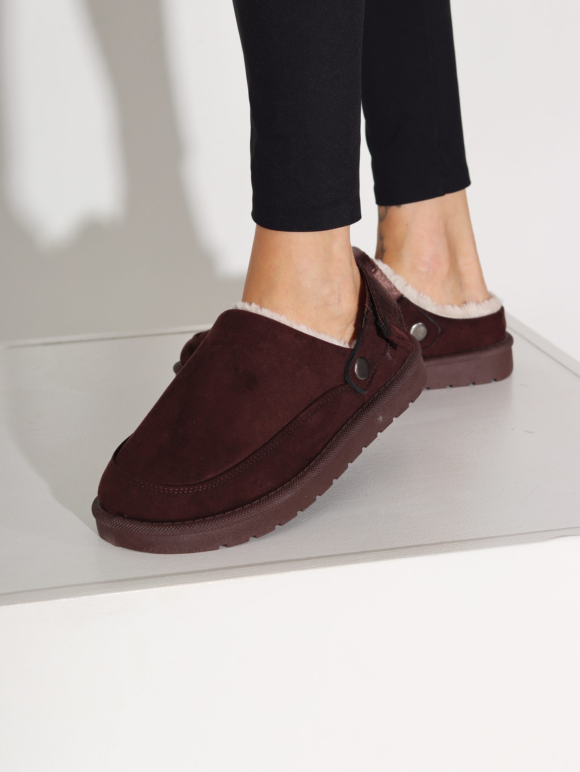 Mākslīgās zamšādas apavi ar slēgtu purngalu, vaļēja papēža daļa, iekšpuse siltināta ar pūciņu, zema zolīte un regulējama siksniņa papēža daļā.