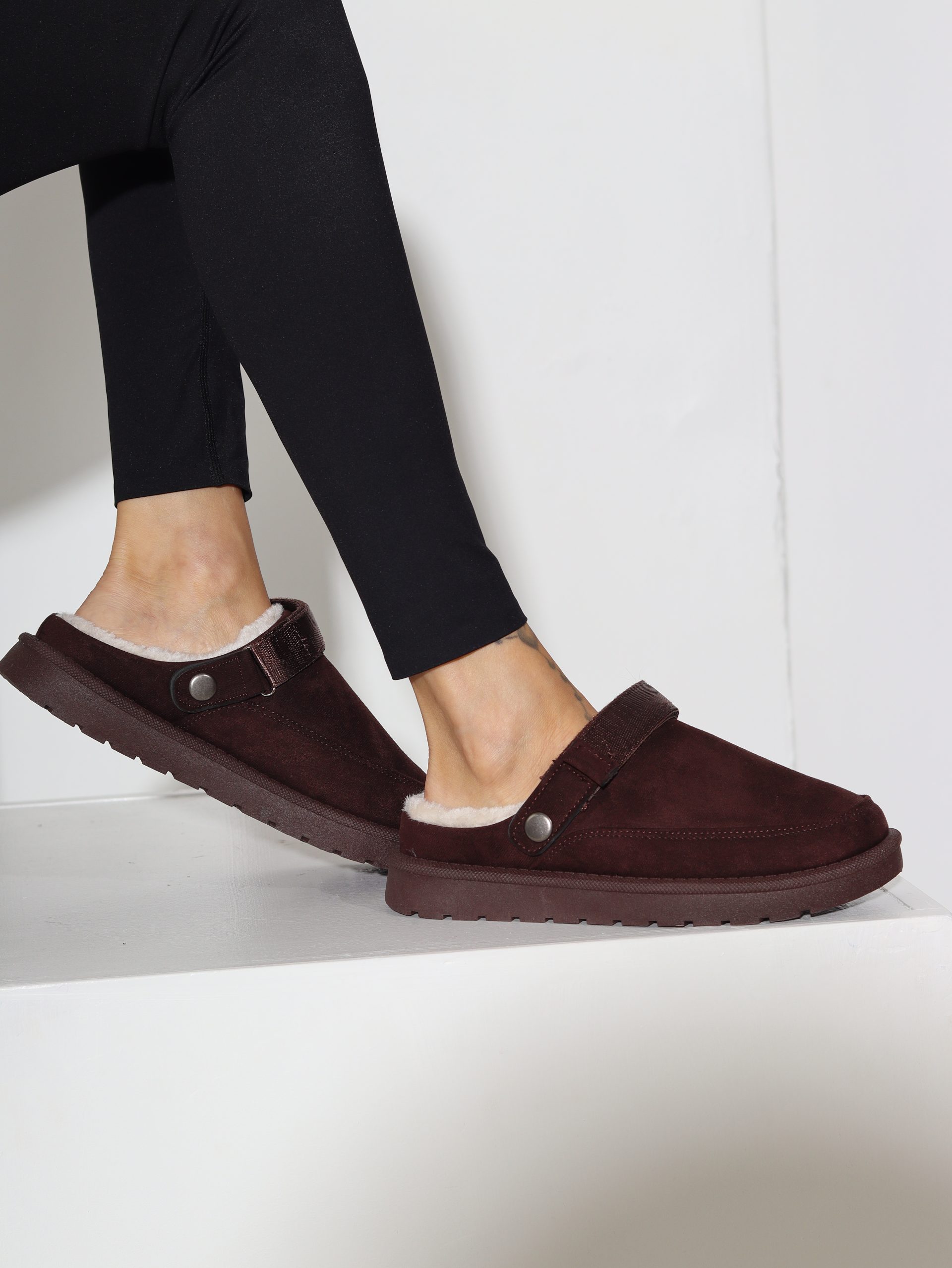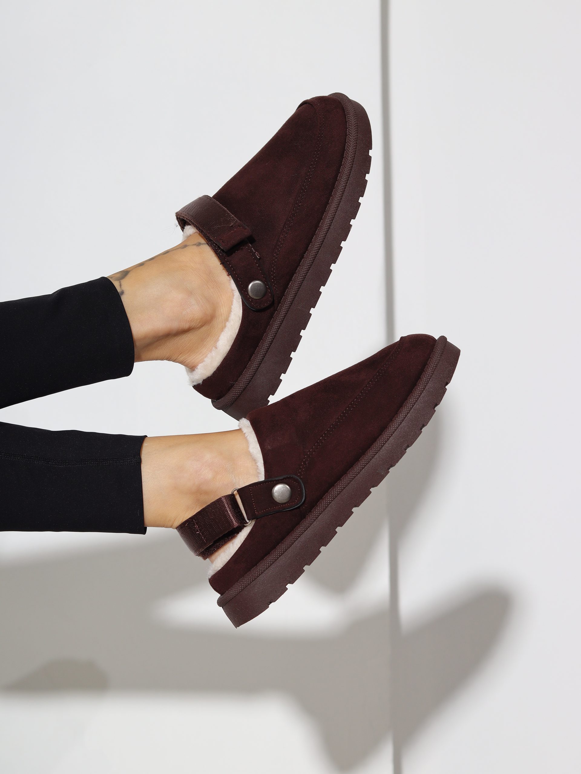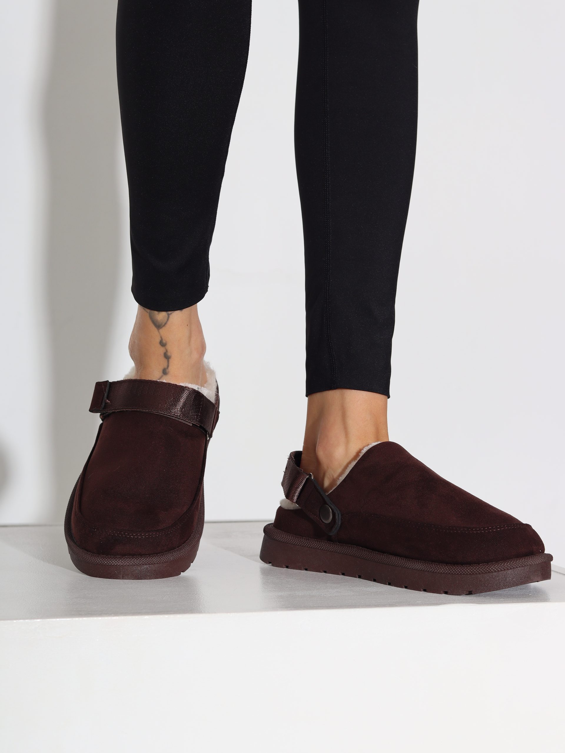 Mākslīgās zamšādas apavi ar slēgtu purngalu, vaļēja papēža daļa, iekšpuse siltināta ar pūciņu, zema zolīte un regulējama siksniņa papēža daļā.