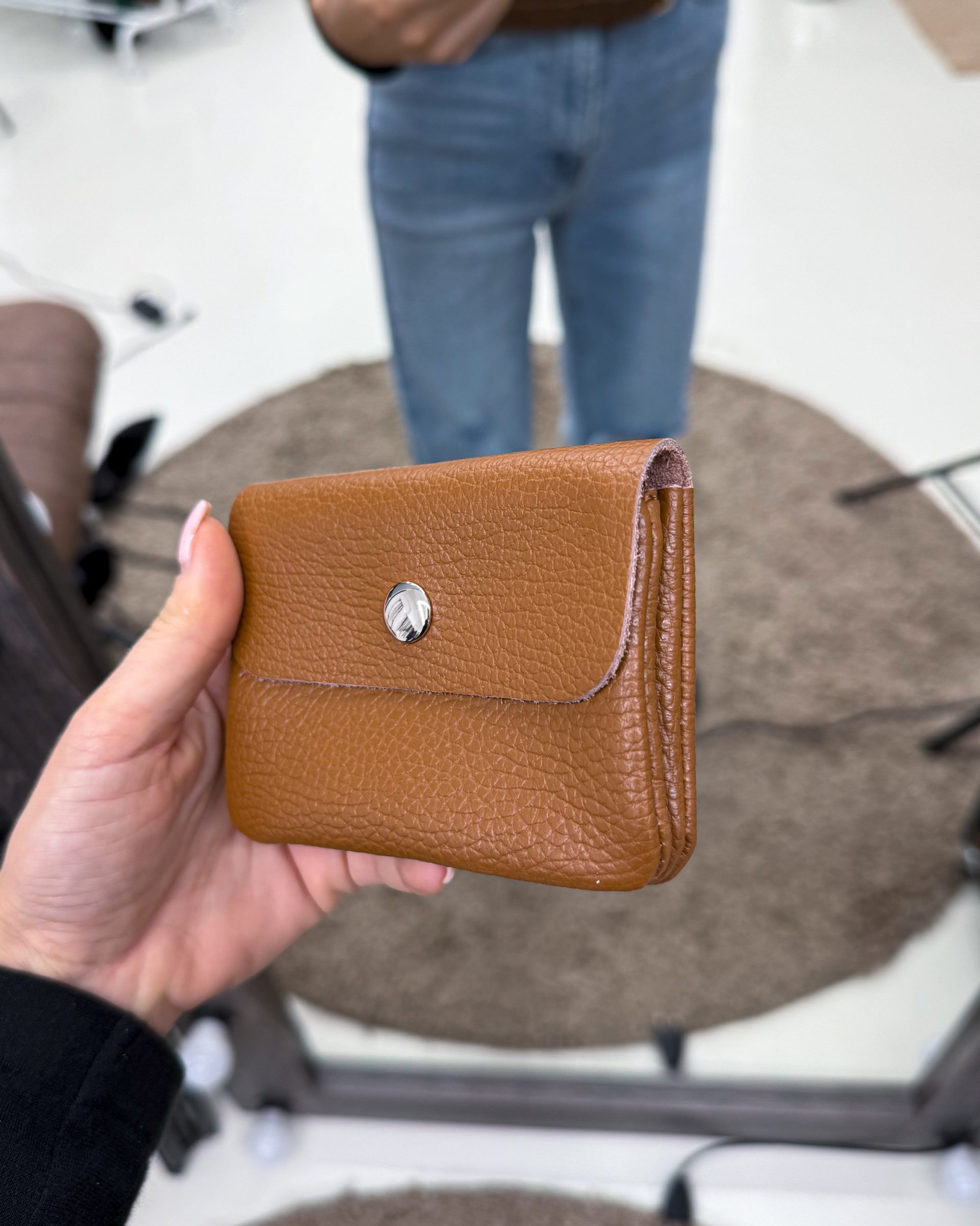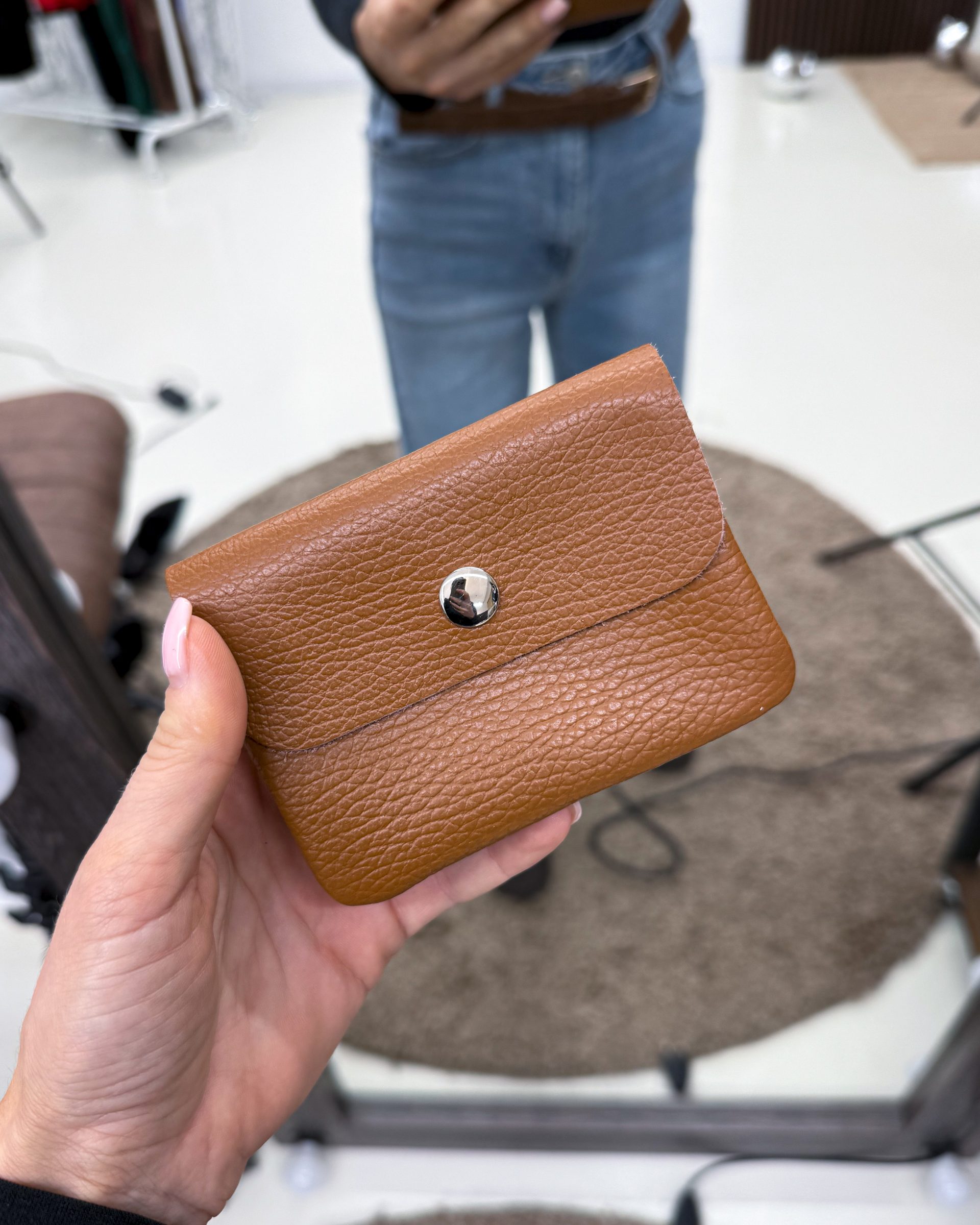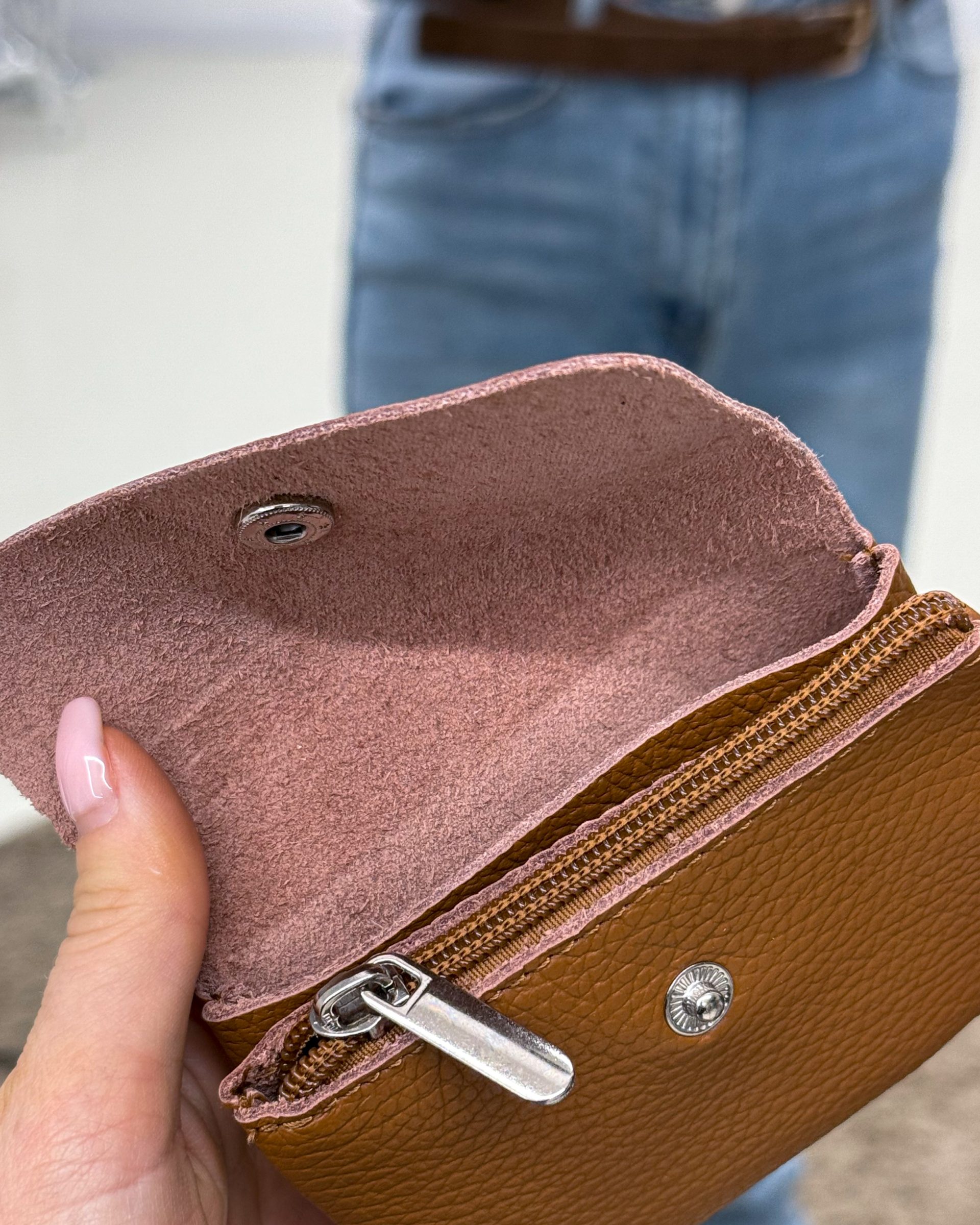 Dabīgās ādas MINI izmēra maciņš ar diviem nodalījumiem, viens aizverams ar rāvējslēdzēju, kopējā klapes maka aizdare ar spiedpodziņu