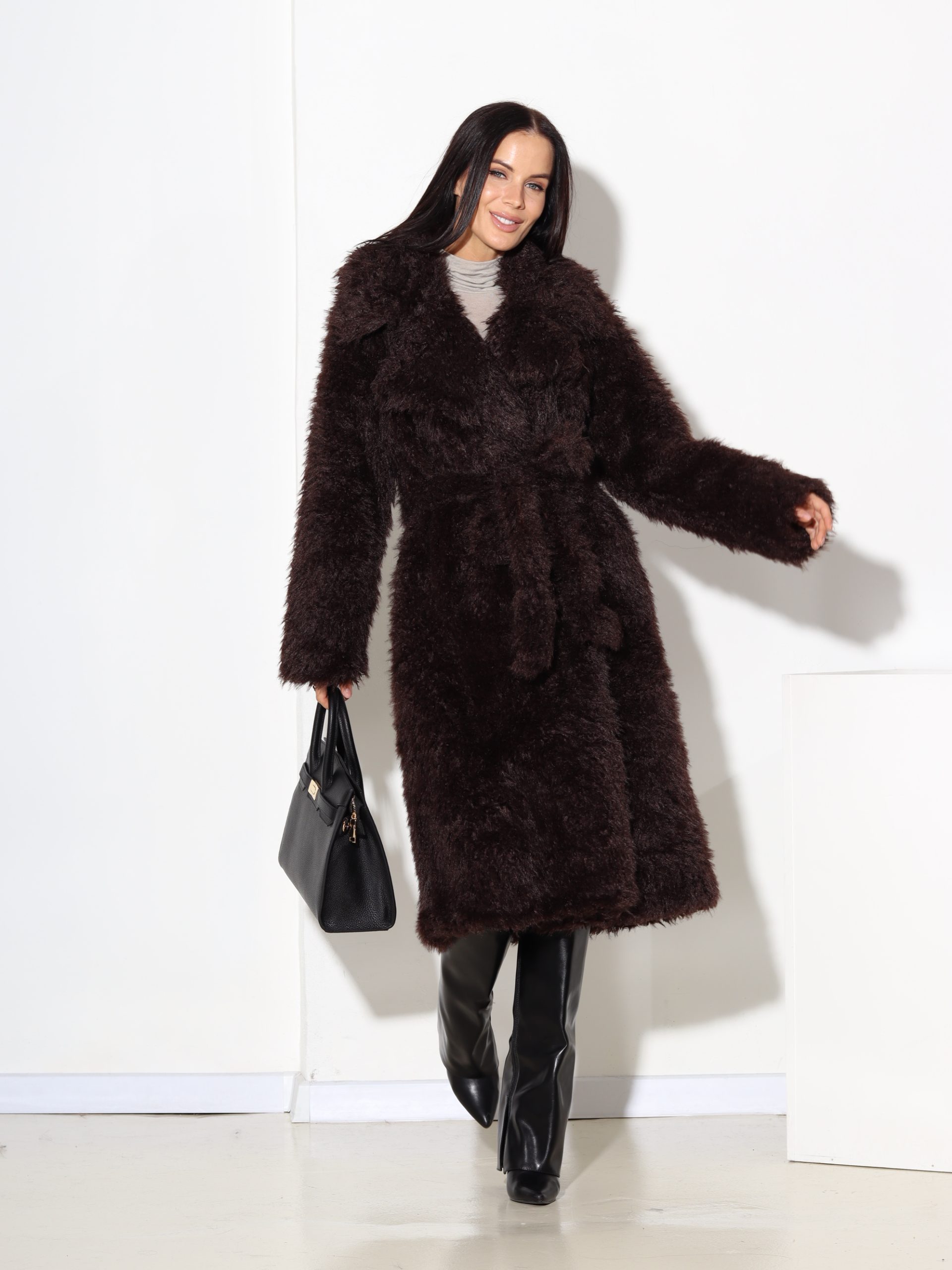 Brūns, garš viļņotas spalvas m/ā kažoks ar jostu – 17329