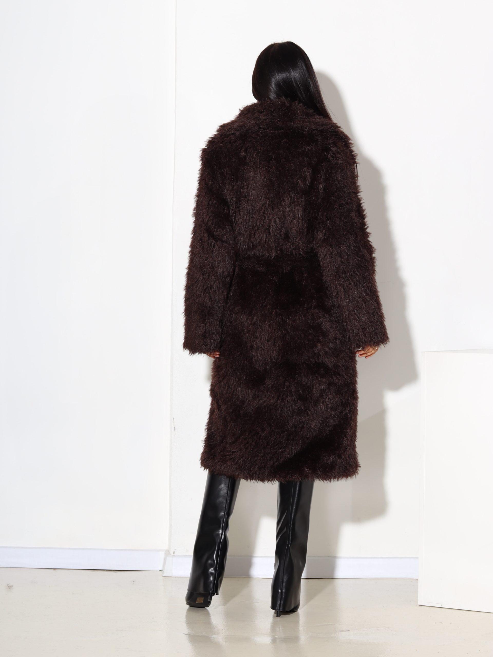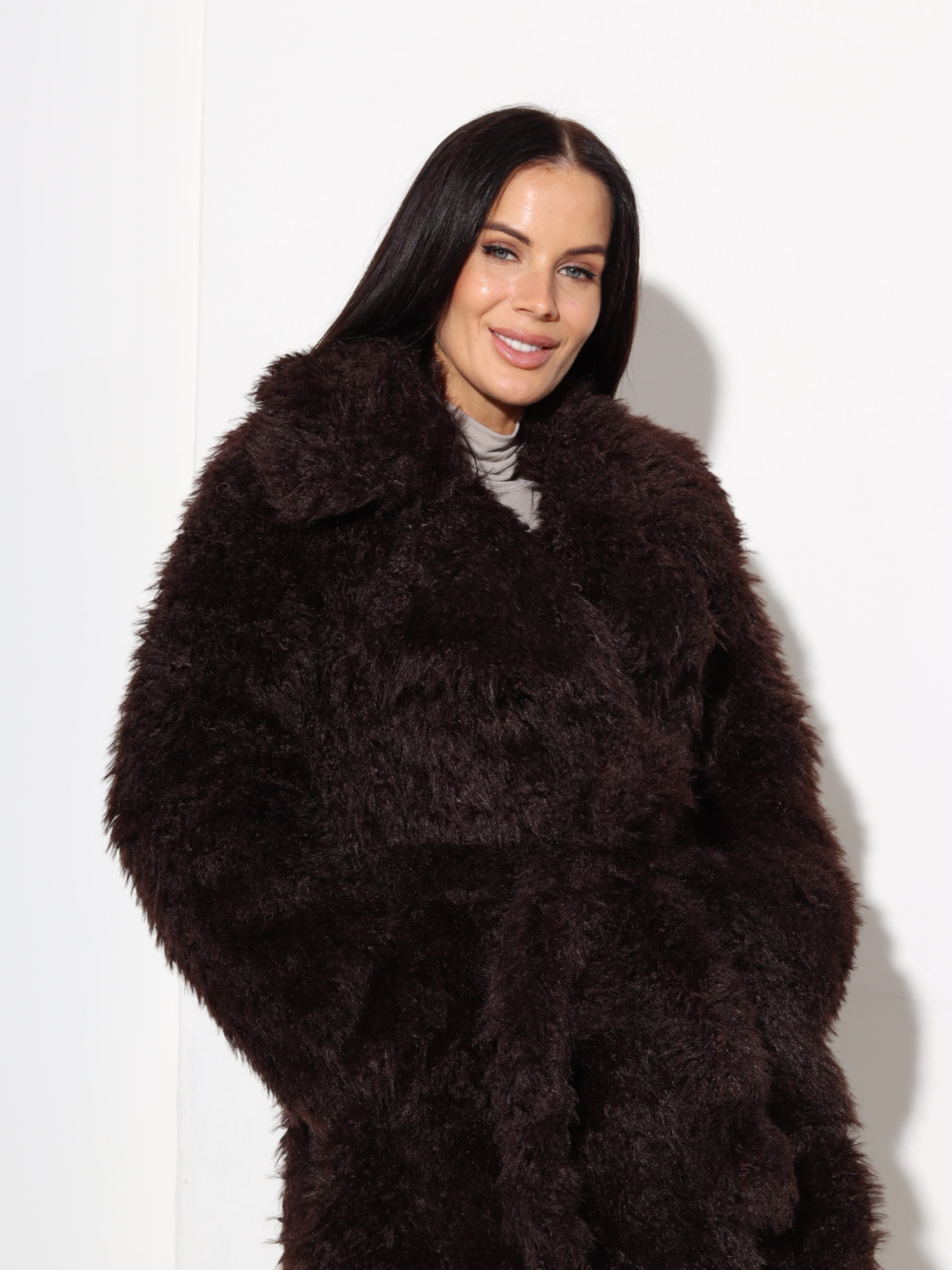 Brūns, garš viļņotas spalvas kažoks ar jostu. Kažkam ir kabatas, spiedpogu aizdare un odere.