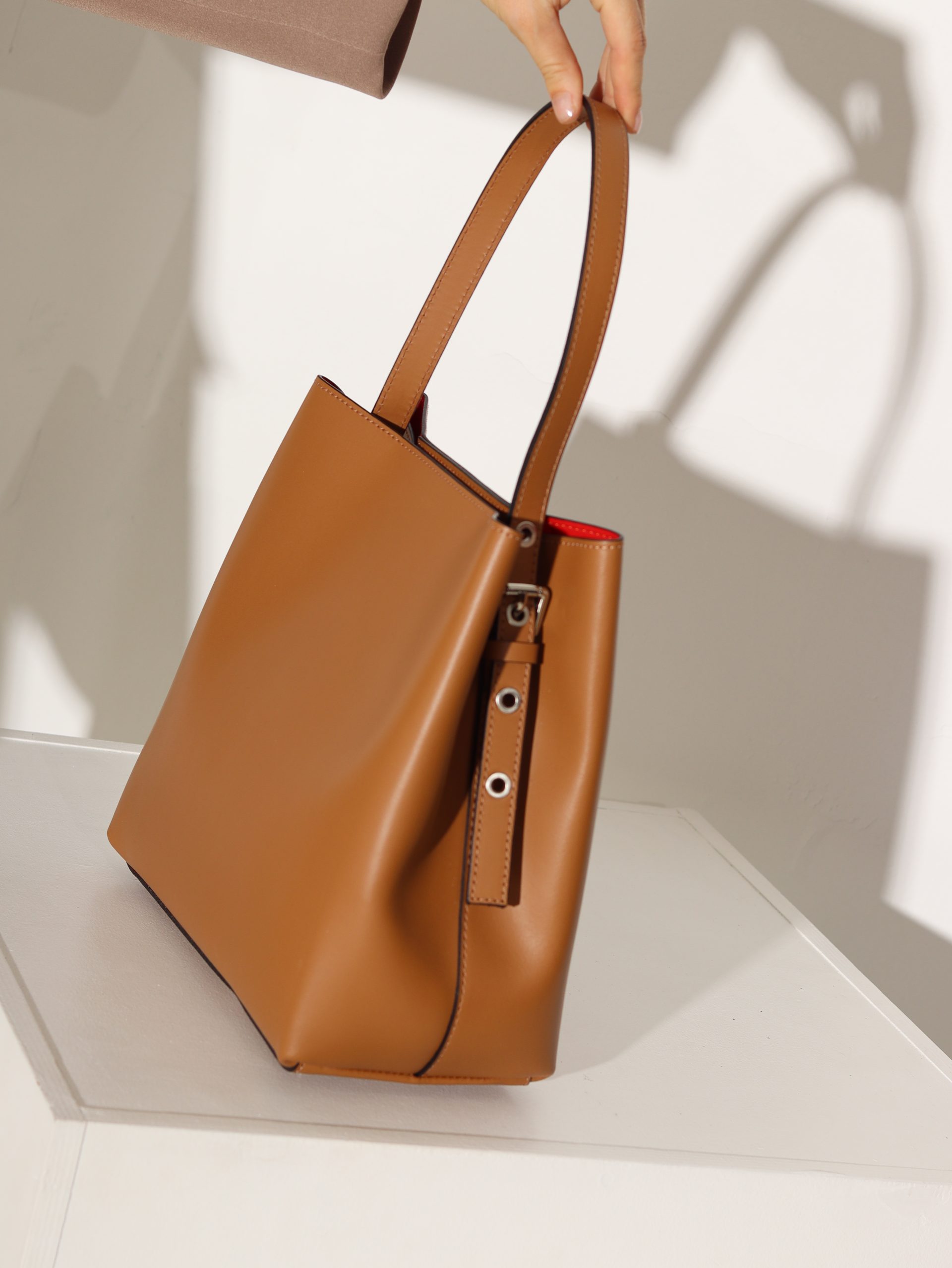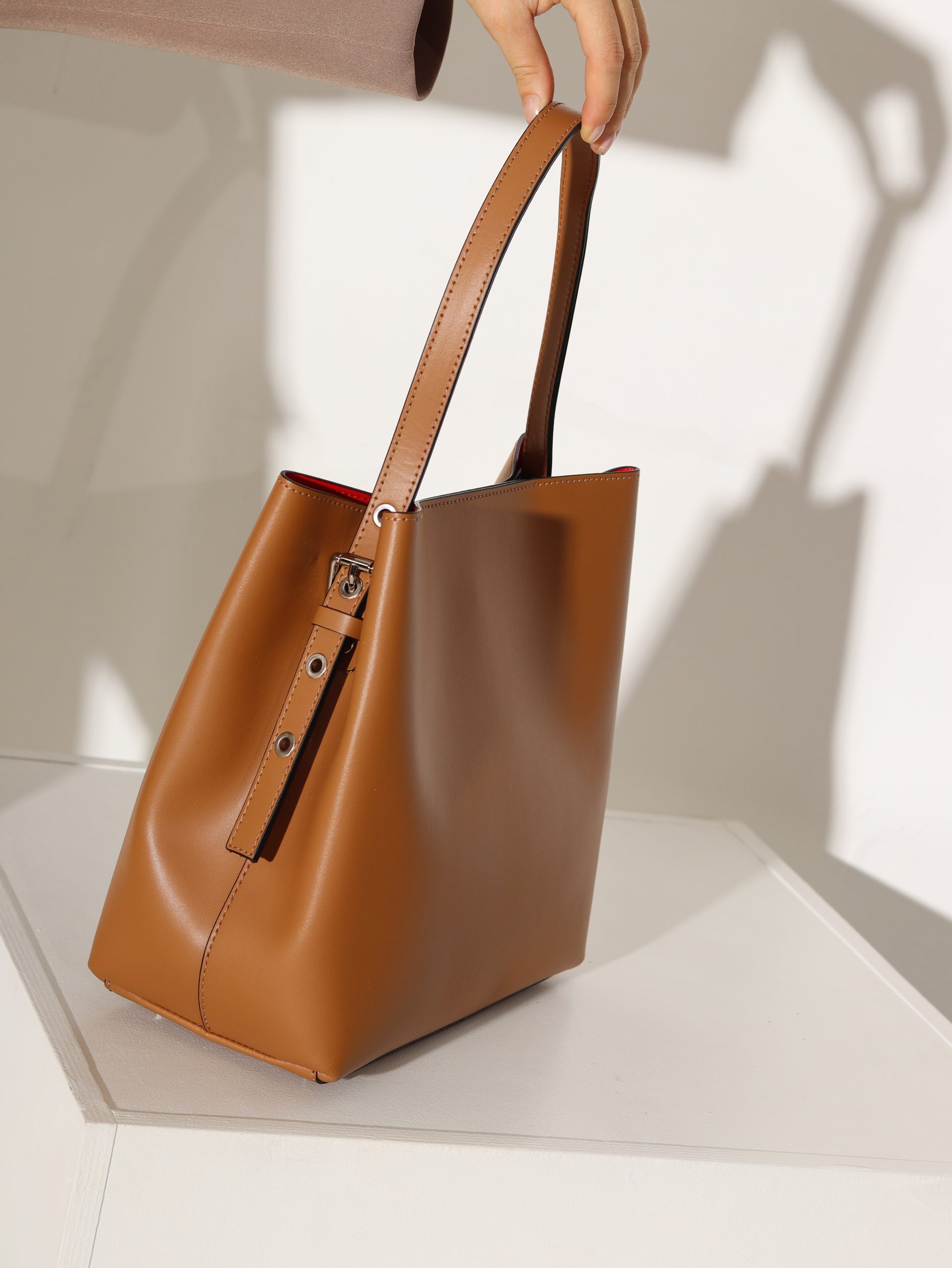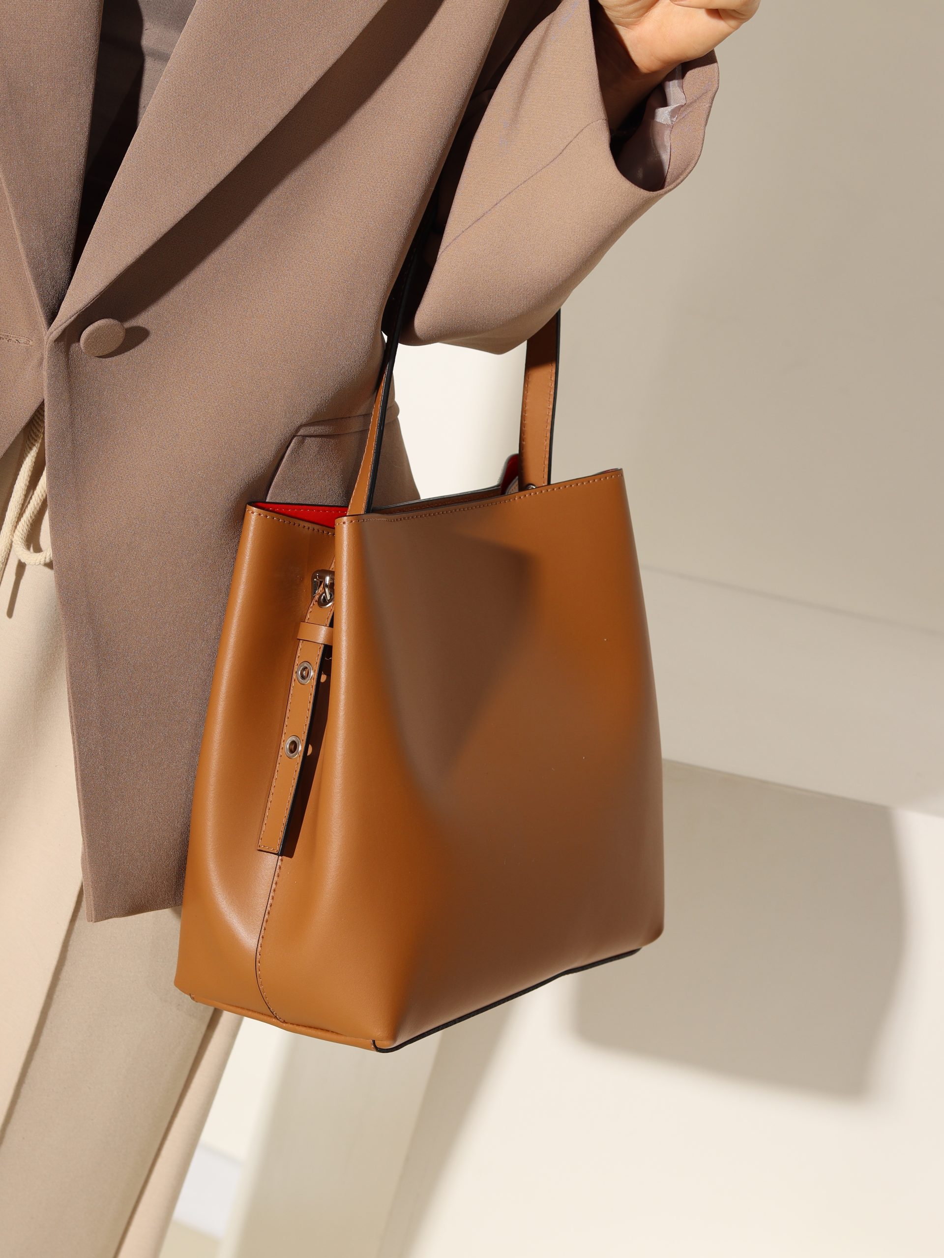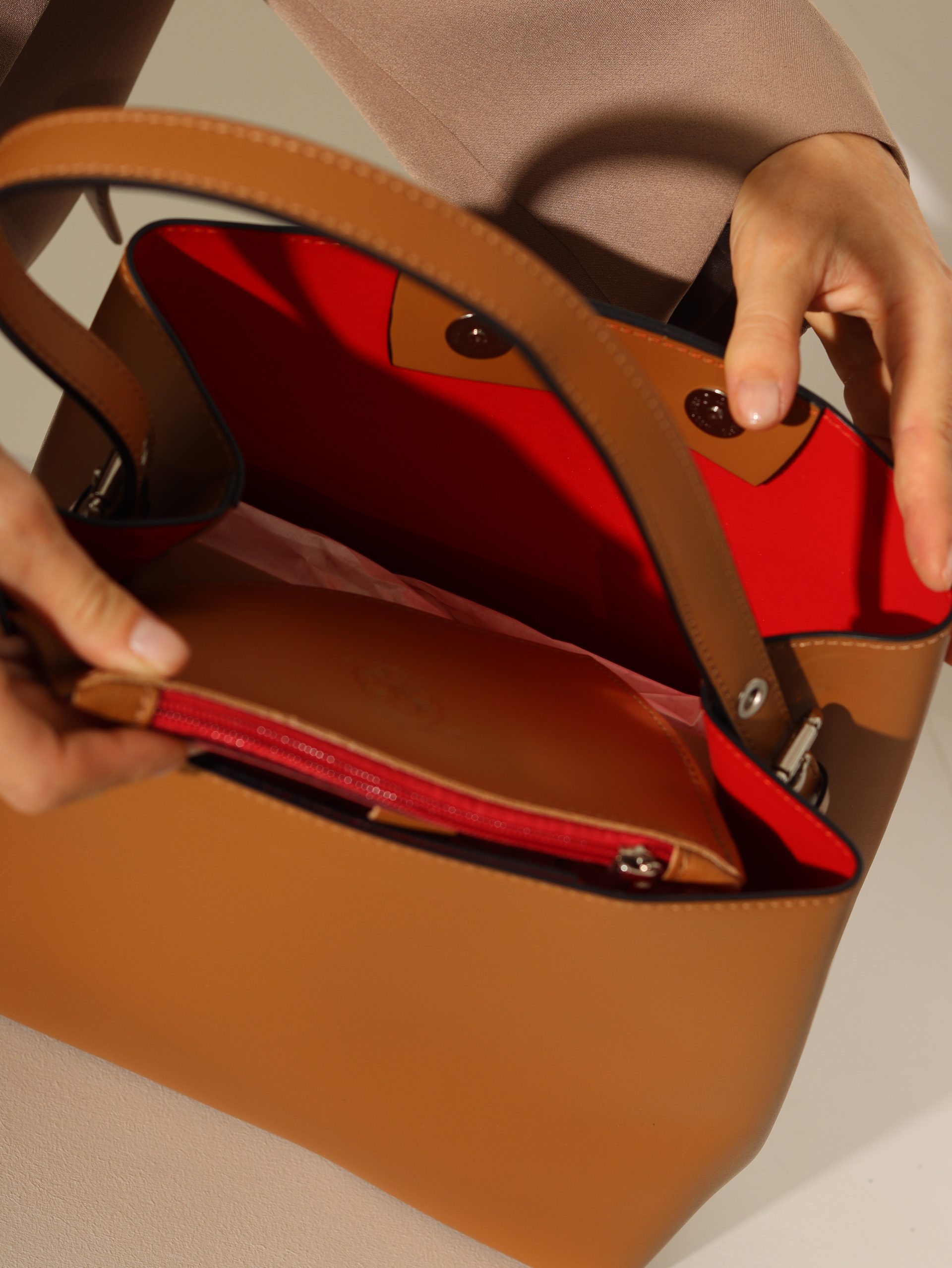 Dabīgās ādas soma ar vienu jostu (garums regulējams). Somas aizdare ir sudraba krāsas, magnētiskām spiedpogām. Iekšpuse ir sarkanā krāsā (ādas), ir iestrādāts neliels maciņš, kurš ir aizverams ar rāvējslēdzēju. Somas apakšdaļā ir iestrādāta papildus āda un četras sudraba krāsas “kājiņas”.