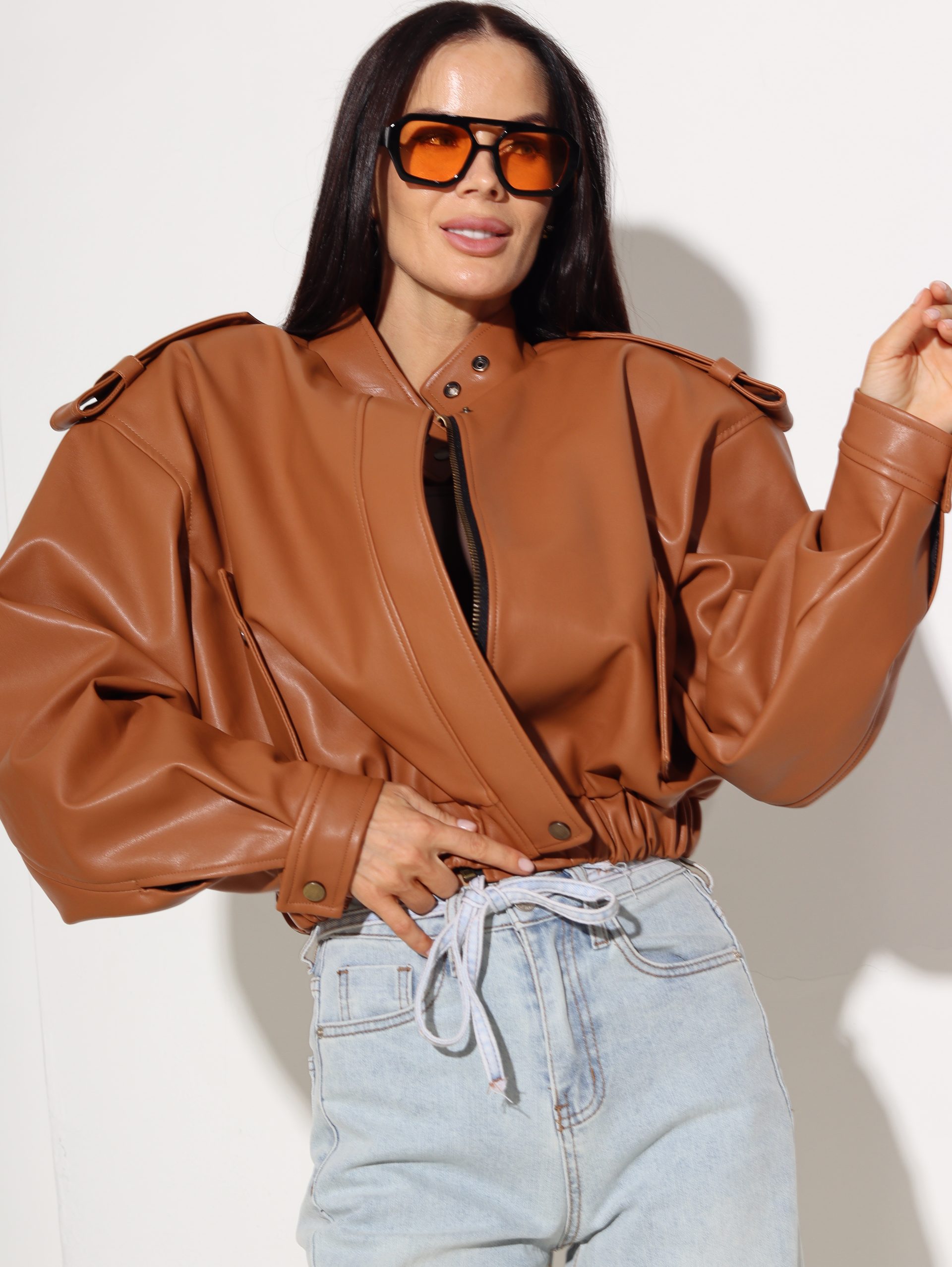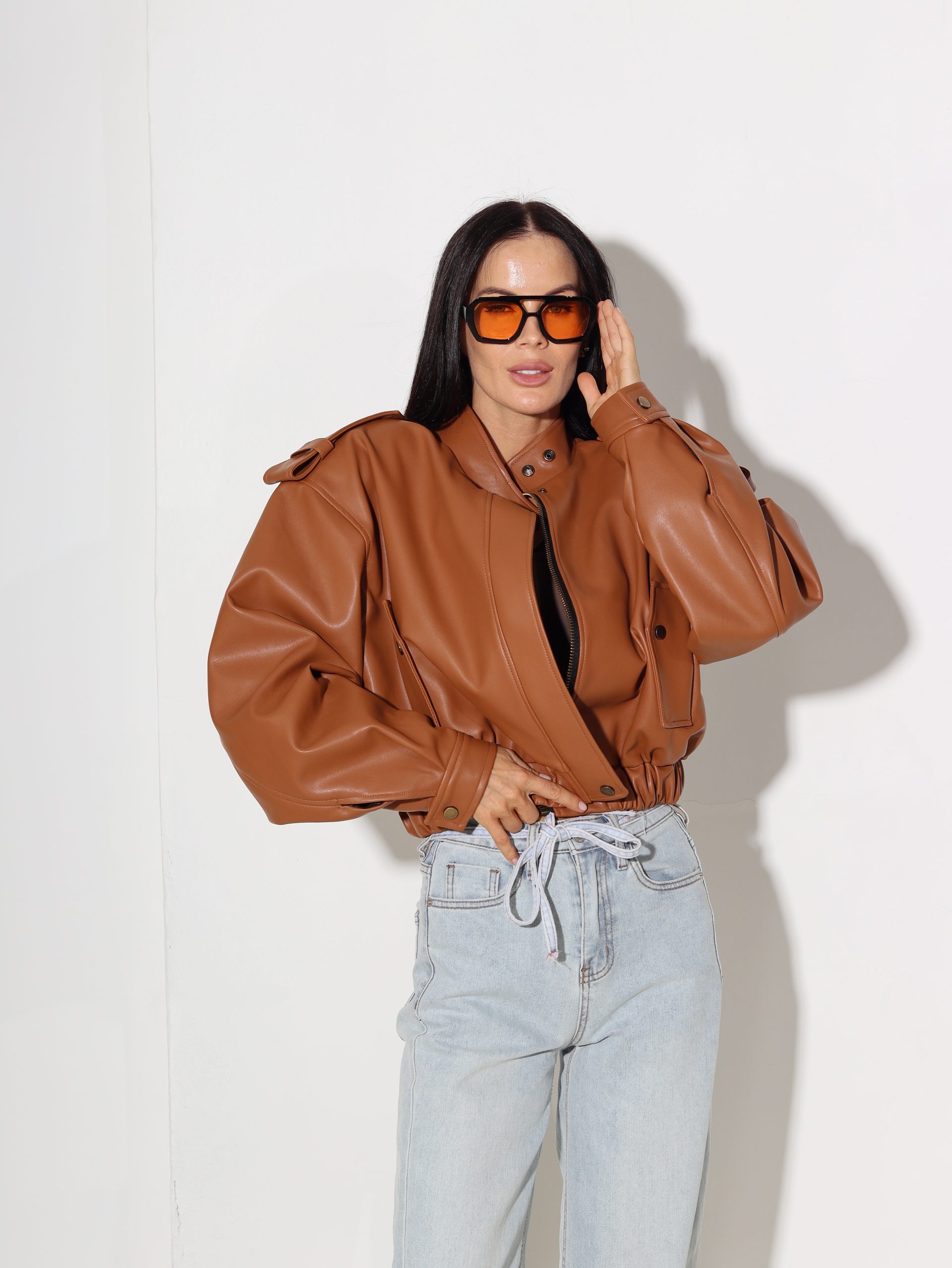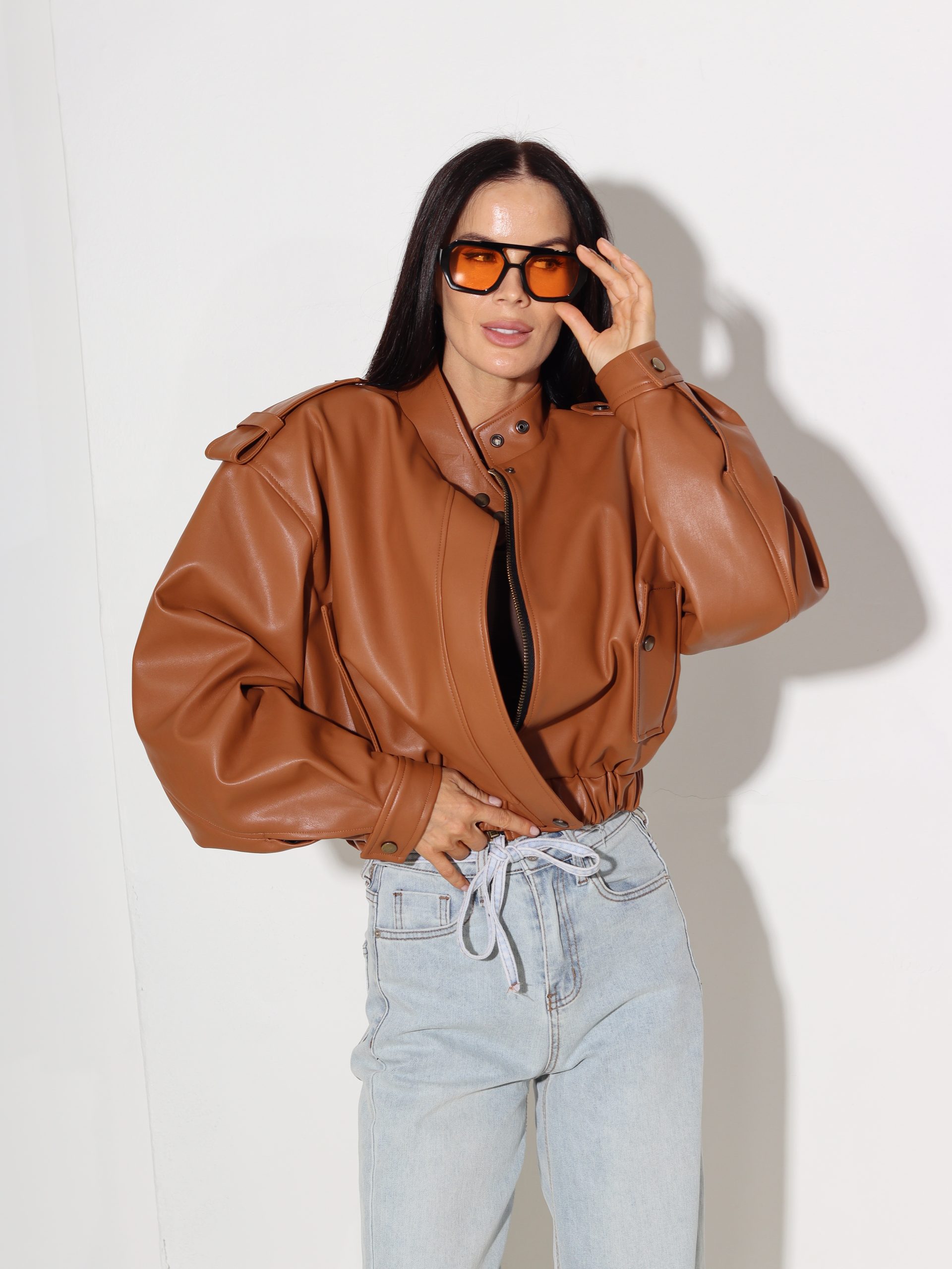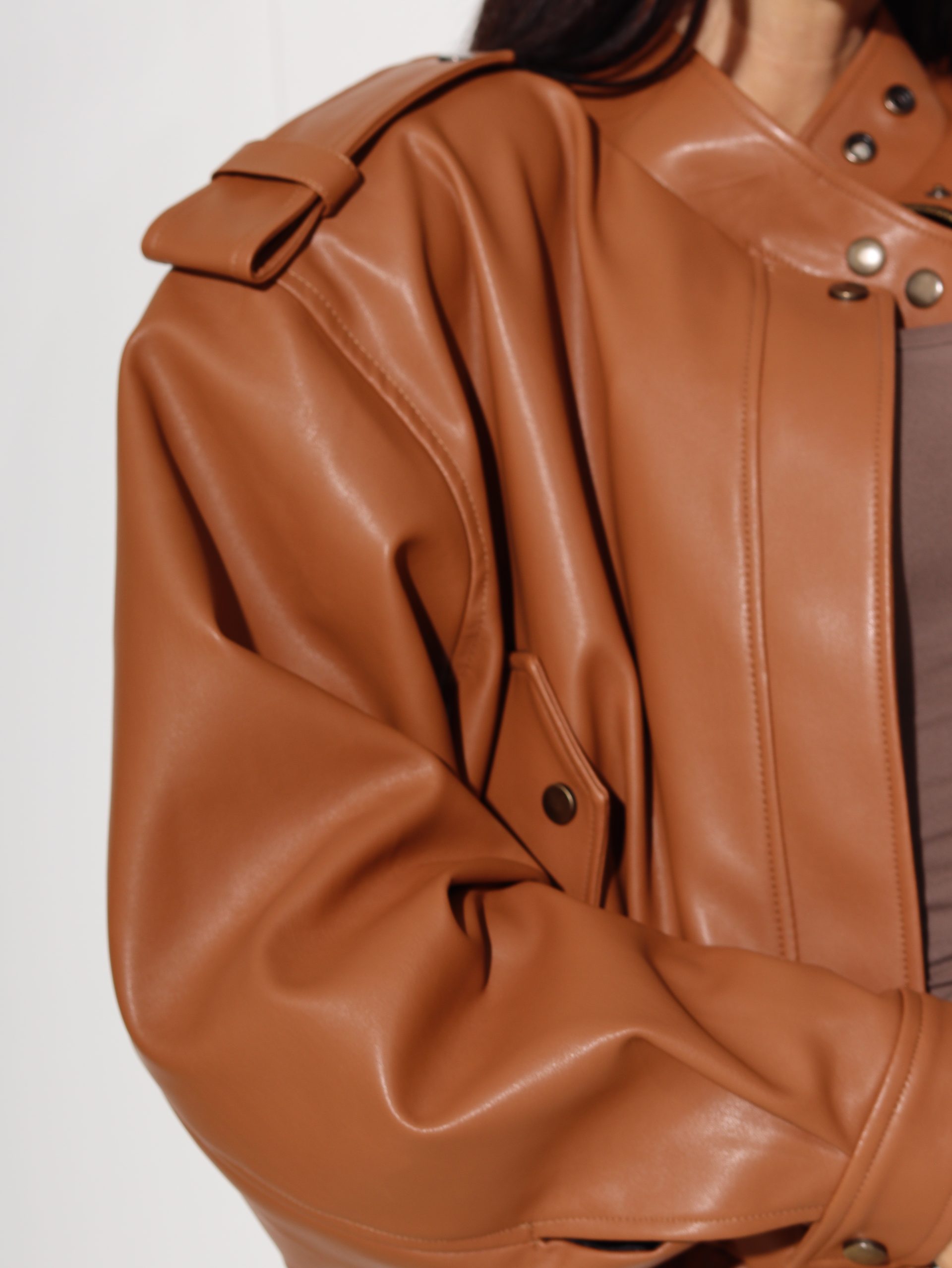 Eco ādas bombertipa jaka ar divām neaizveramām kabatām priekšpusē un nedaudz paaugstinātu kakla daļu, kuru var aizvērt. Jakas apakšdaļā ir iestrādāta gumija. Plecu daļā ir iestrādāts polsteri un iekšpusē ir iestrādāta melnas krāsas odere ar rakstu. Piedurkņu galos ir iestrādātas spiedpogas divos attālumos, adot iespēju pielāgot piedukņu galu platumu. Jaka ir aizverama ar bronzas krāsas biezo rāvējslēdzēju, kurš ir paslēpts zem atloka.