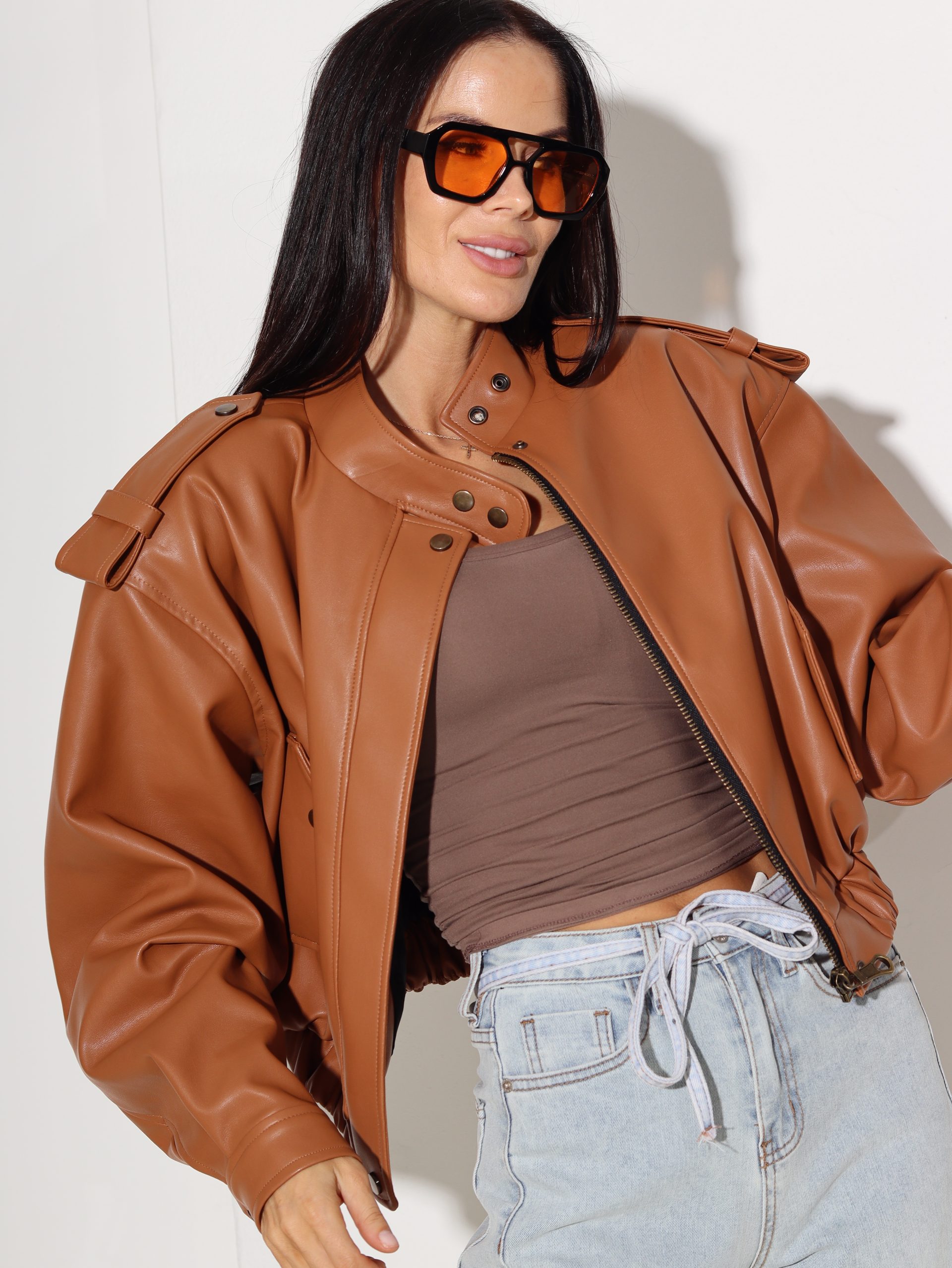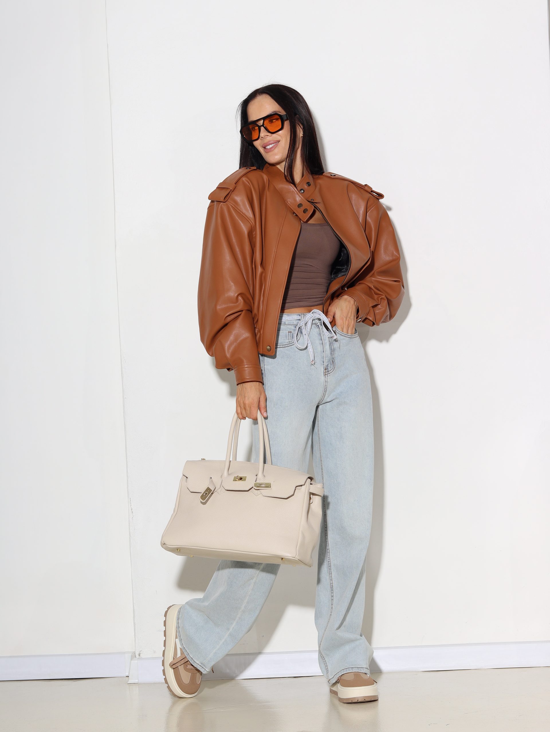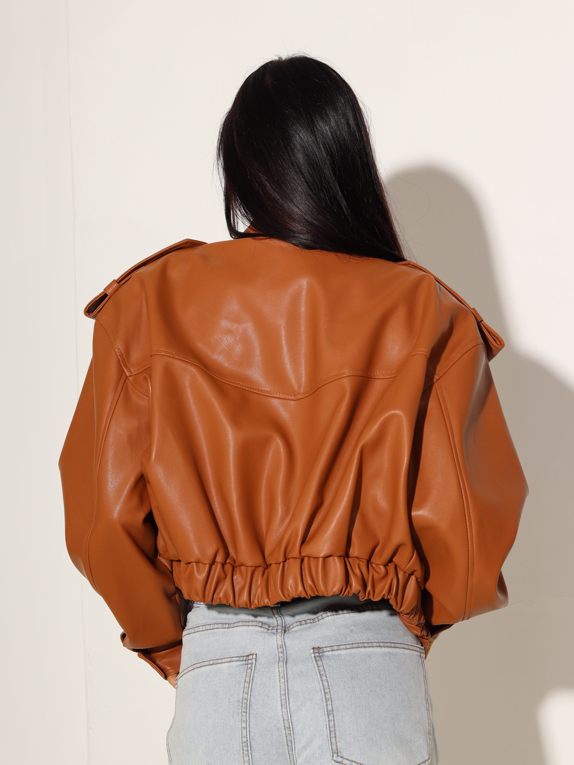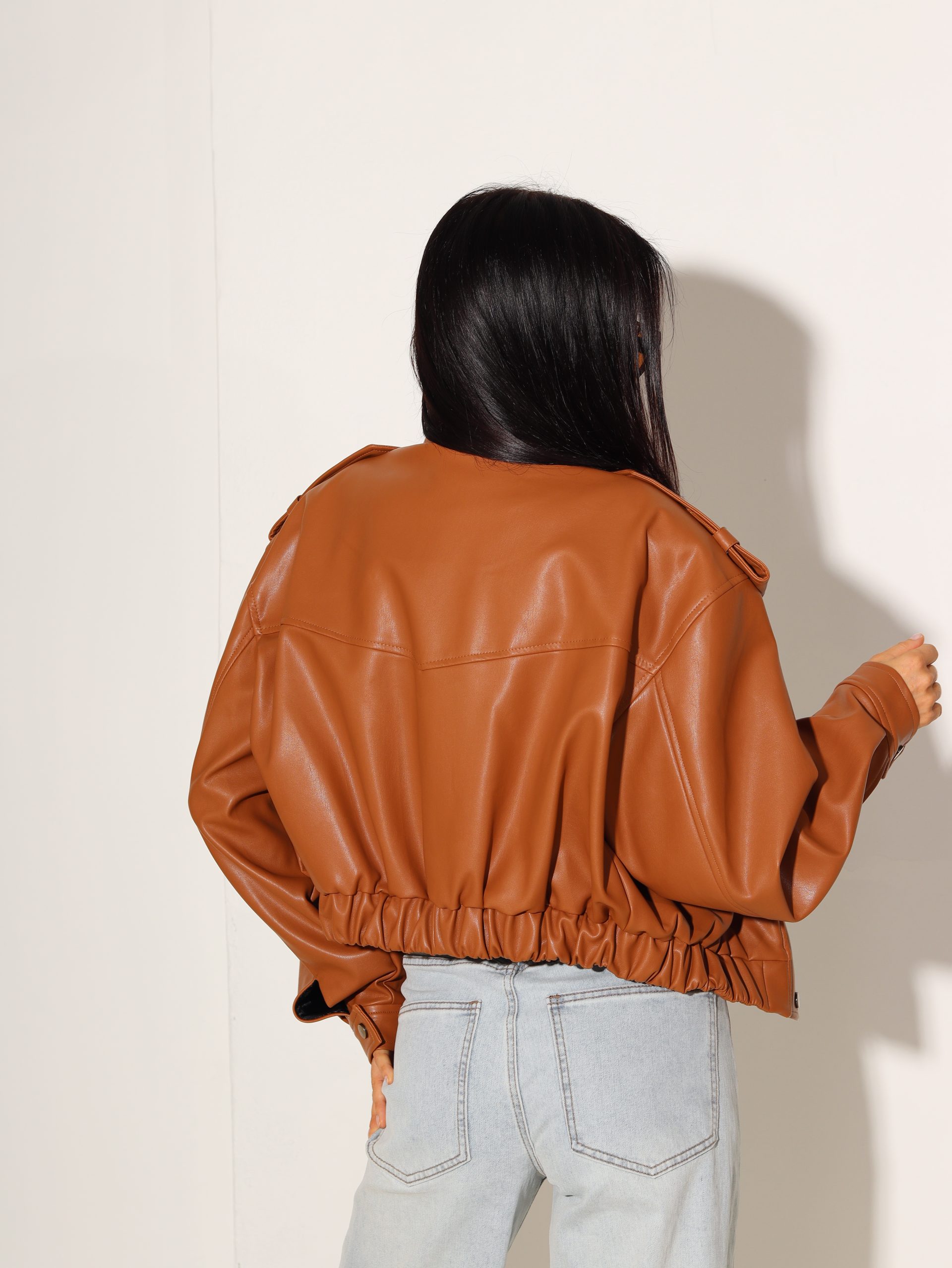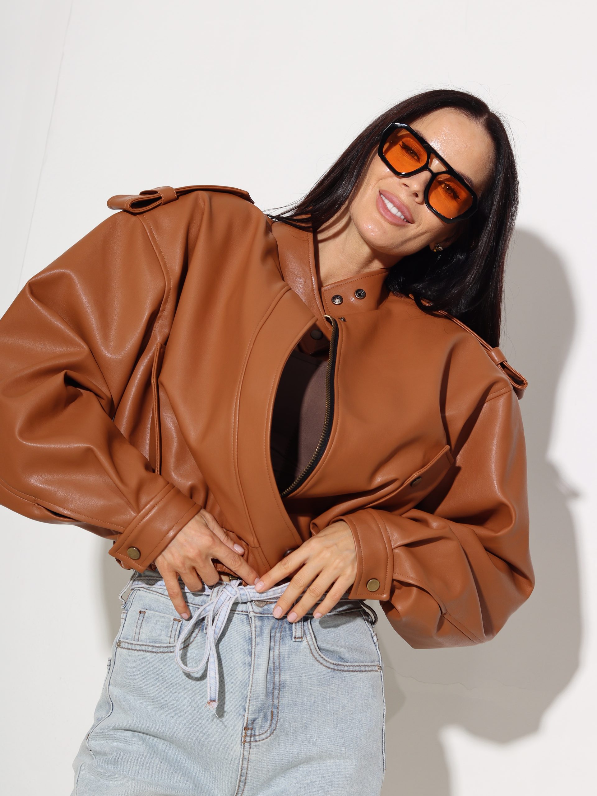 Eco ādas bombertipa jaka ar divām neaizveramām kabatām priekšpusē un nedaudz paaugstinātu kakla daļu, kuru var aizvērt. Jakas apakšdaļā ir iestrādāta gumija. Plecu daļā ir iestrādāts polsteri un iekšpusē ir iestrādāta melnas krāsas odere ar rakstu. Piedurkņu galos ir iestrādātas spiedpogas divos attālumos, adot iespēju pielāgot piedukņu galu platumu. Jaka ir aizverama ar bronzas krāsas biezo rāvējslēdzēju, kurš ir paslēpts zem atloka.