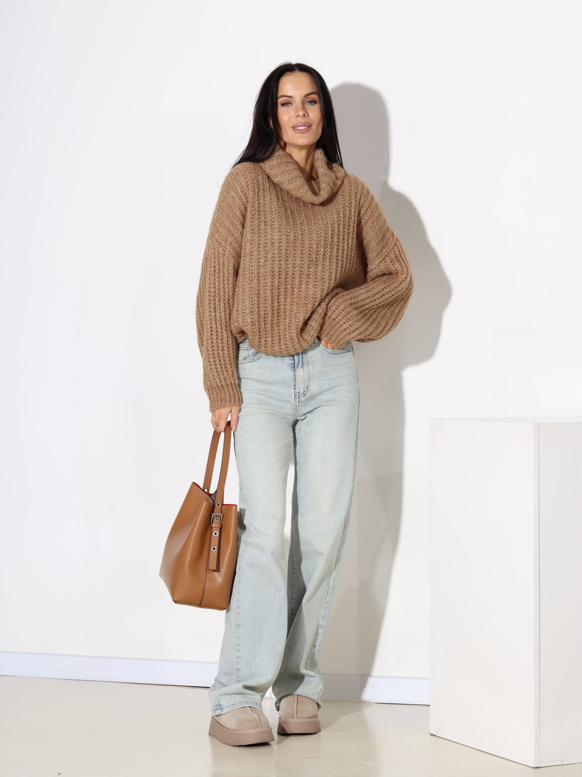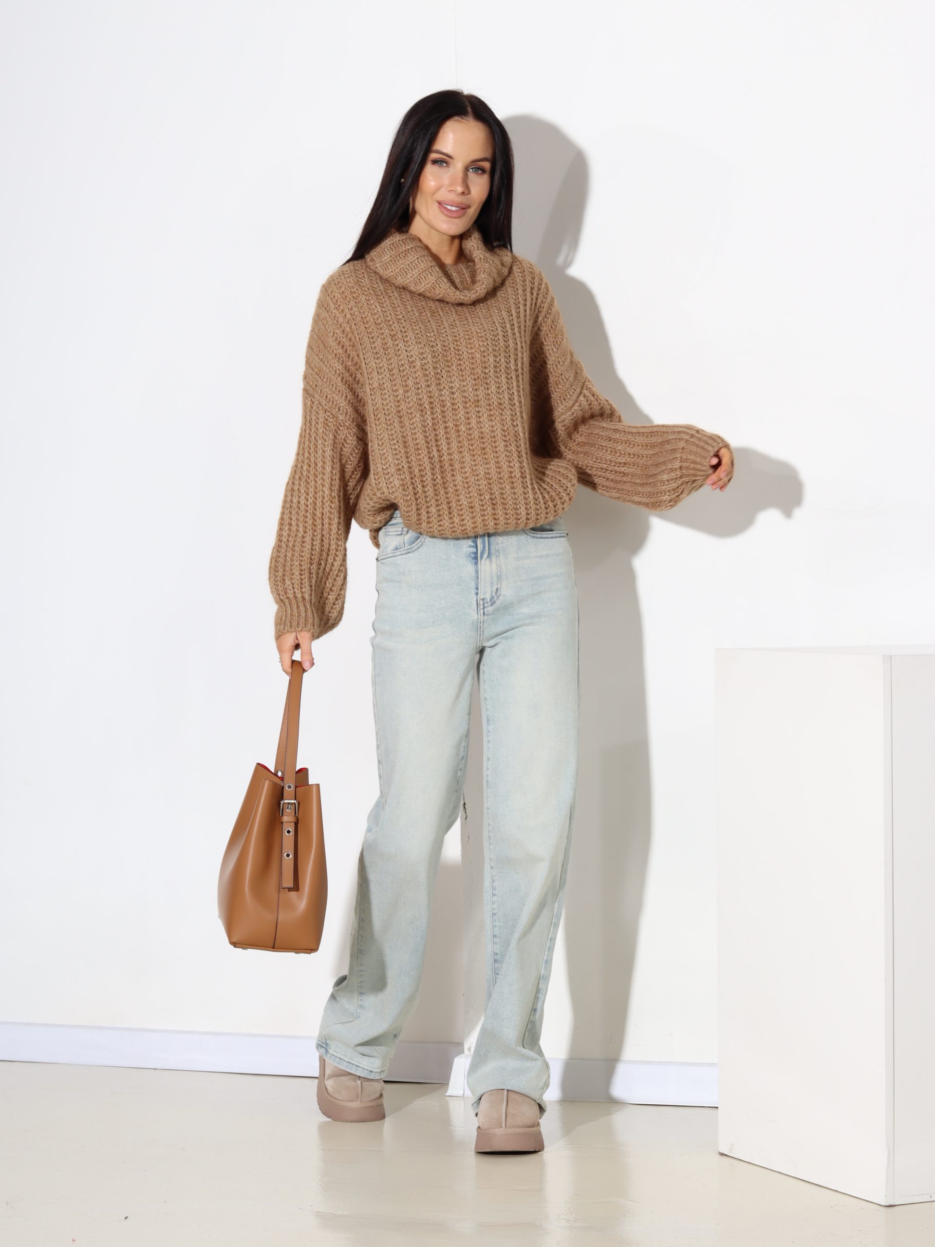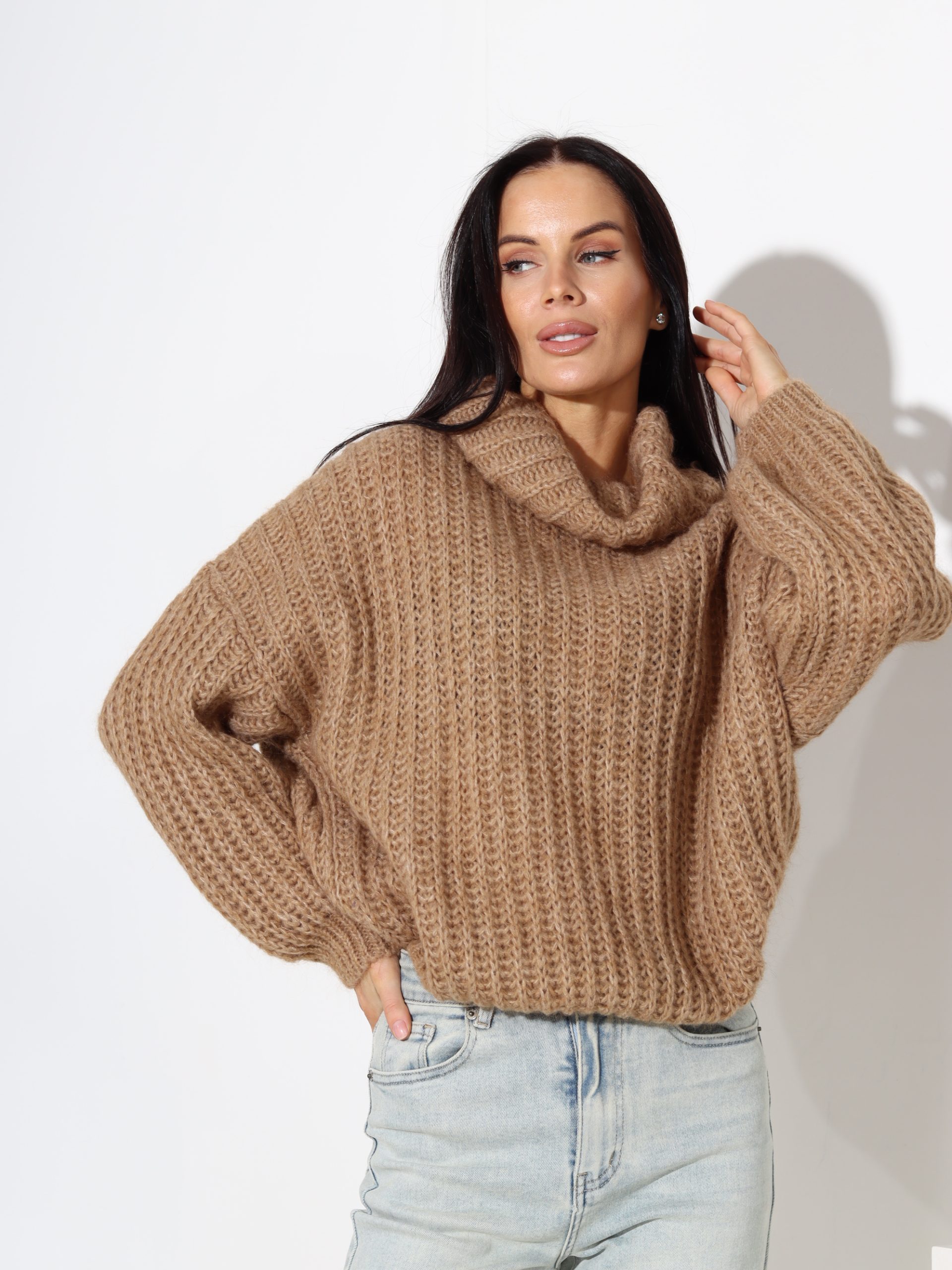 Camel krāsas liela adījuma mohēras džemperis ar dubultu atloku – 17713