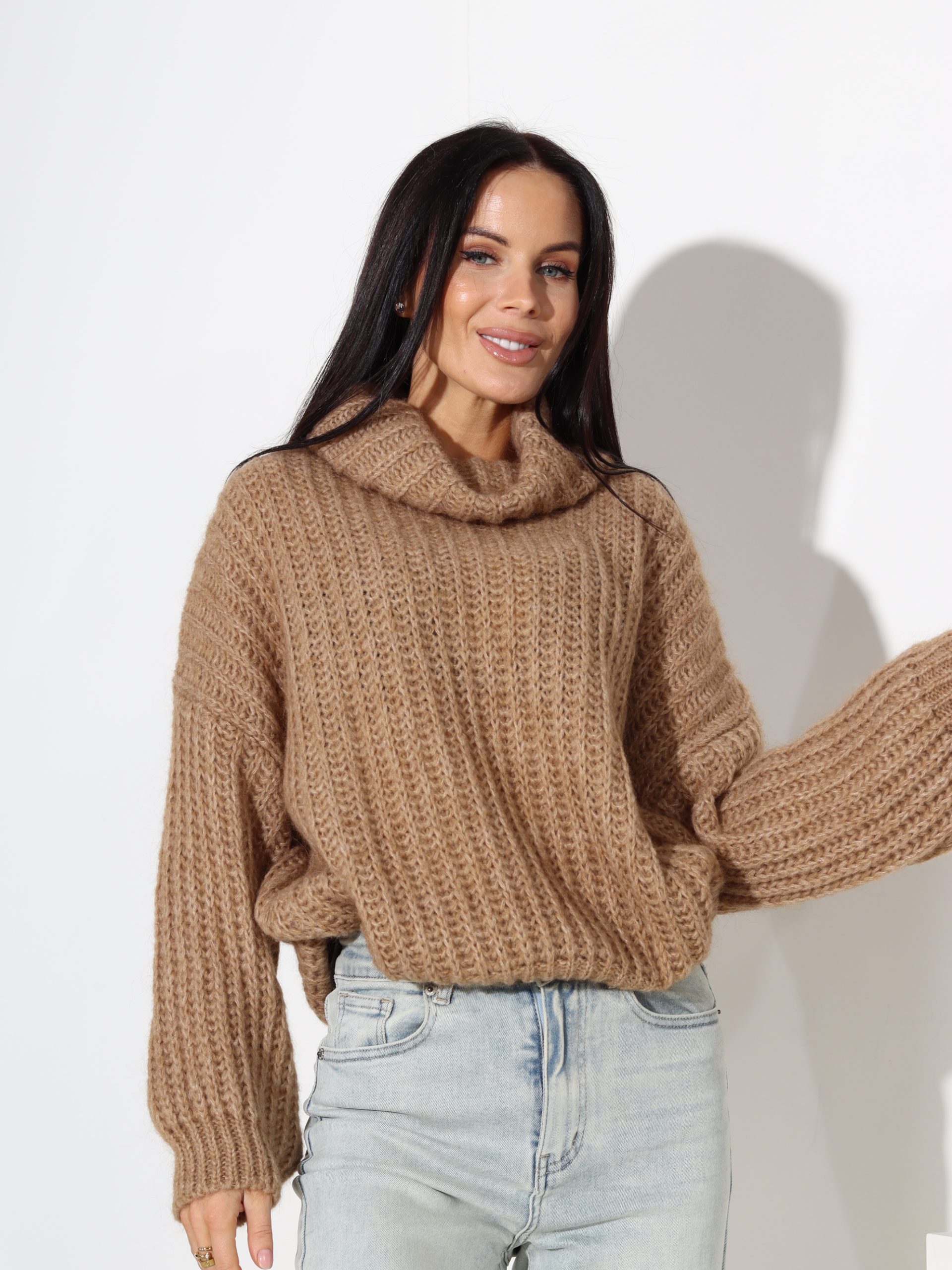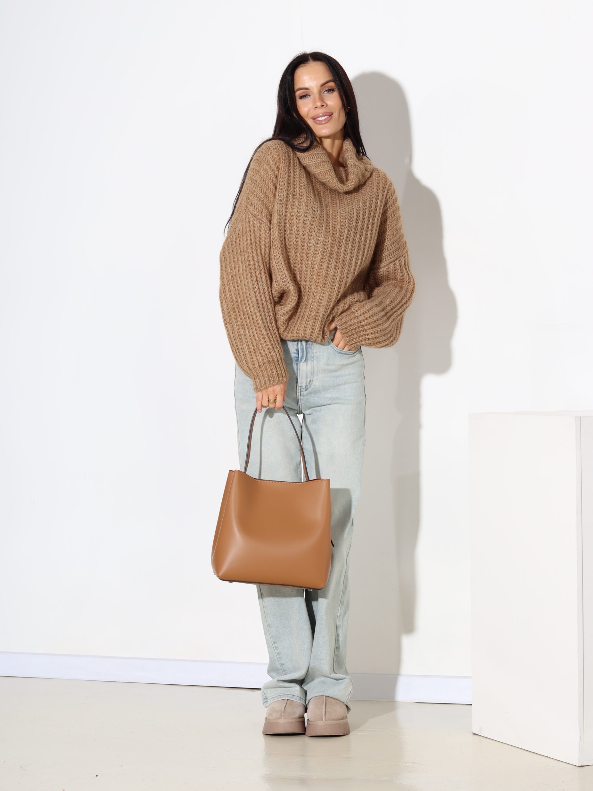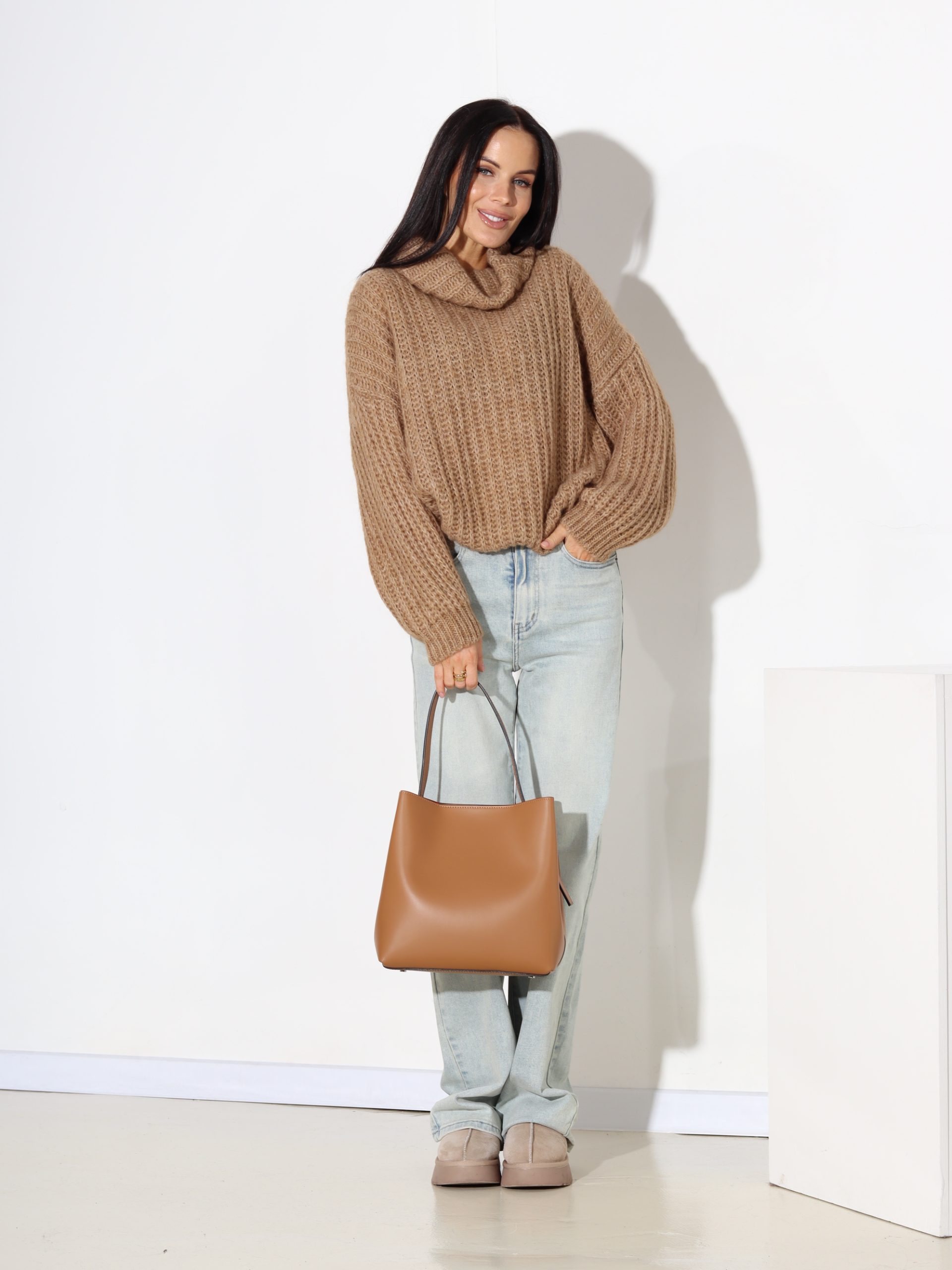 Camel krāsas liela adījuma mohēras džemperis ar dubultu atloku – 17713