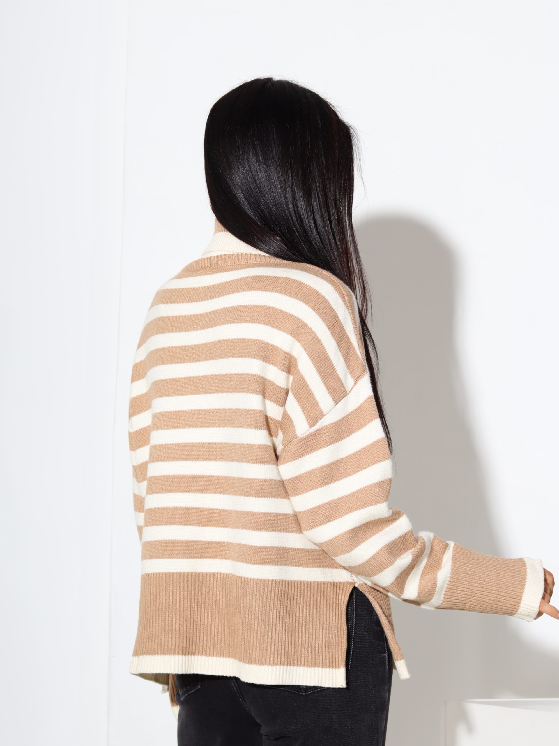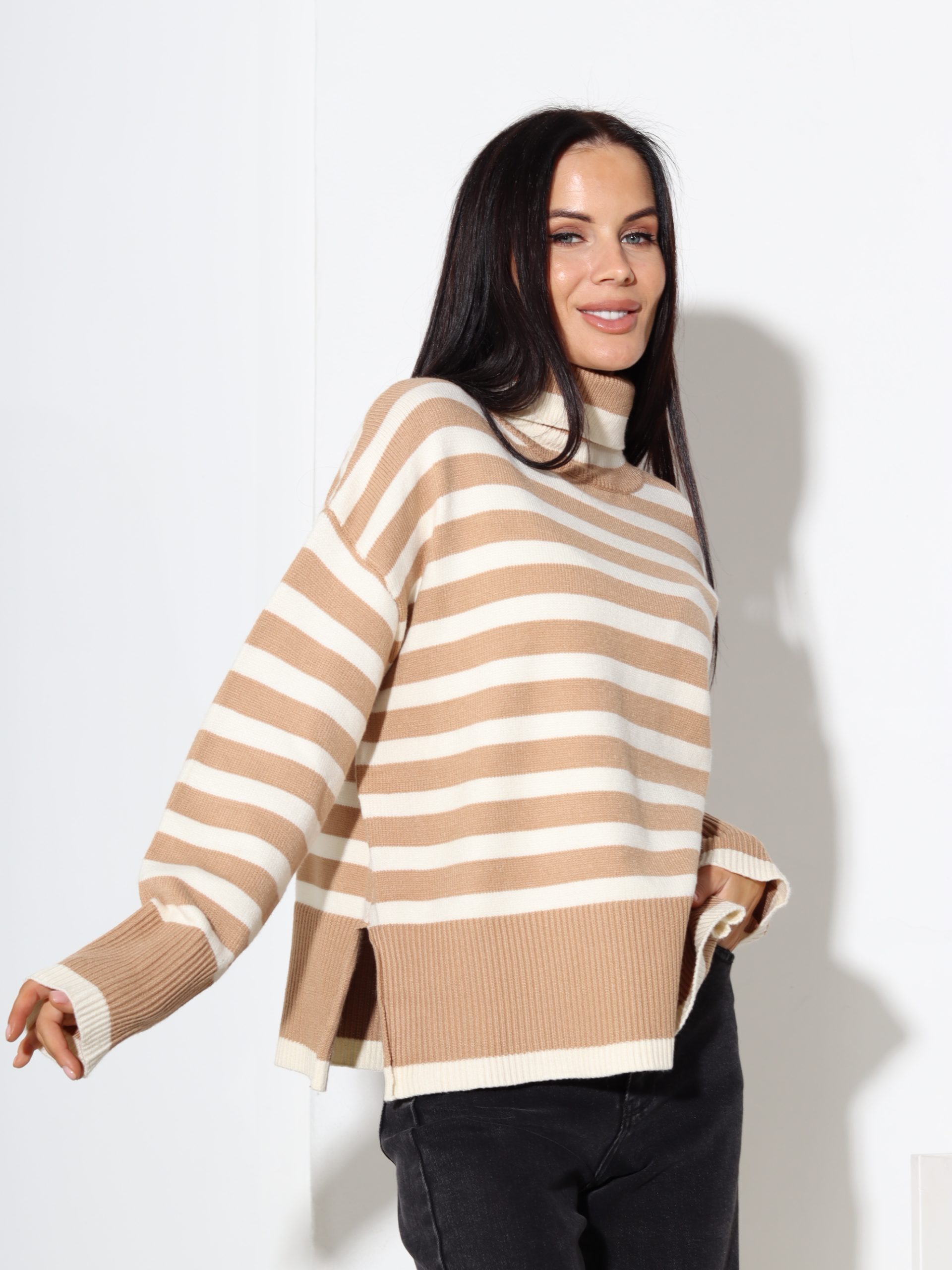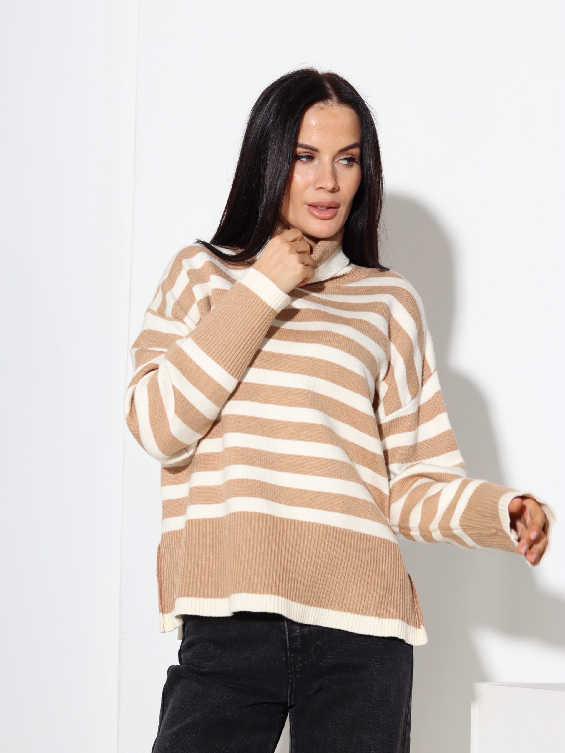 Camel svītrains džemperis ar augstu kakla daļu – 17469