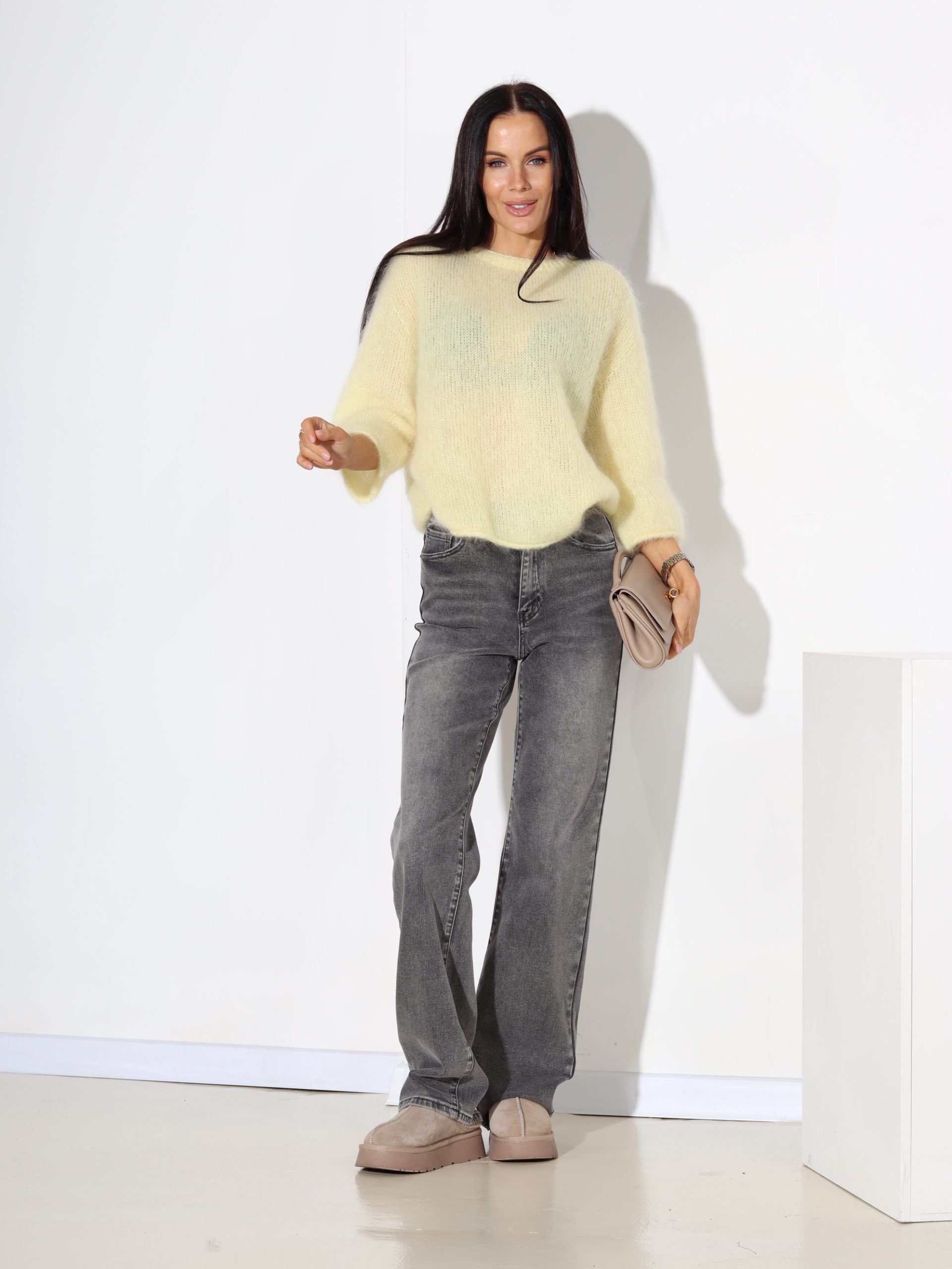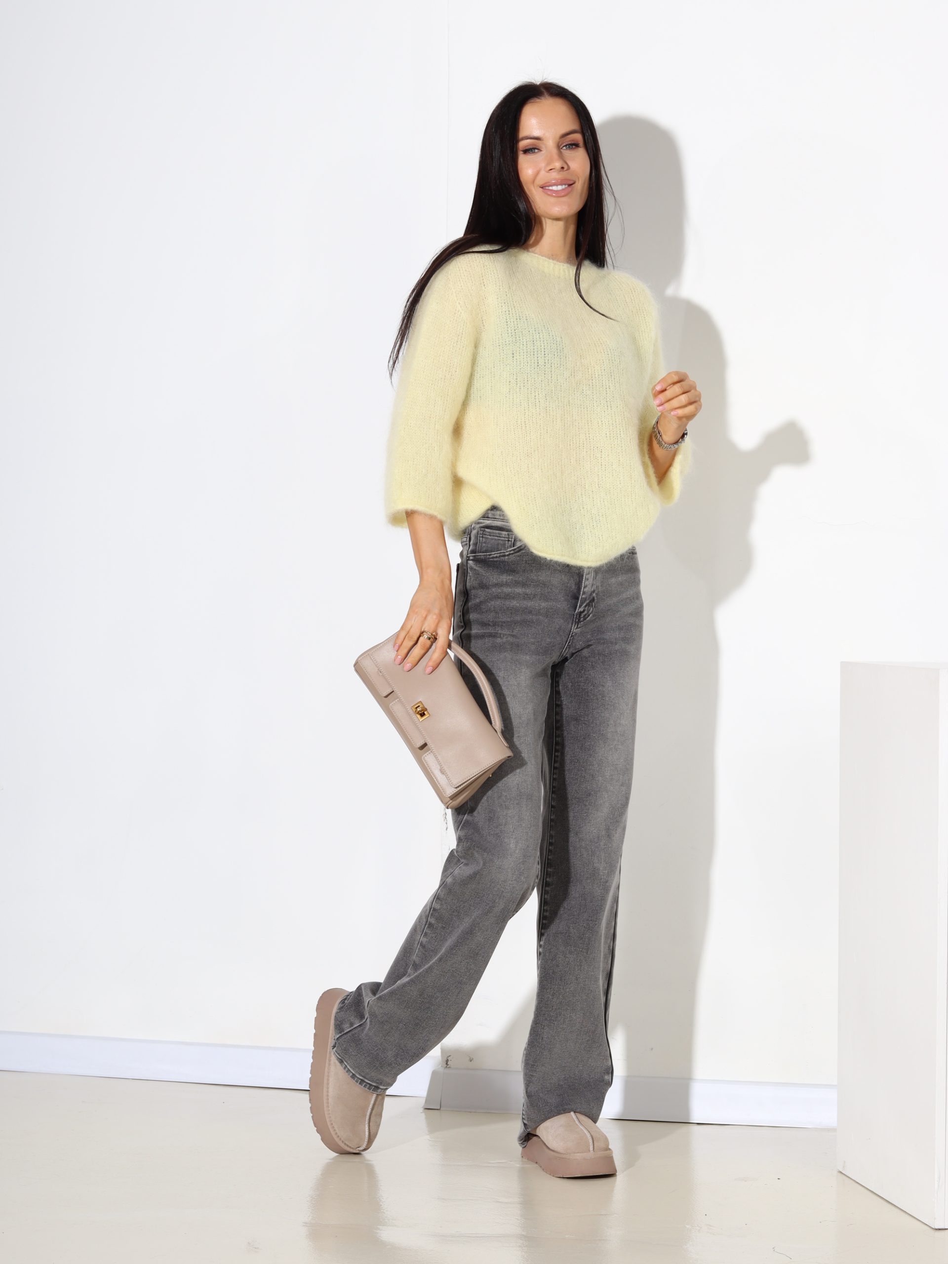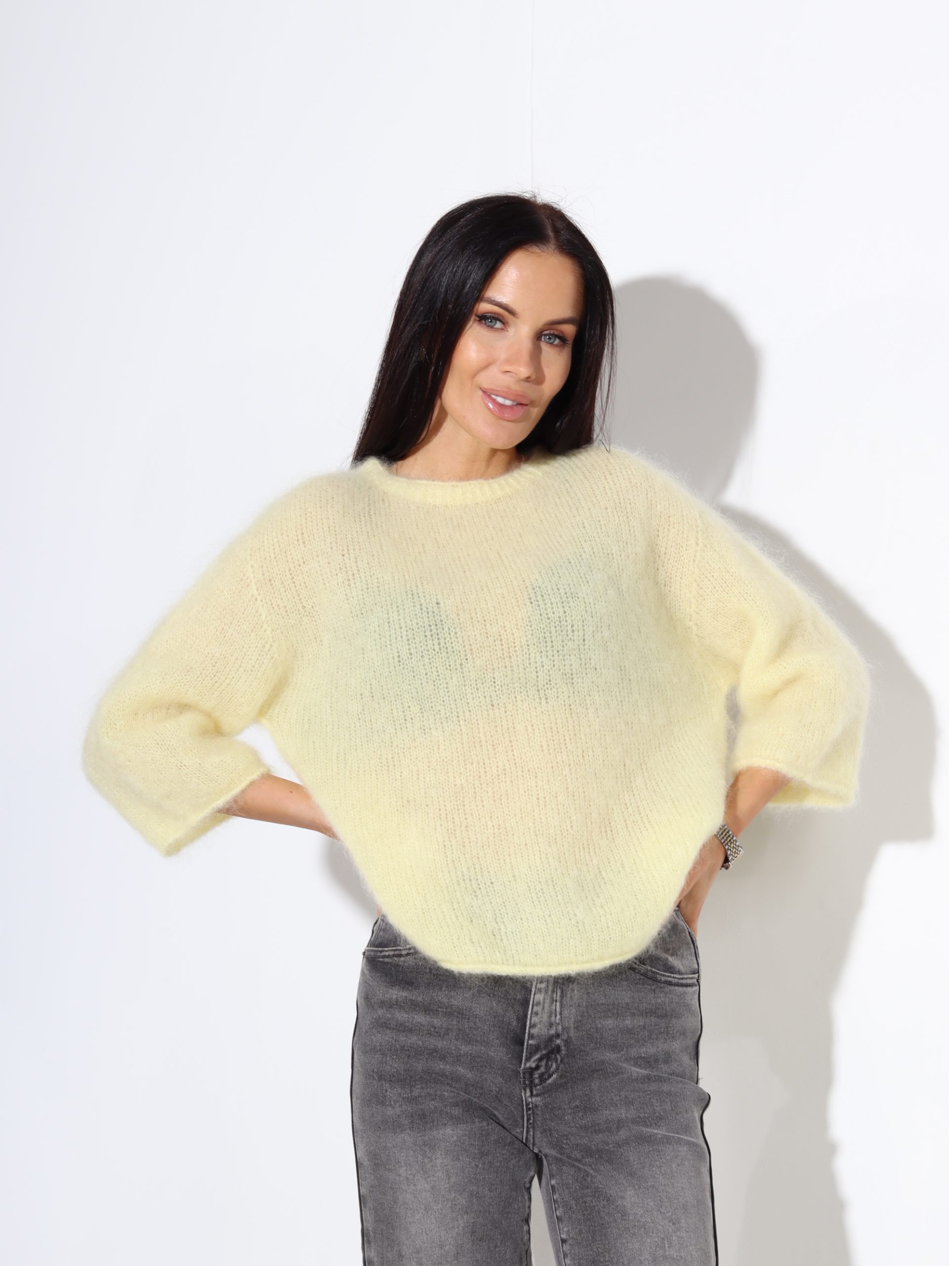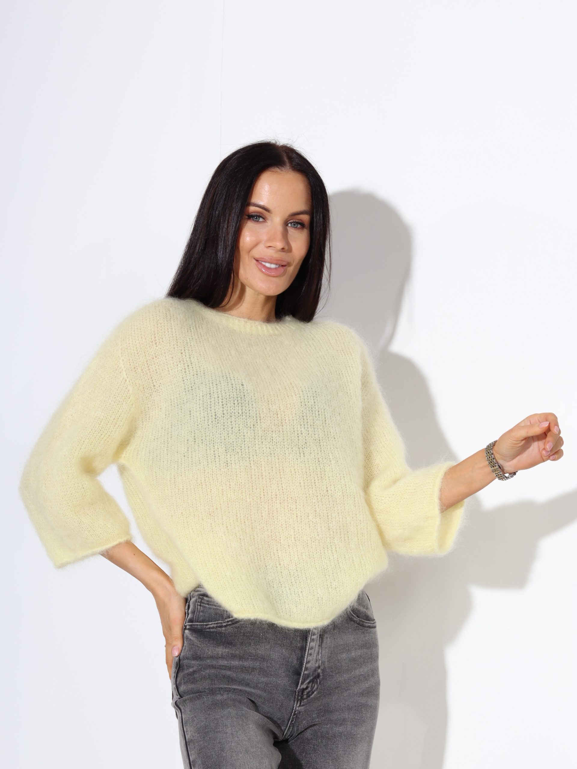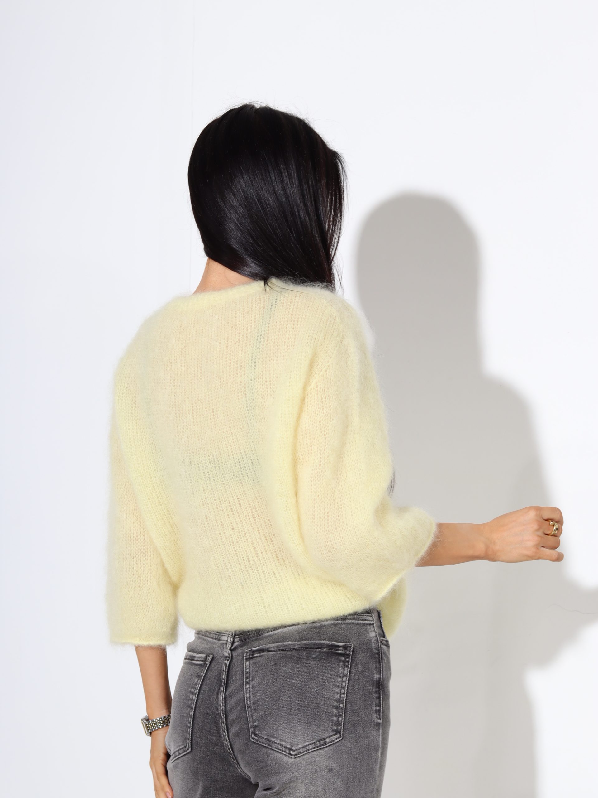Dzeltens mohēras džemperis ar saīsinātu piedurkni, noapaļota kakla daļa – 17697