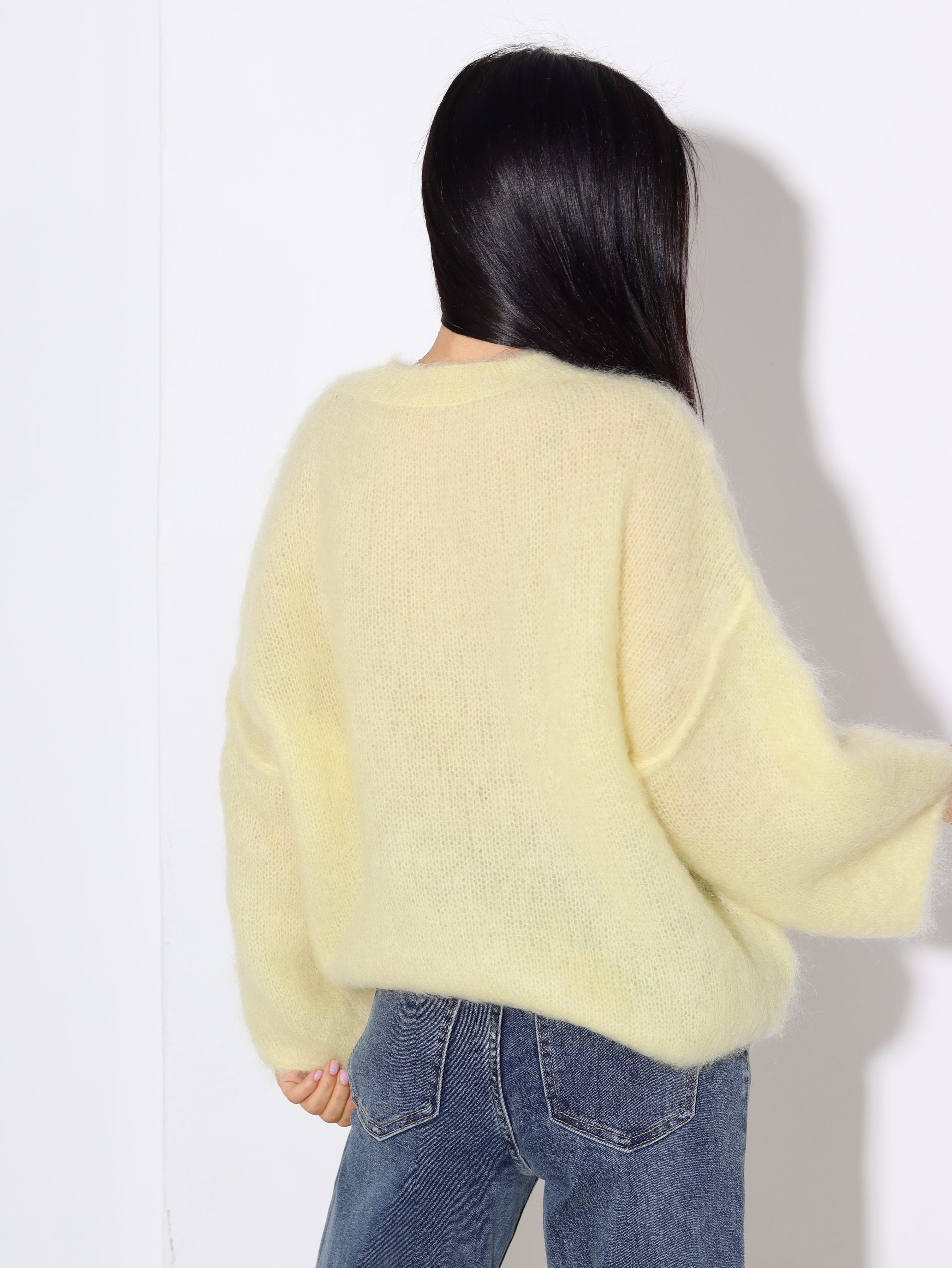 Mohēras džemperis ar noapaļotu kakla izgriezumu, plata rociņas piegriezne, pazemināta plecu daļa, šuvuma vīlīte uz ārpusi. Džemperis brīvā piegriezumā, bez sašaurinājuma apakšmalā