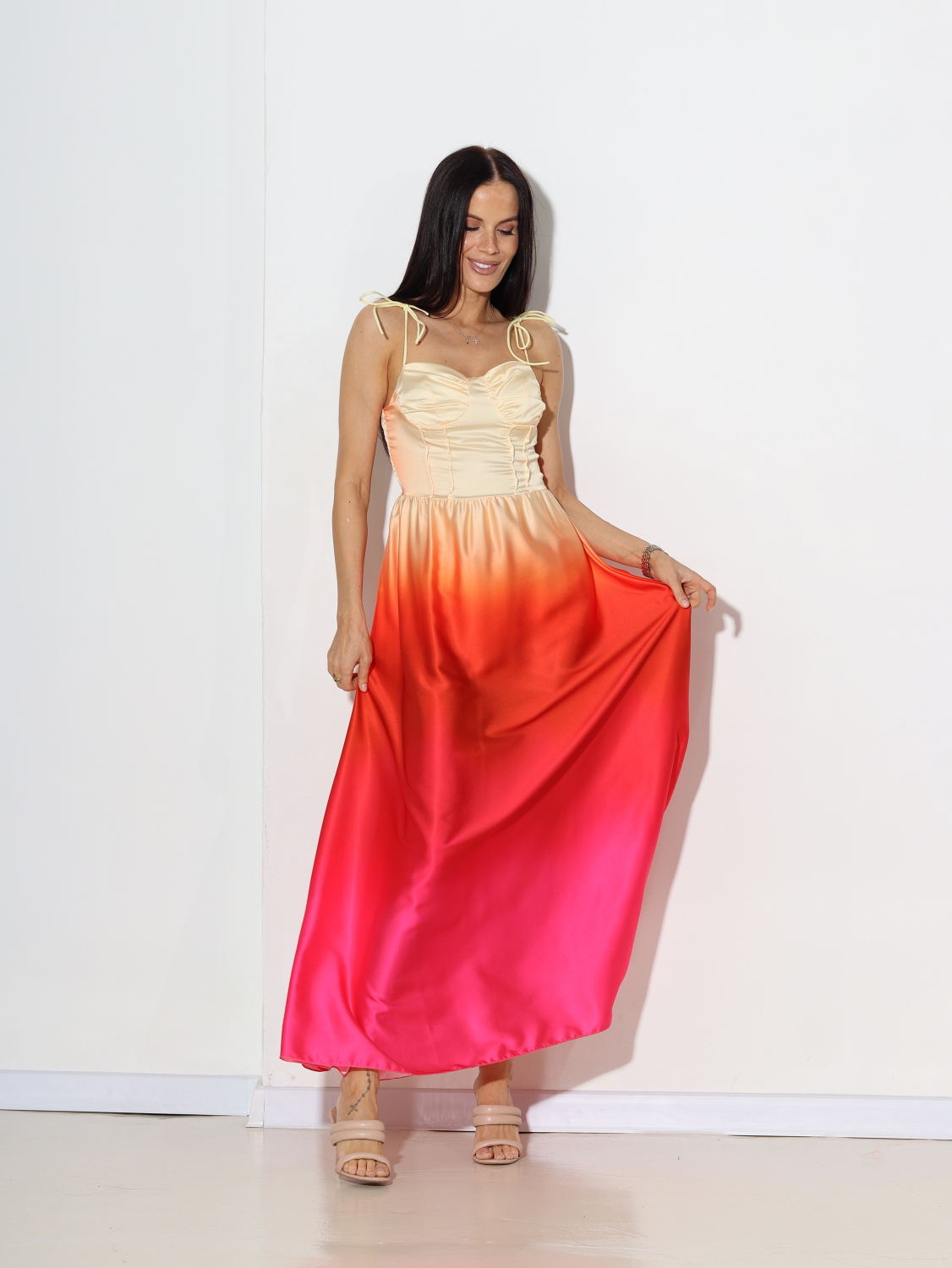 Gara, kāsaina kleita uz smalkām lencītēm (garums ir regulējams). Krūšu daļā ir iešūtas krūšu bļodiņas( nav polsterējums). Mugurpusē ir iestrādātas vairākas smalkas gumijas.