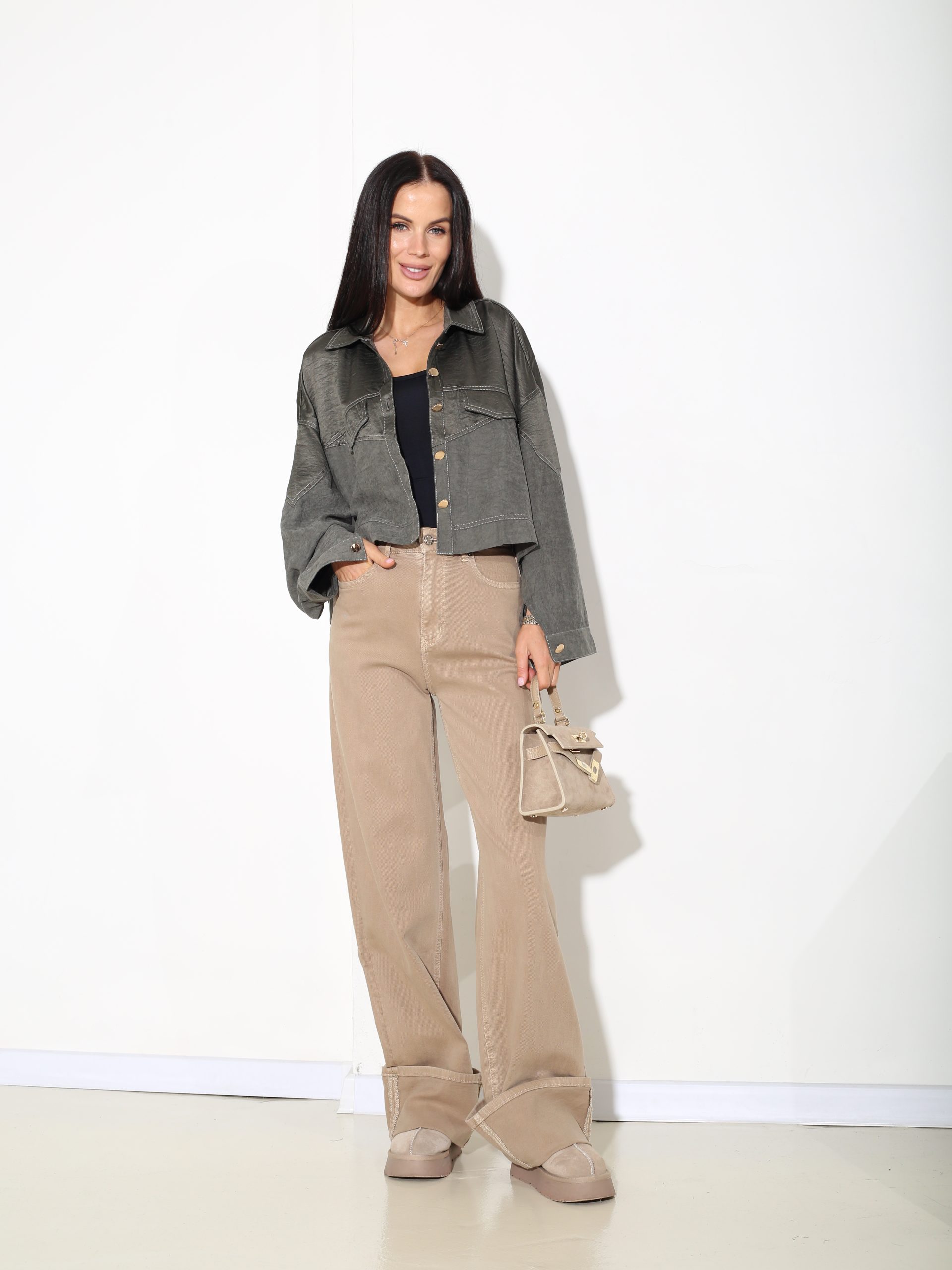 Gaiši brūnas džinsa biksesar atlocītiem bikšu galiem, Laulijas firmas. Biksēm ir paaugstināta jostas vieta, kabatas un rāvējslēdzēja aizdare. Atlokot bikšu galus, bikses ir iespējams pagarināt.