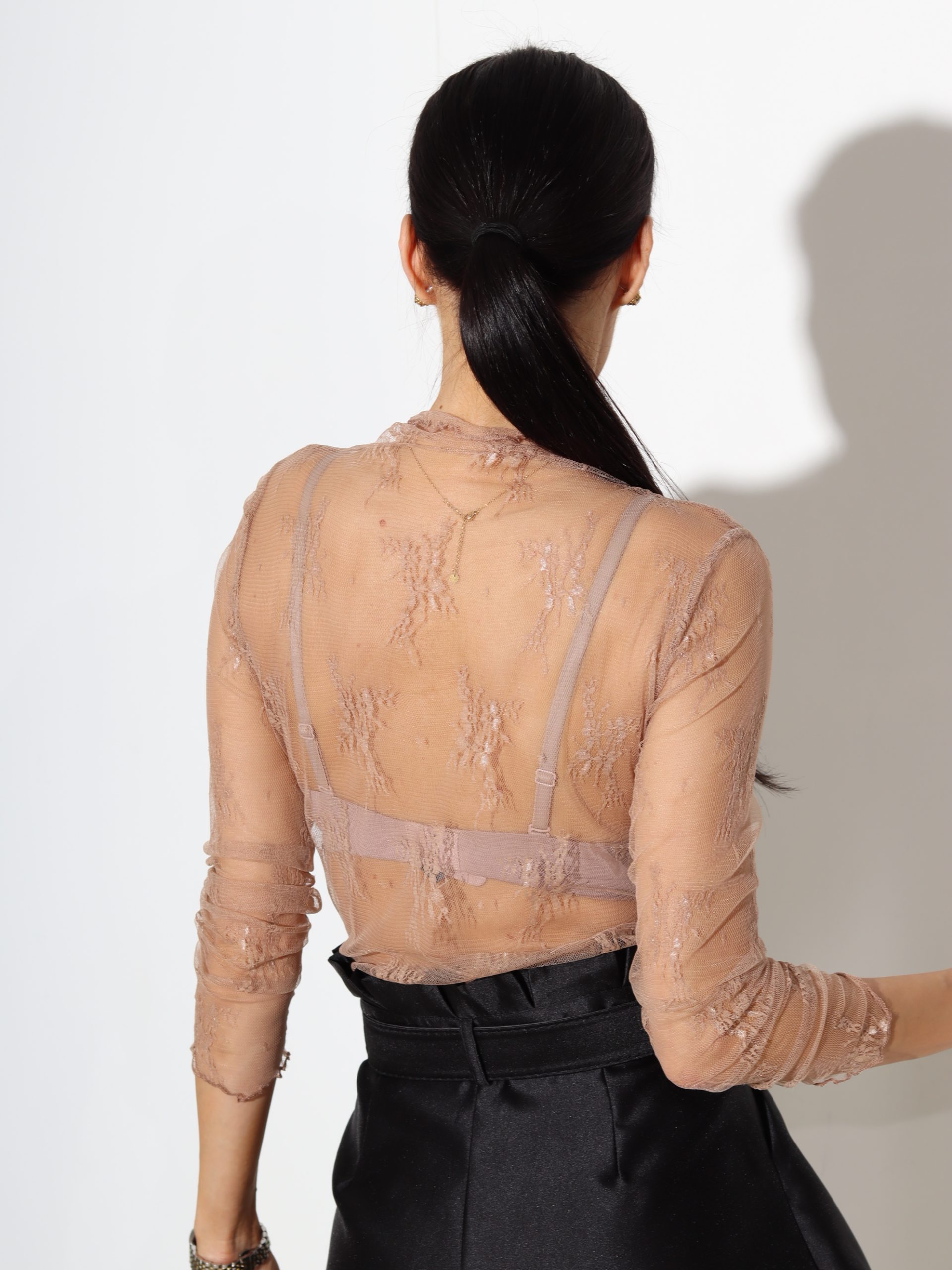 Gaiši brūna, pieguļoša blūze no mežģīņu auduma. Blūzei ir garas piedurknes un paausgtināta kakla daļa.