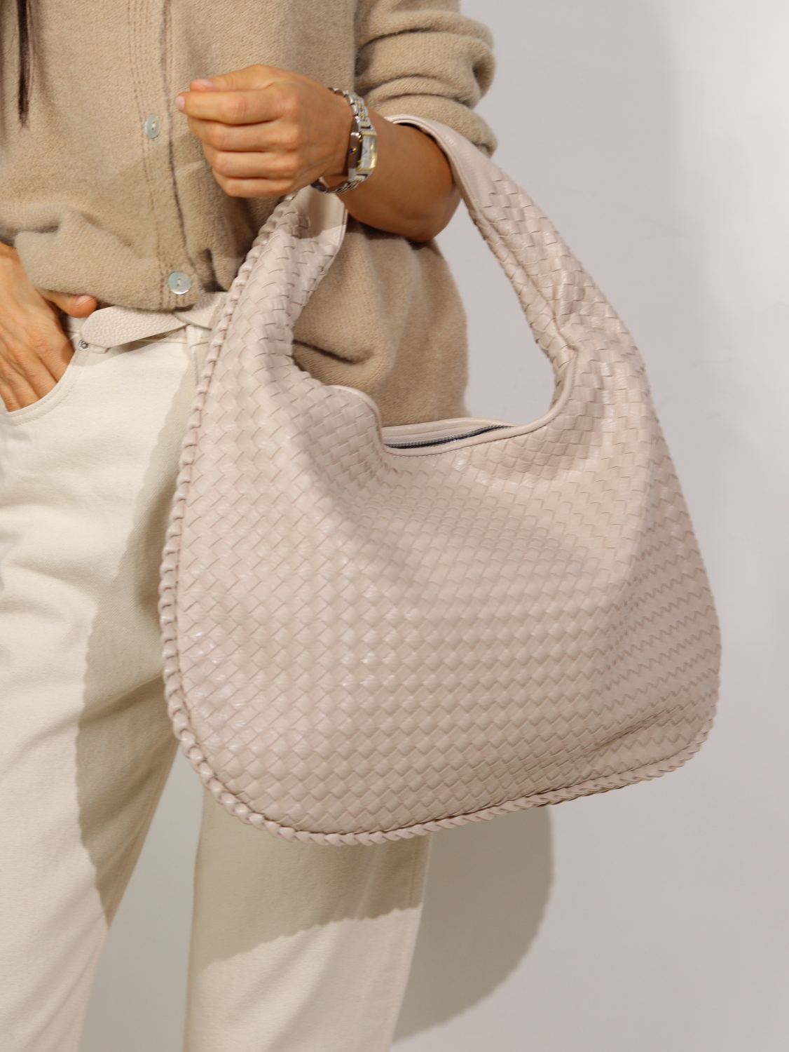 Gaiši rozā krāsas, lielā soma no mākslīgās ādas ar pītu virsmu. Soma ir aizverama ar iestrādātu rāvējslēdzēju. Somas iekšpusē vienā pusē ir ir neaizverama kabata, otrā pusē ir divas kabatas , kuras var aizvēŗt ar rāvējslēdzēju un viens neliels nodalījums.
