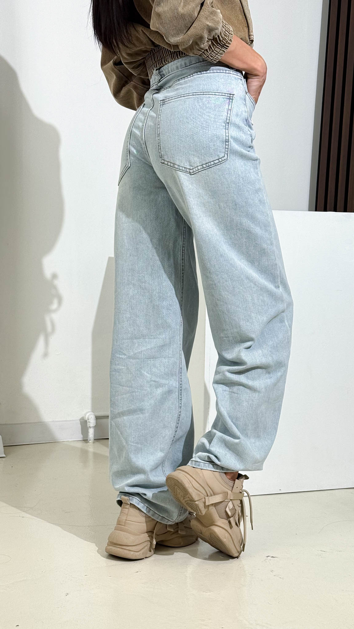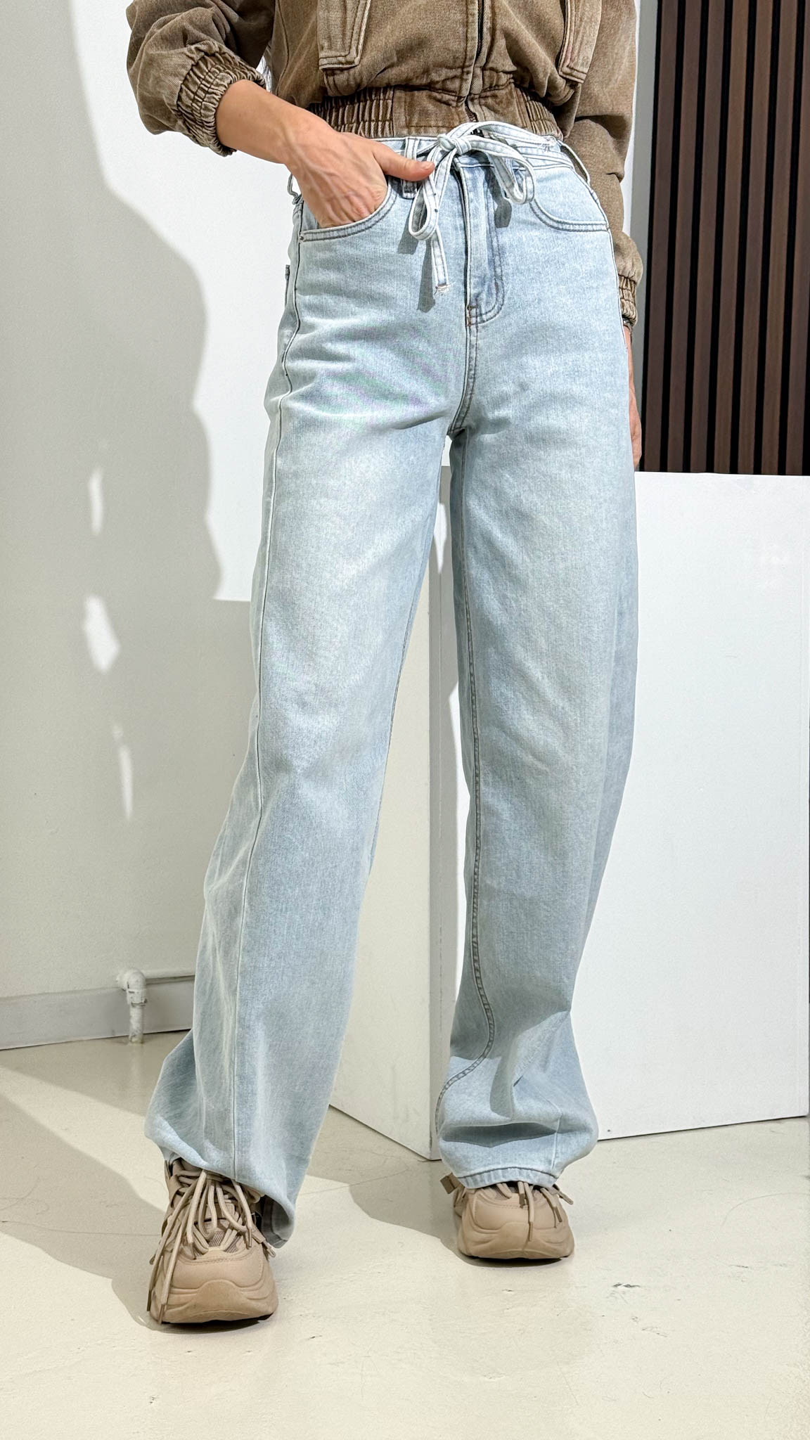 Gaiši zilas ,,Wide Leg” džinsa bikses , biksēm ir paaugstināta jostas vieta, kabatas un dekoratīvas iešuves , komplektā nāk džinsa josta/ aukliņa.