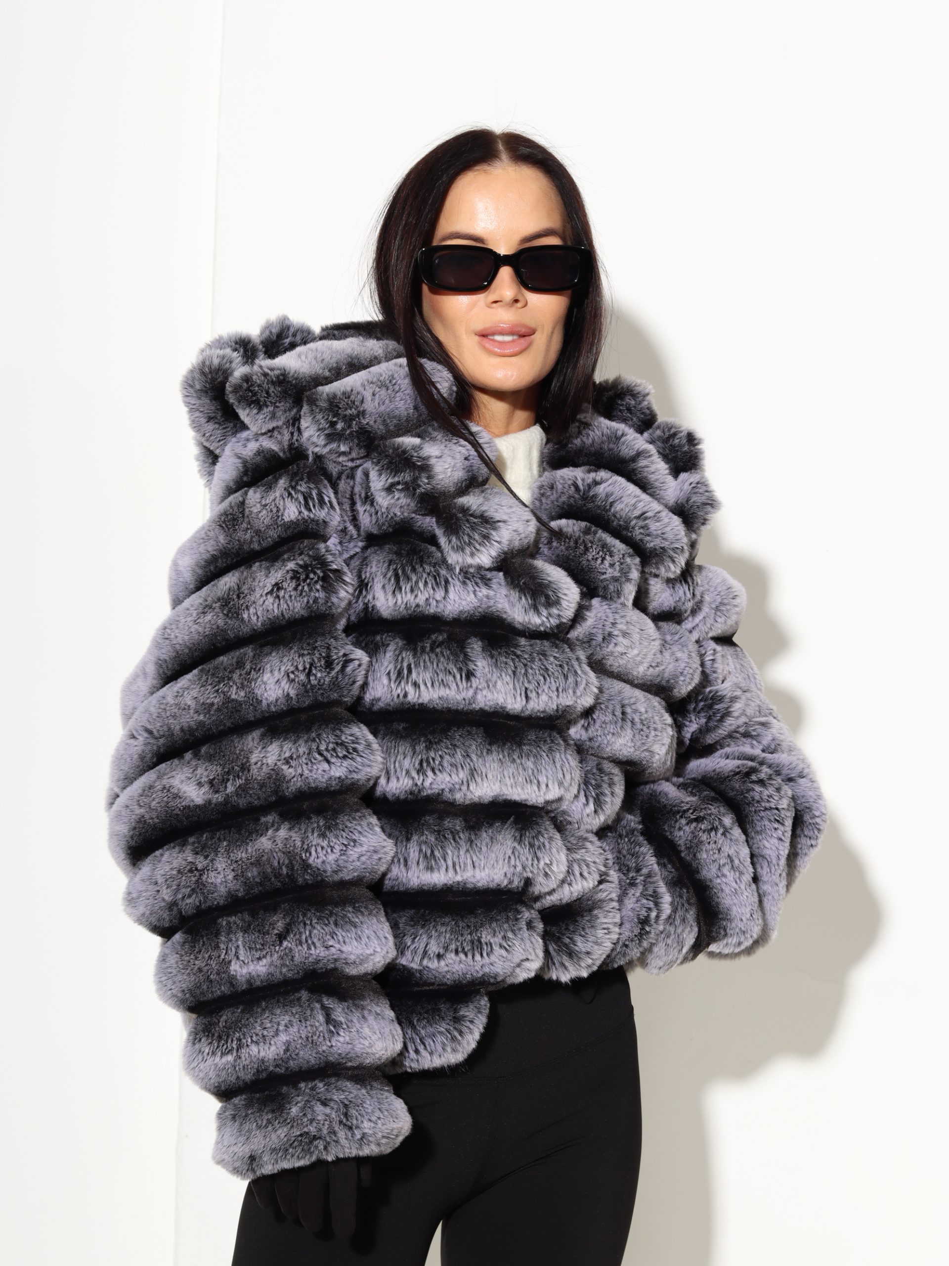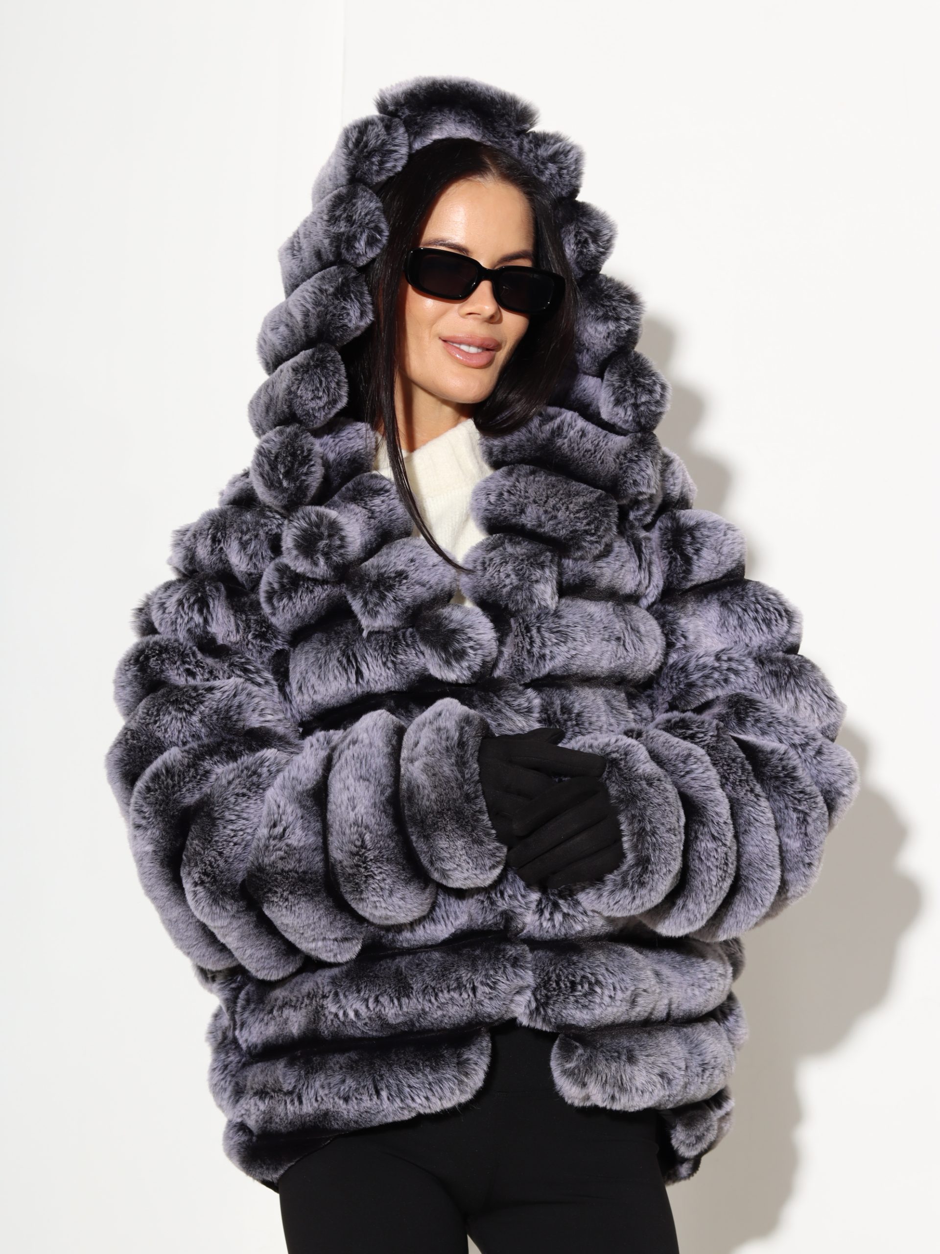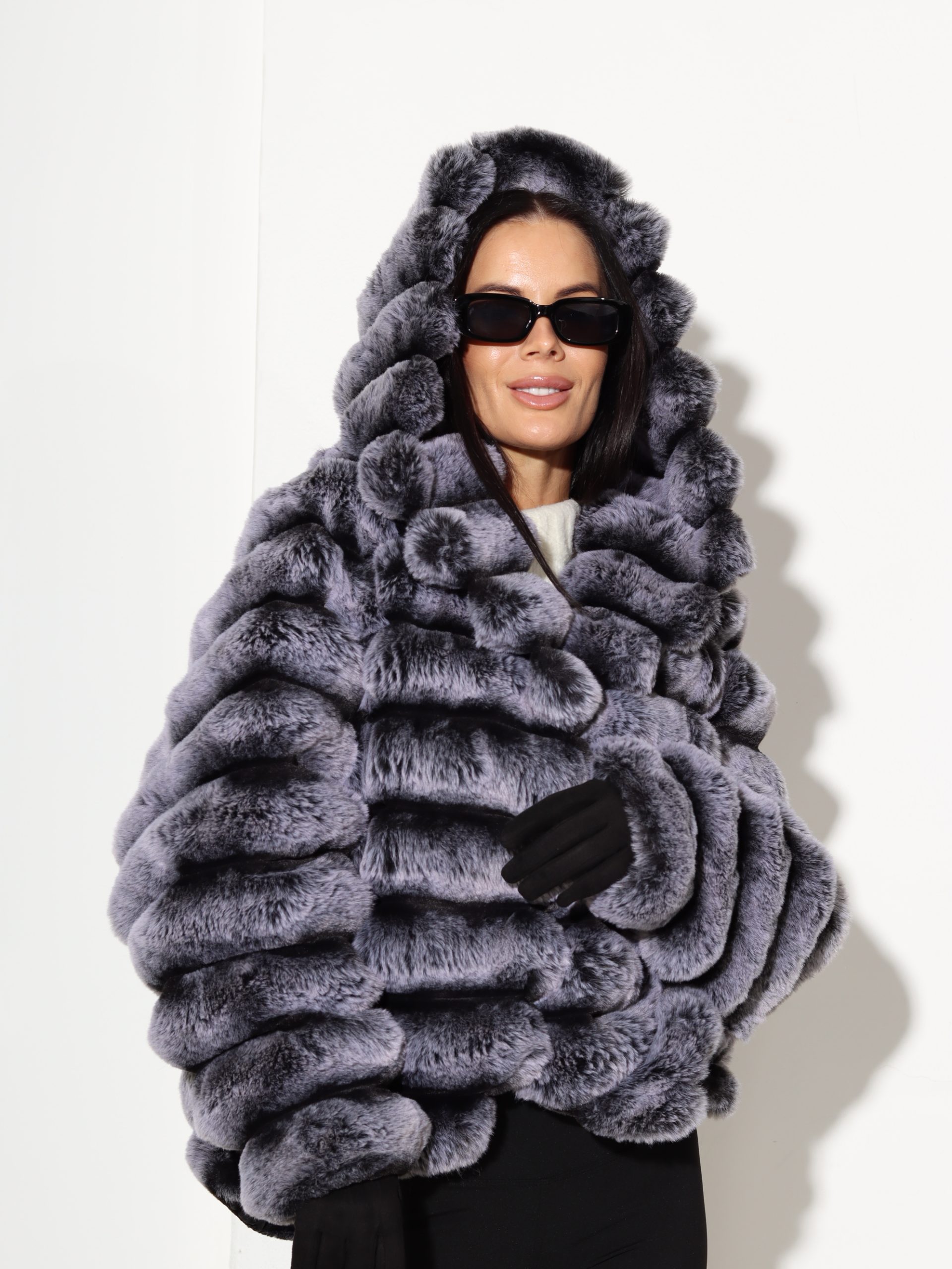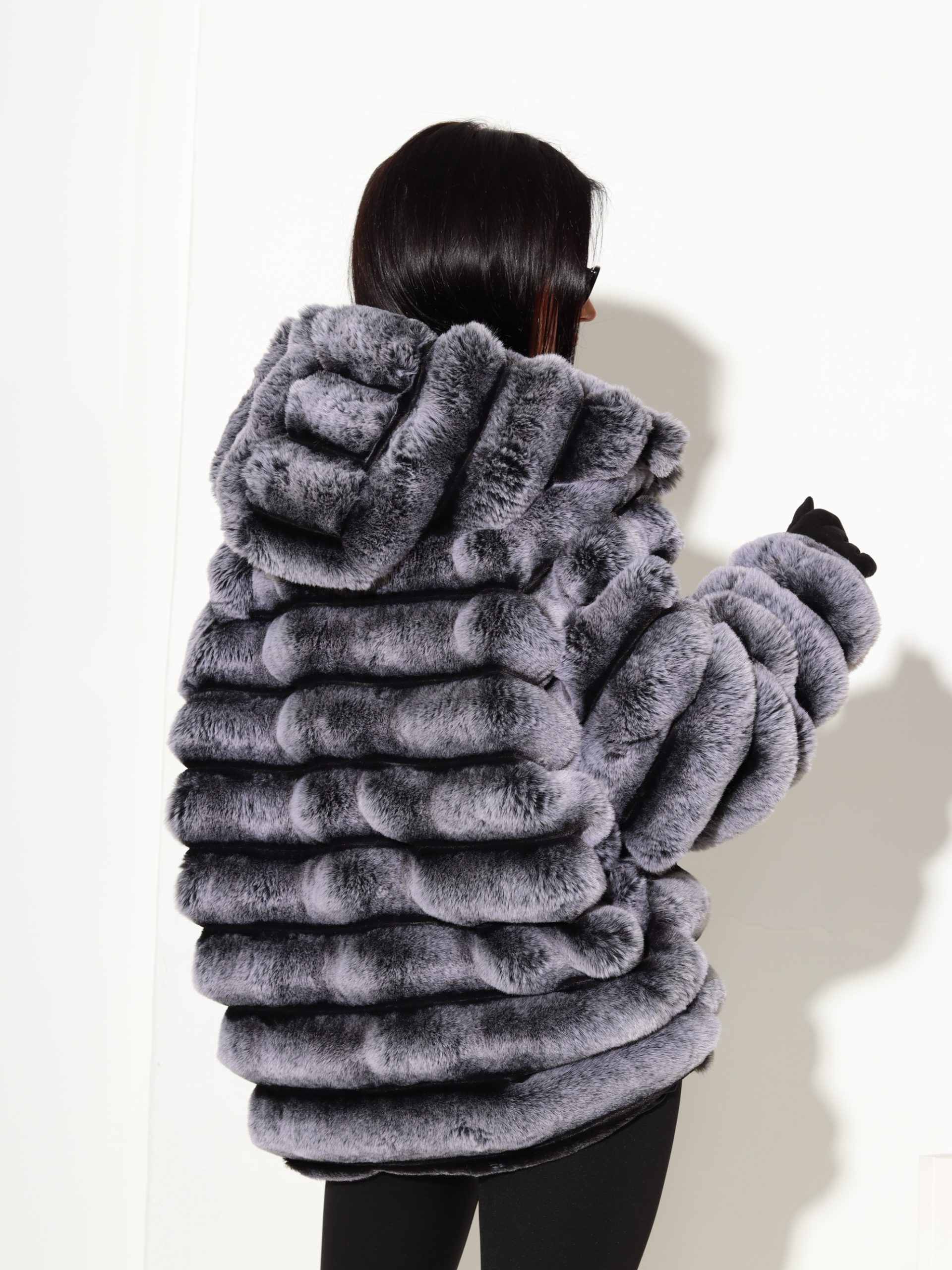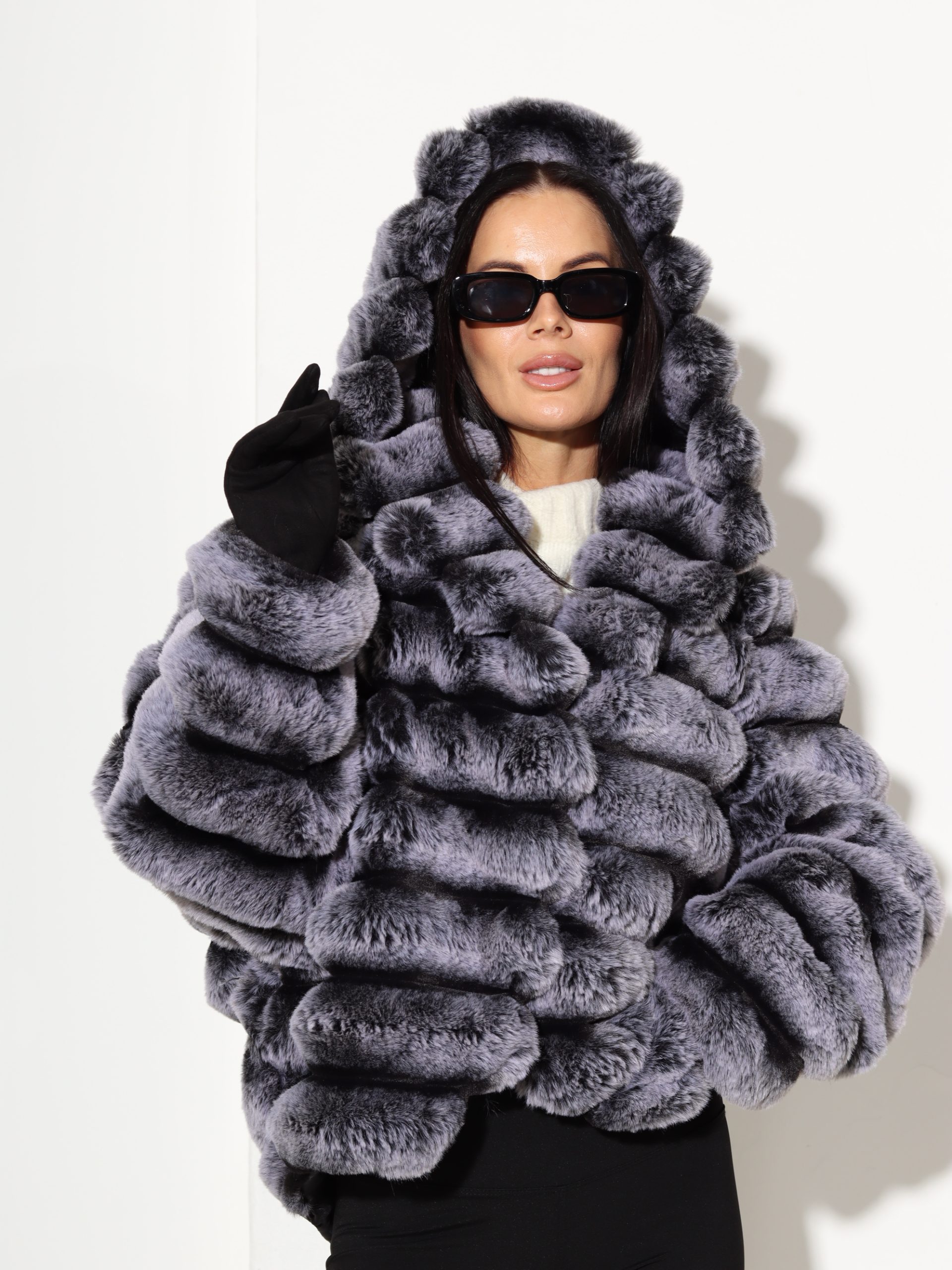 Baltas + pelēkas krāsas, horizontāli frakcionēts kažoks ar kapuci. Kažokam ir kabatas un pieskaņotas krāsas odere.