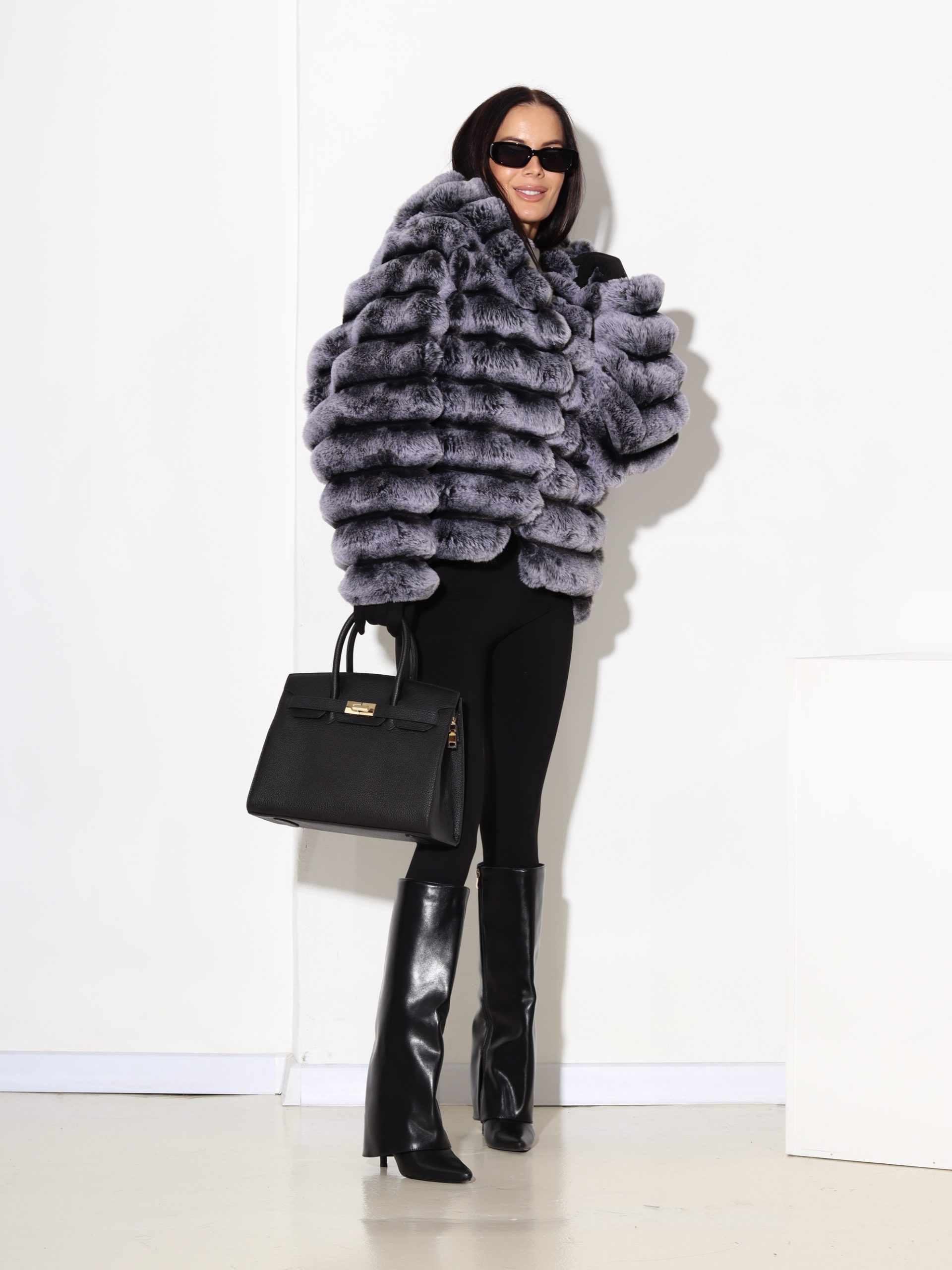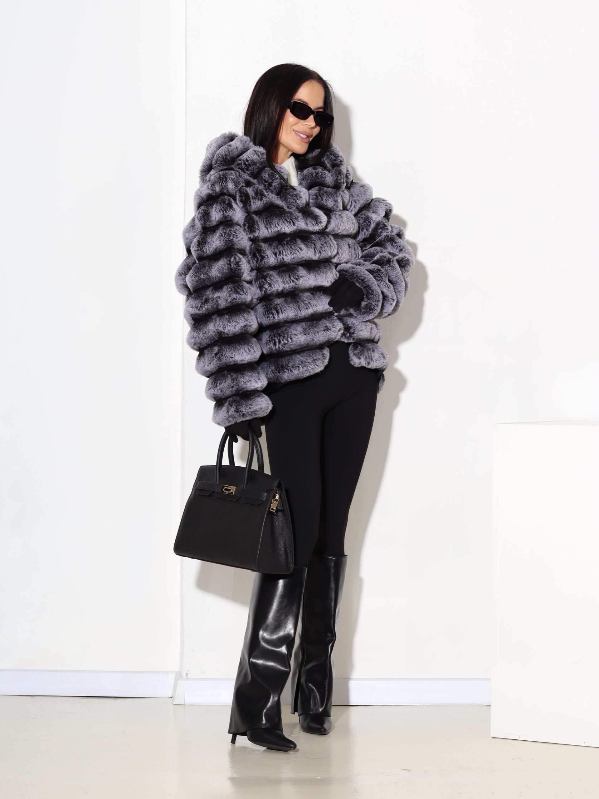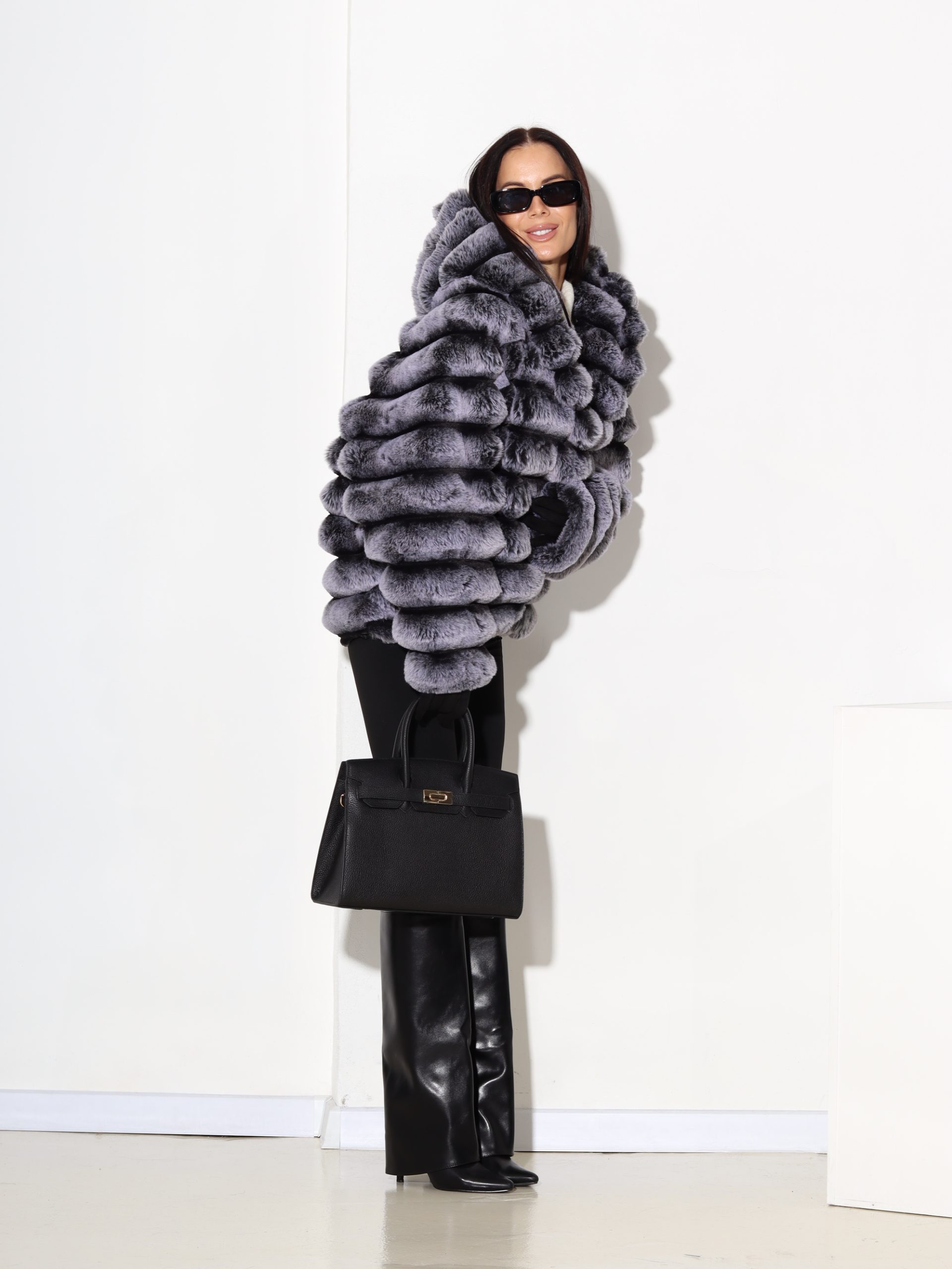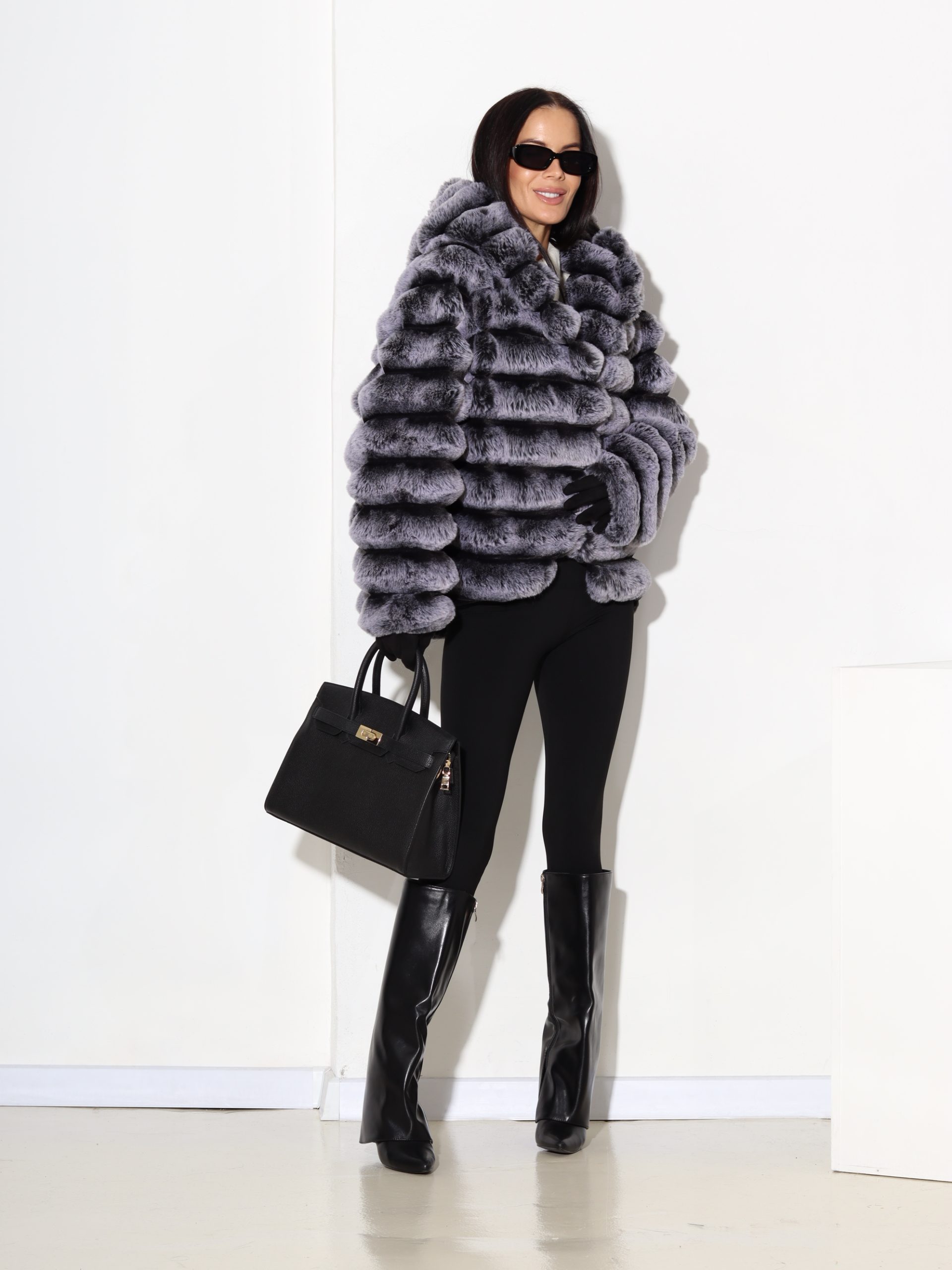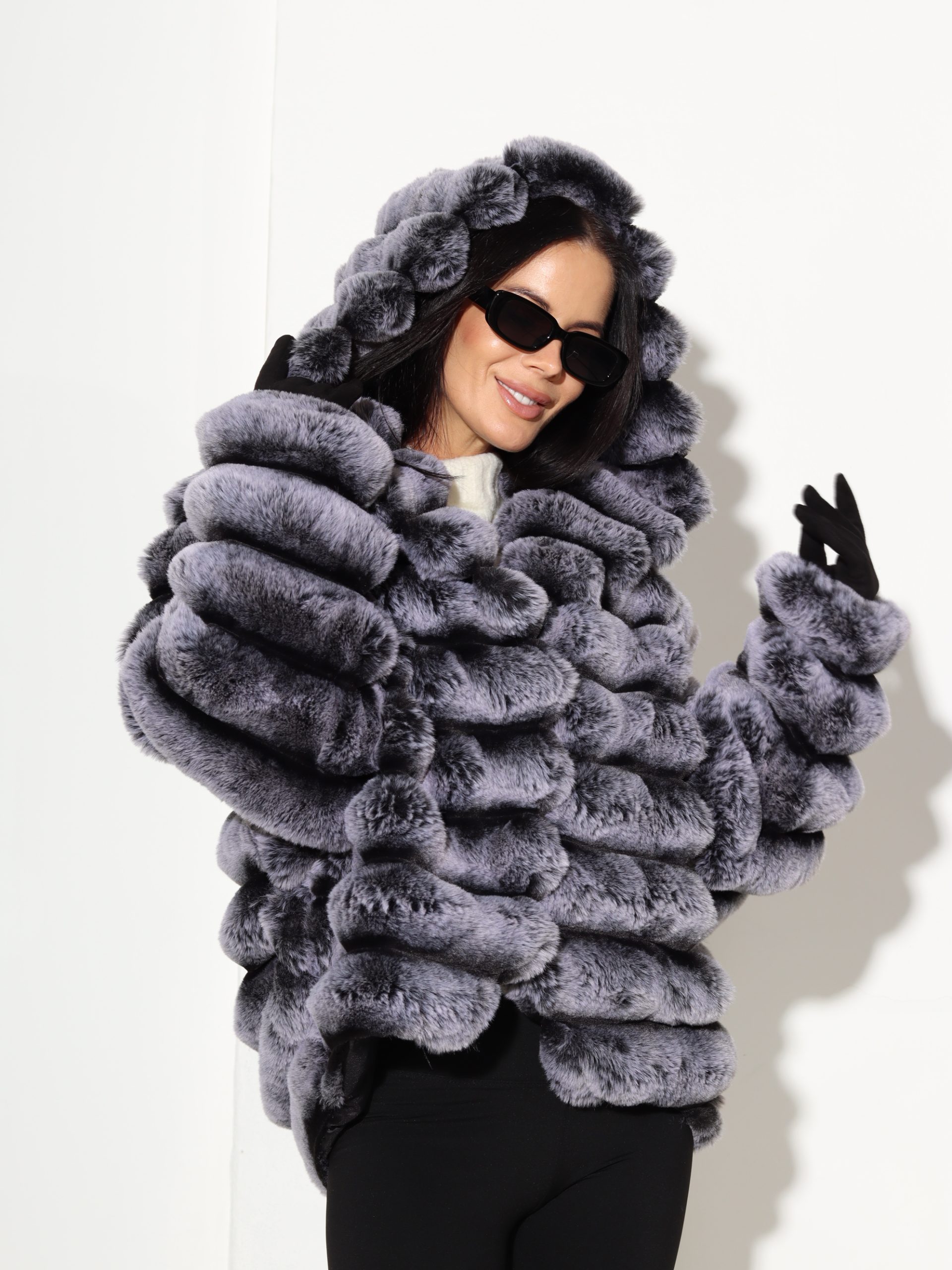 Baltas + pelēkas krāsas, horizontāli frakcionēts kažoks ar kapuci. Kažokam ir kabatas un pieskaņotas krāsas odere.