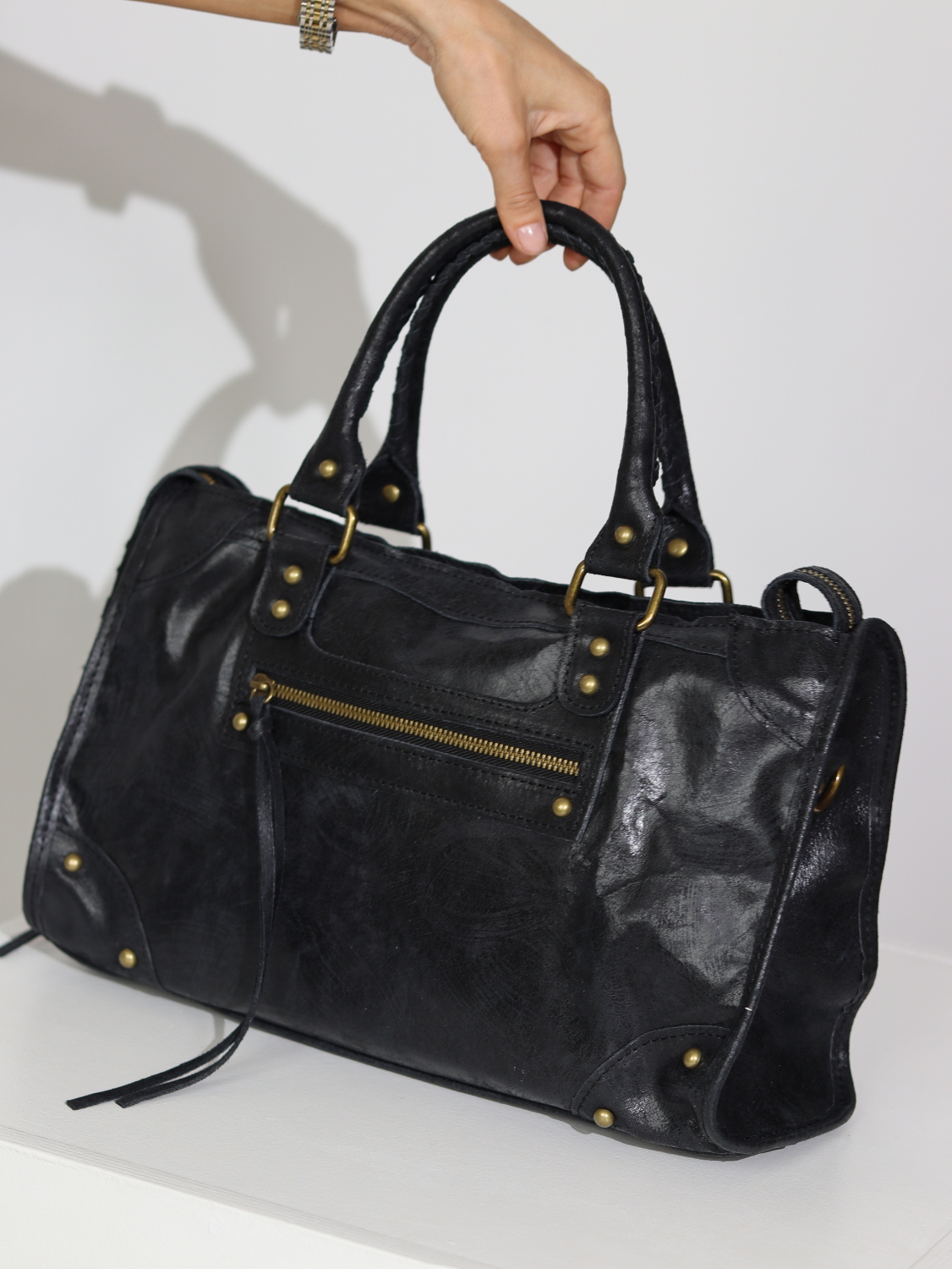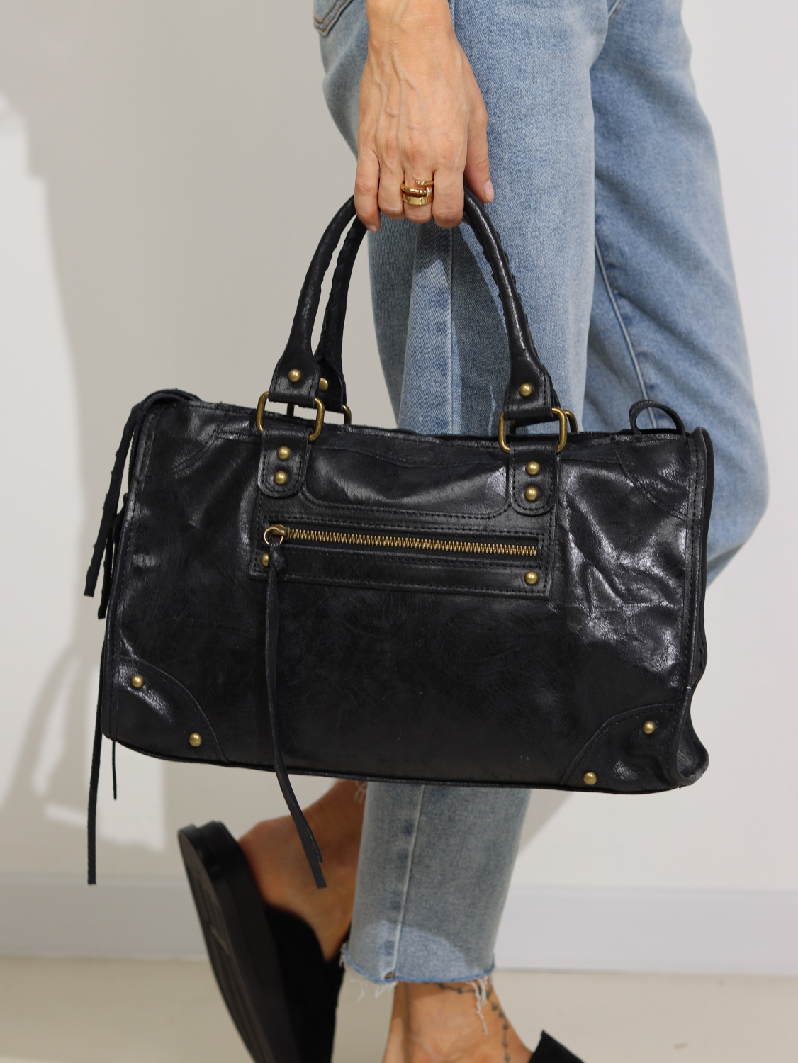 Brūna, dabīgās ādas soma “Vintage maxi” ar iestrādātu dubultu rāvējslēdzēju. Priekšpusē ir iestrādāta maza , ar rāvējslēdzēju aizvērama kabata. Somas iekšpusē vienā pusē ir iešūta neaizverama kabata, bet otrā pusē ir iešūta ar rāvējslēdzēju aizverama kabata.