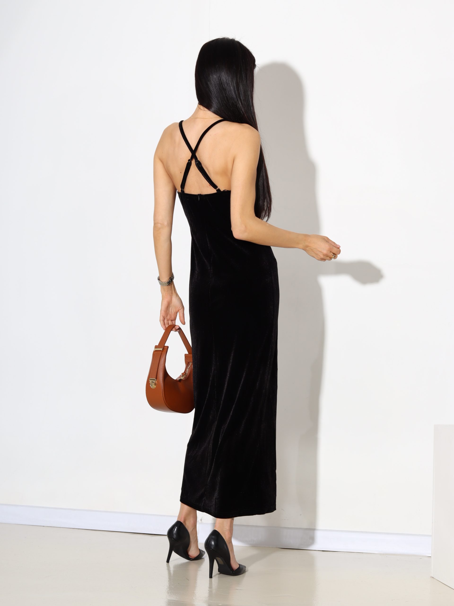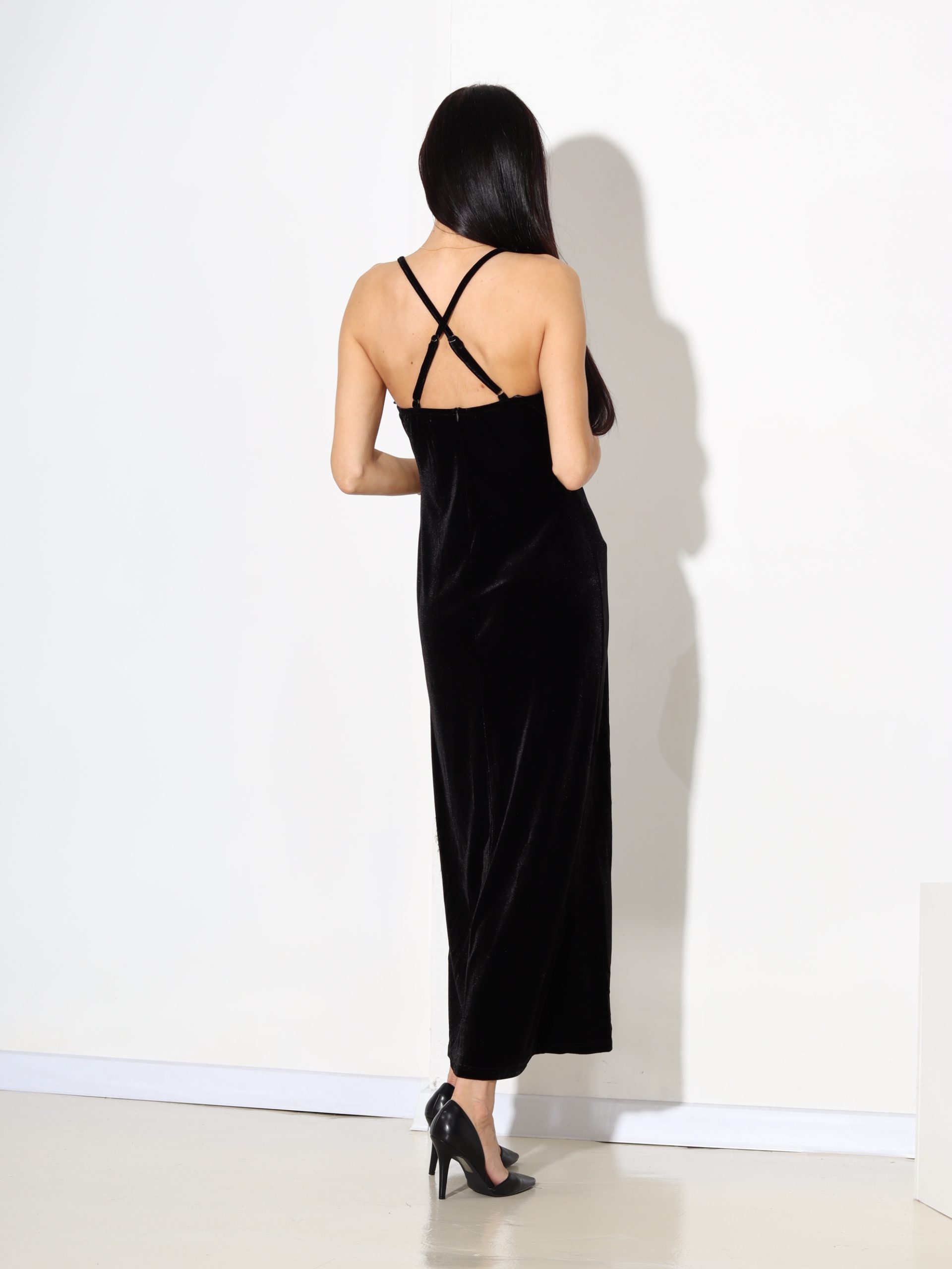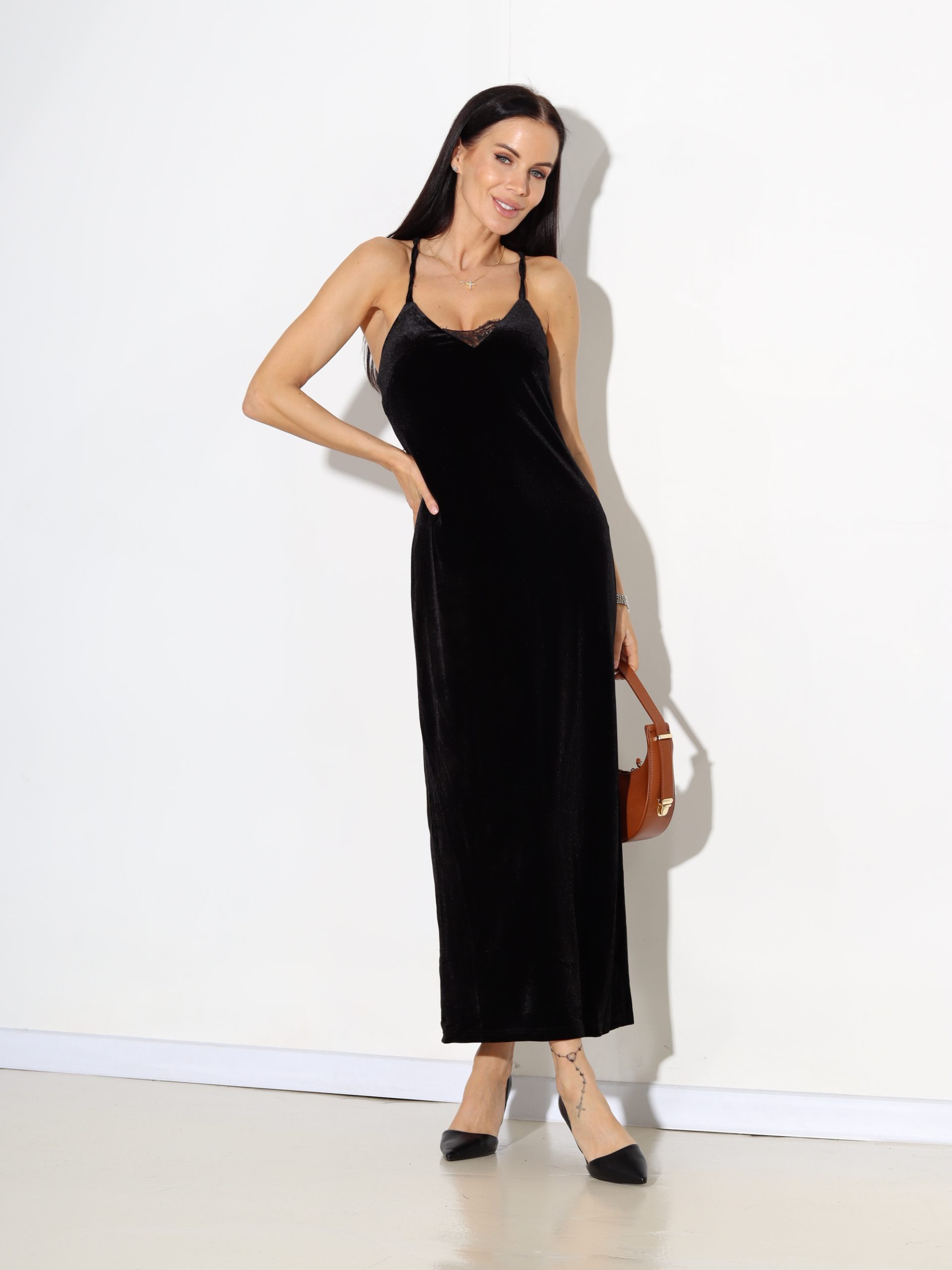 Melna gara samta auduma kleita uz smalkām lencītēm – 17655