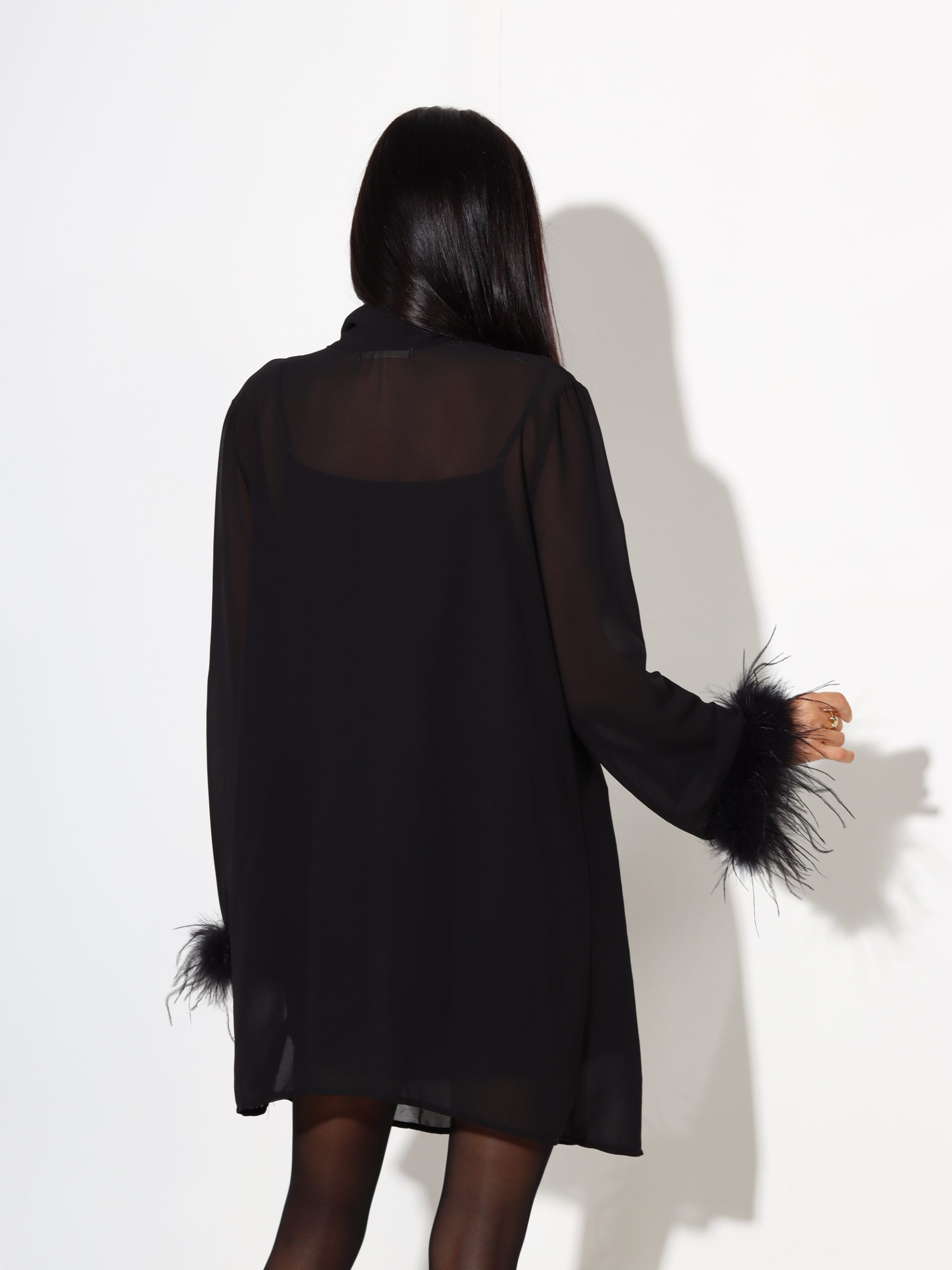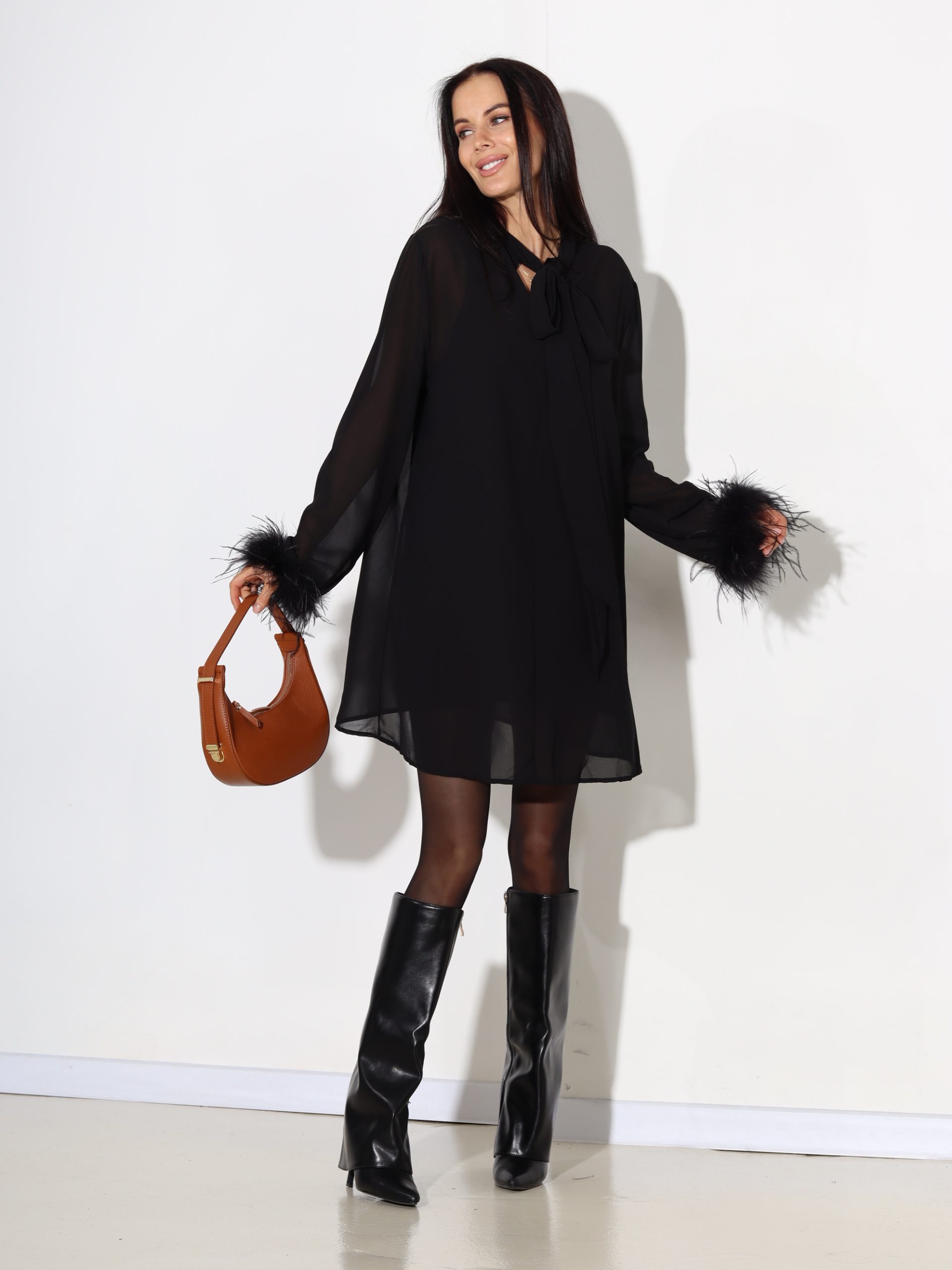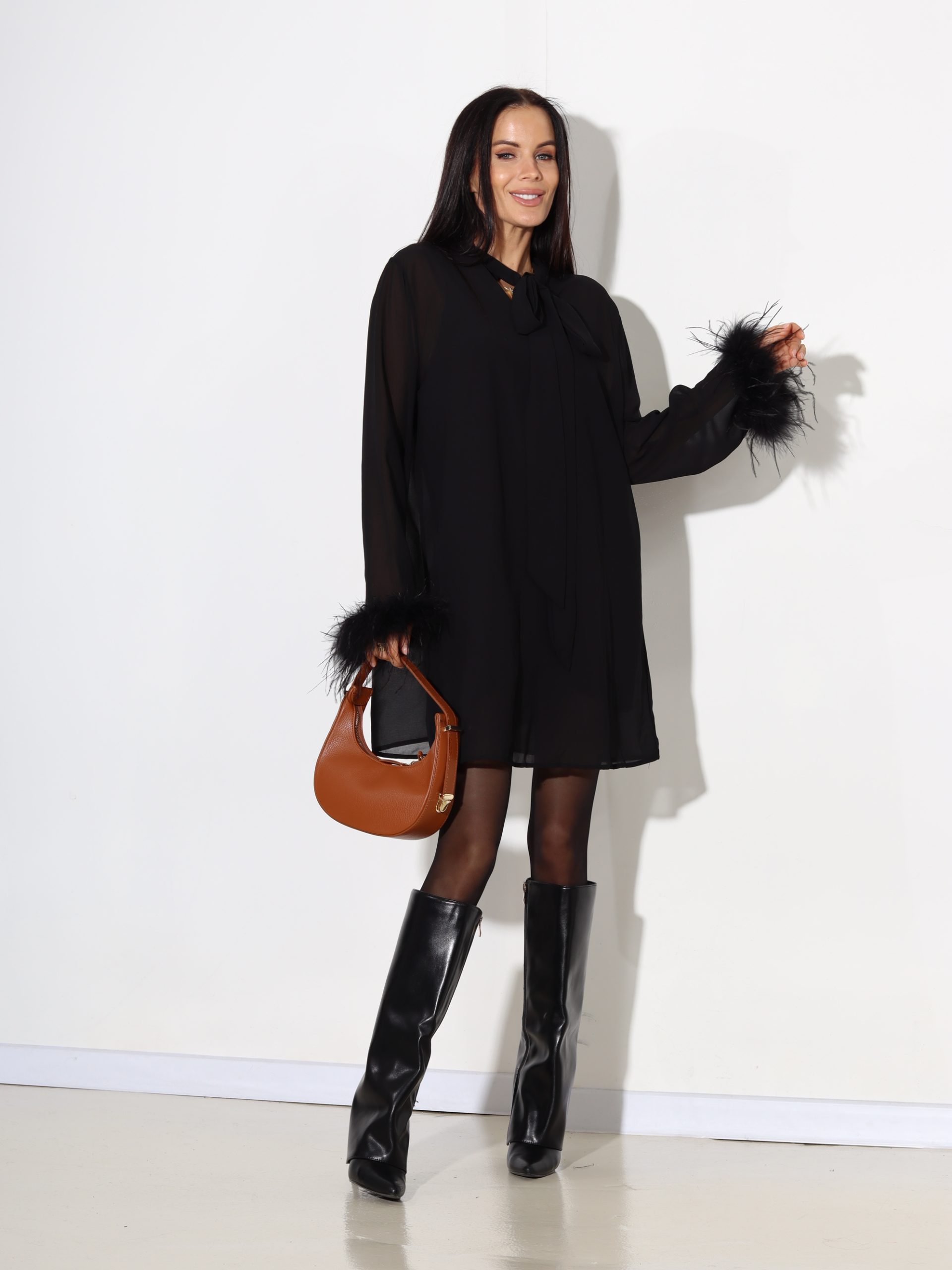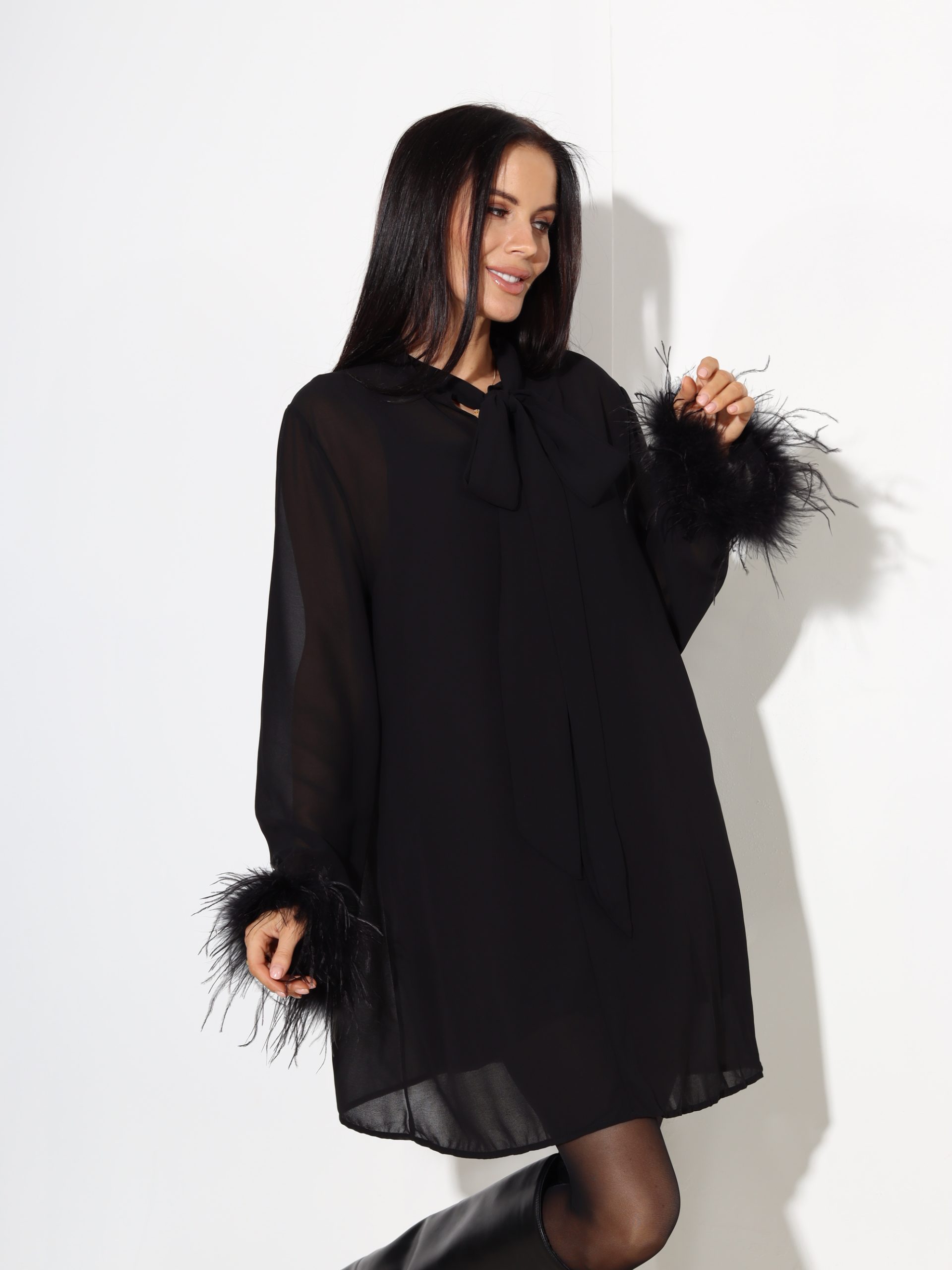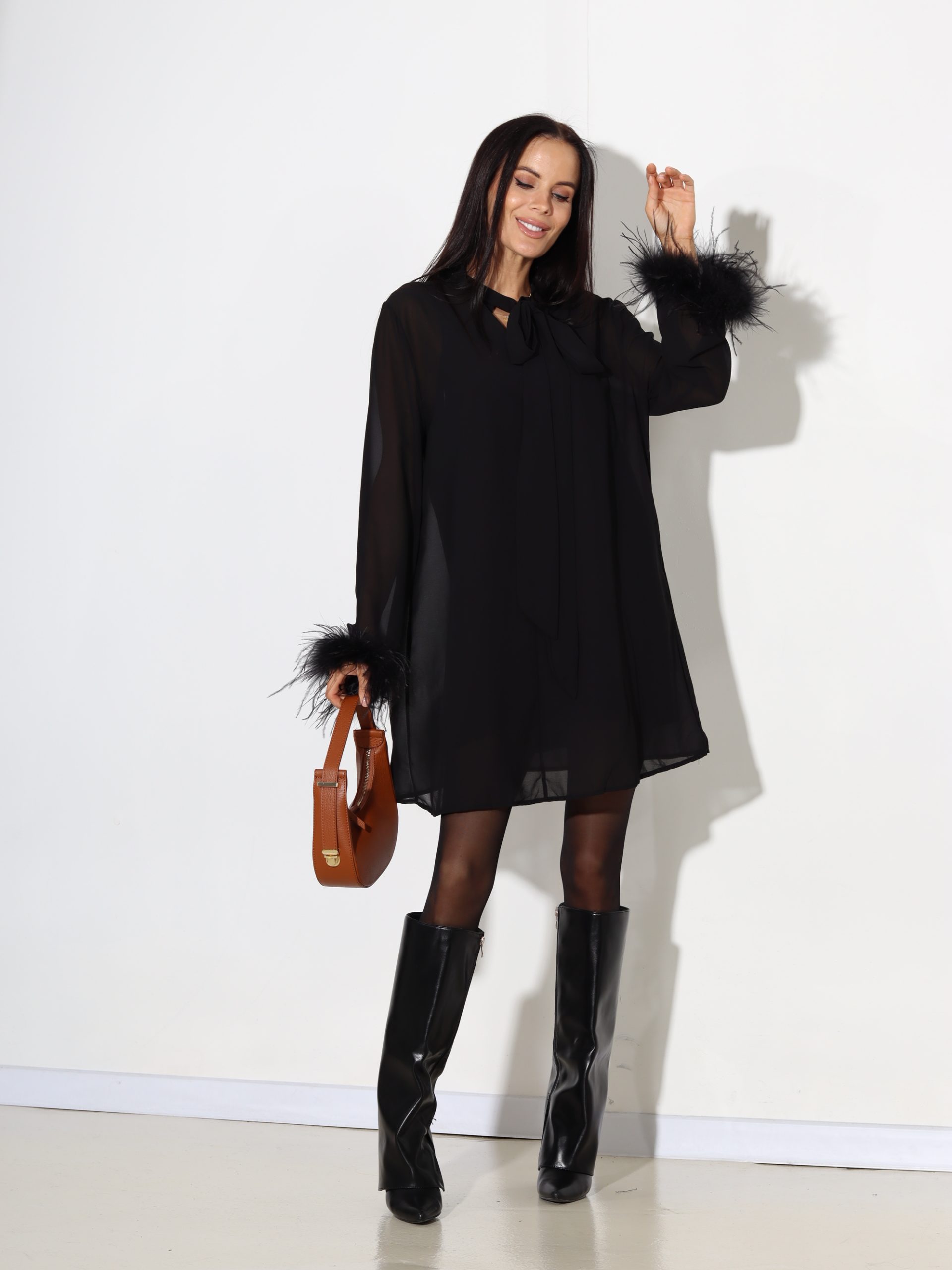Melna kleita ar garām piedurknēm , kakla daļu iepējams sasiet ar lenti bantītē. Kleitai piedurknēs ir uzšūtas dekoratīvas spalvas , kā arī kleitai ir apakškleita uz smalkām lencītēm.
