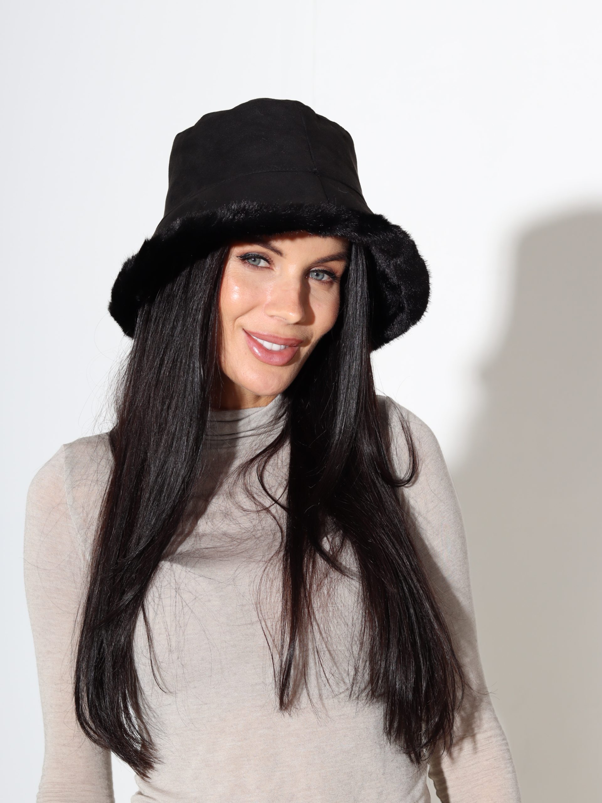 Mākslīgās zamšādas, stingra, “Bucket” tipa cepure, kuru ir iespējams velkāt uz adām pusēm. Viena puse ir mākslīgās zamšādas, bet otra- pūkaina.