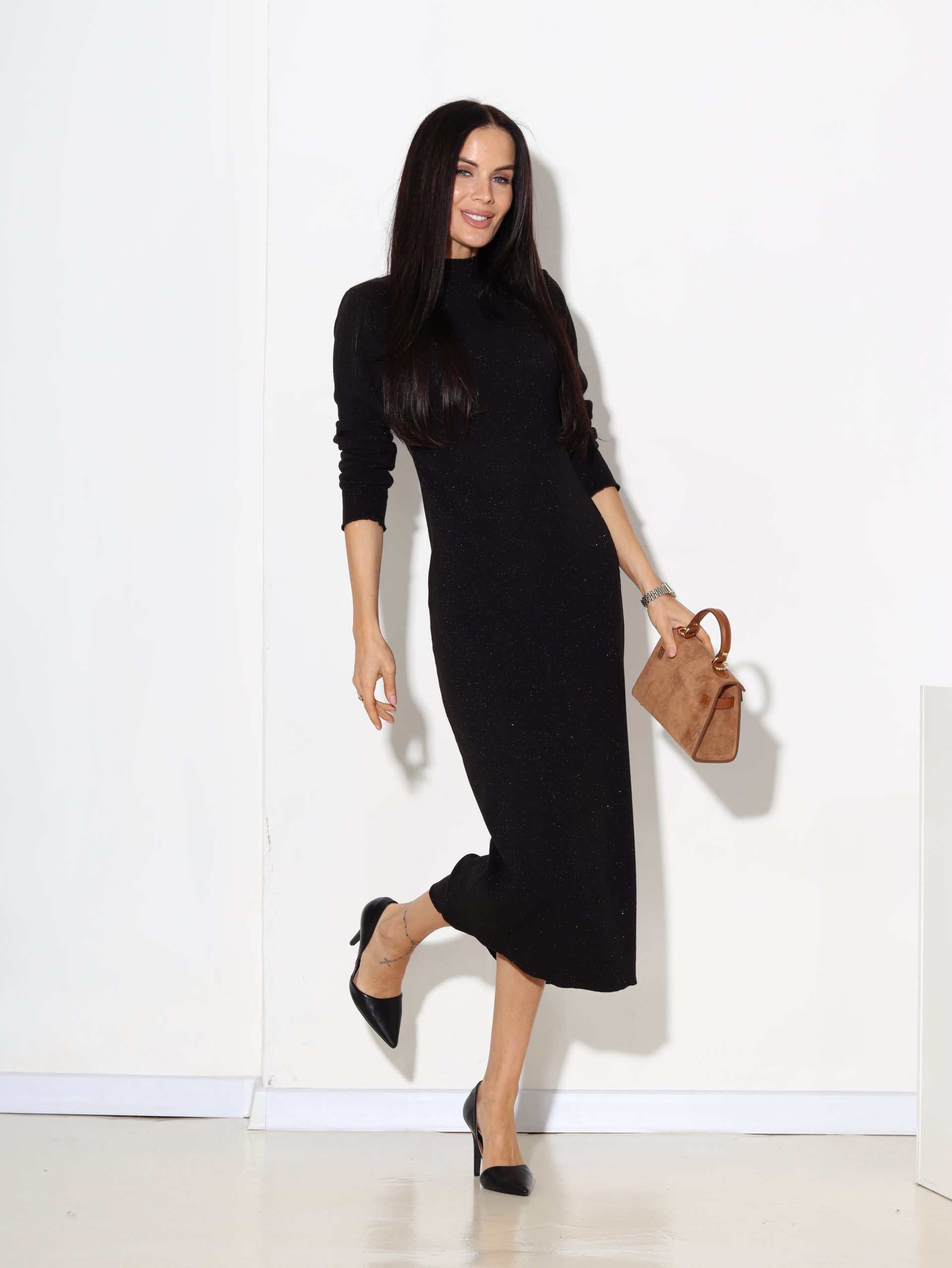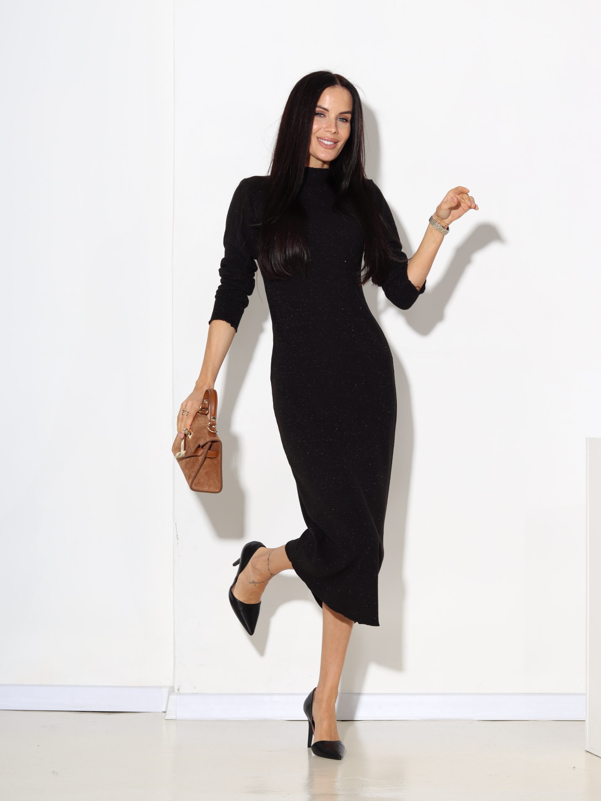 Midi garuma kleita adīta auduma ar iestrādātu mirdzošu diedziņu, kleita ir pieguļoša augumam, nav aizdares, mini paaukstinājuma apkakle, garas piedurknes