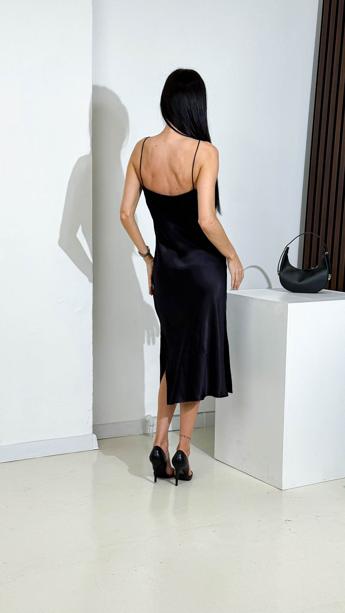 Midi garuma kleita, slīpgriezumā uz smalkām lencītēm. Kleitiņa zīdīga materiāla ar mitruma efektu, brīvi krītoša, sānā šķēlumi