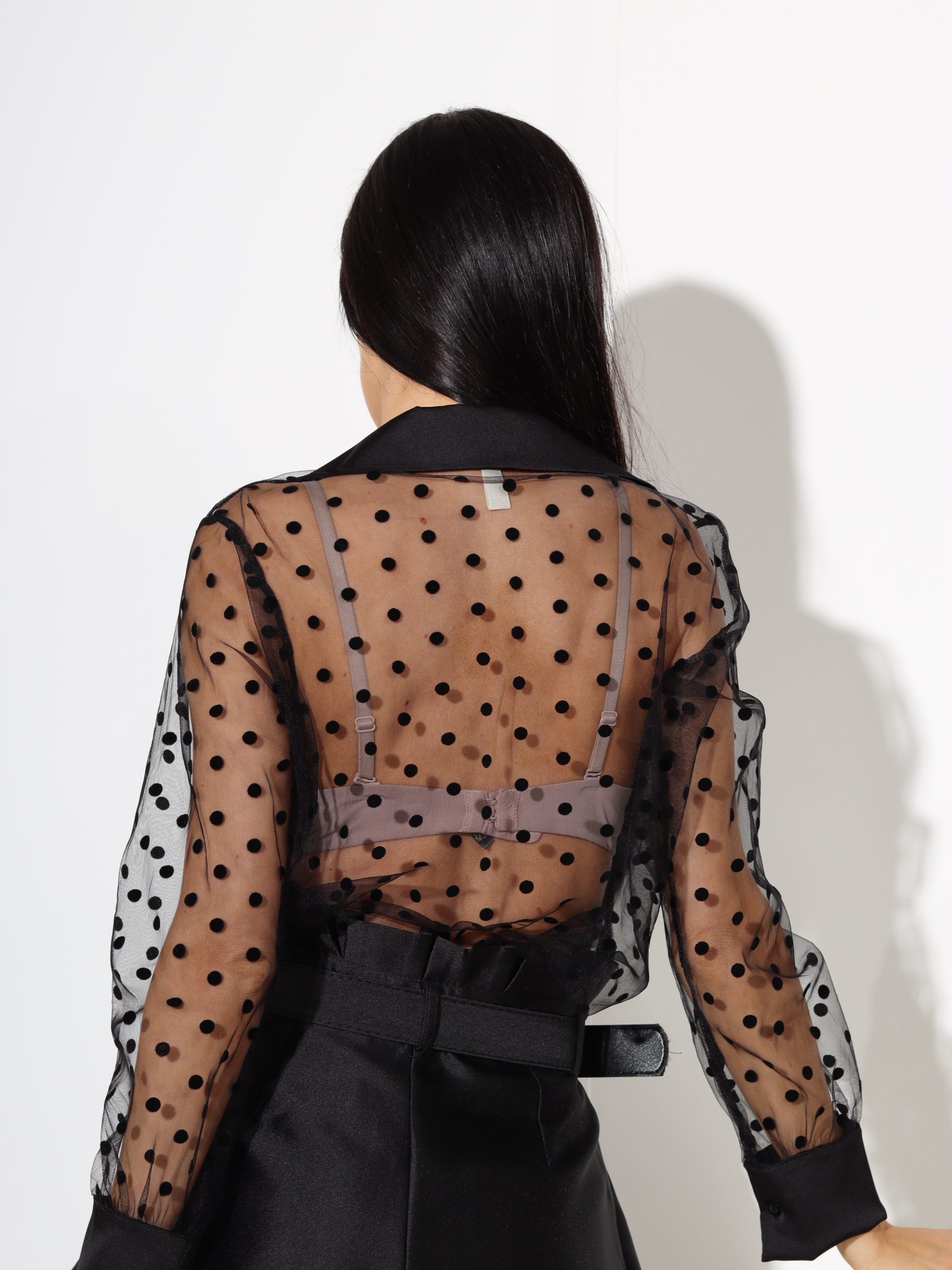 Melnas krāsas,, Pumpiņu” klasiska tilla blūze ar garām piedurknēm, aizdari uz pogām un klasisku kakla atloku .