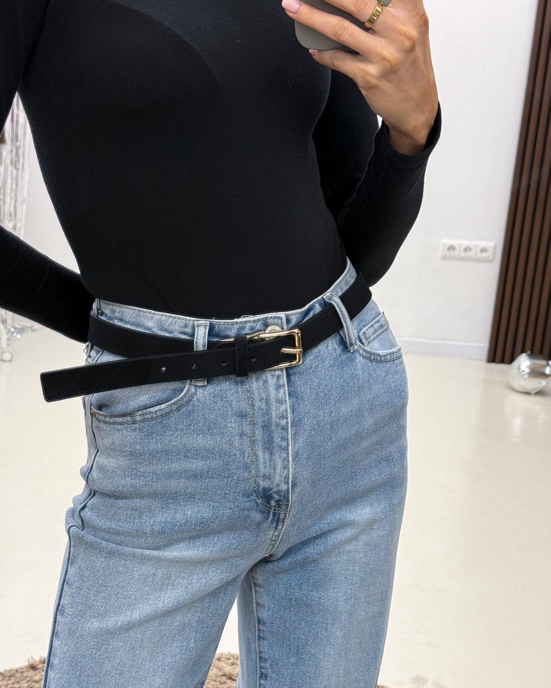Dabīgās zamšādas josta ar zelta furnitūras sprādzi.