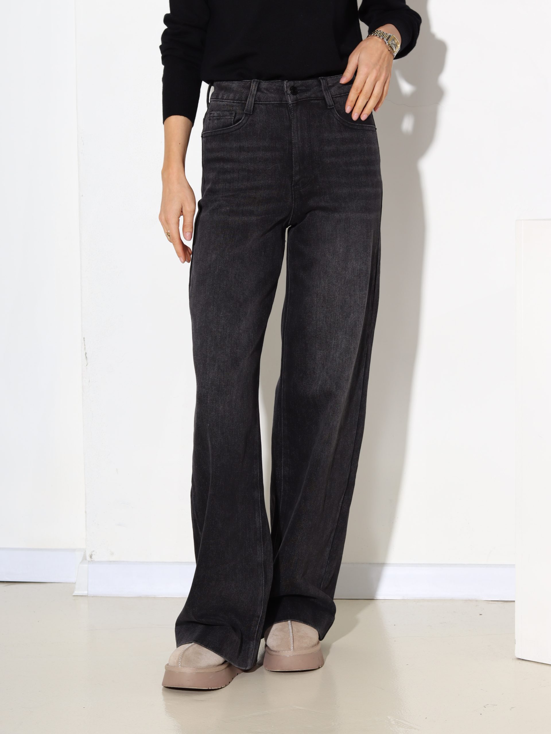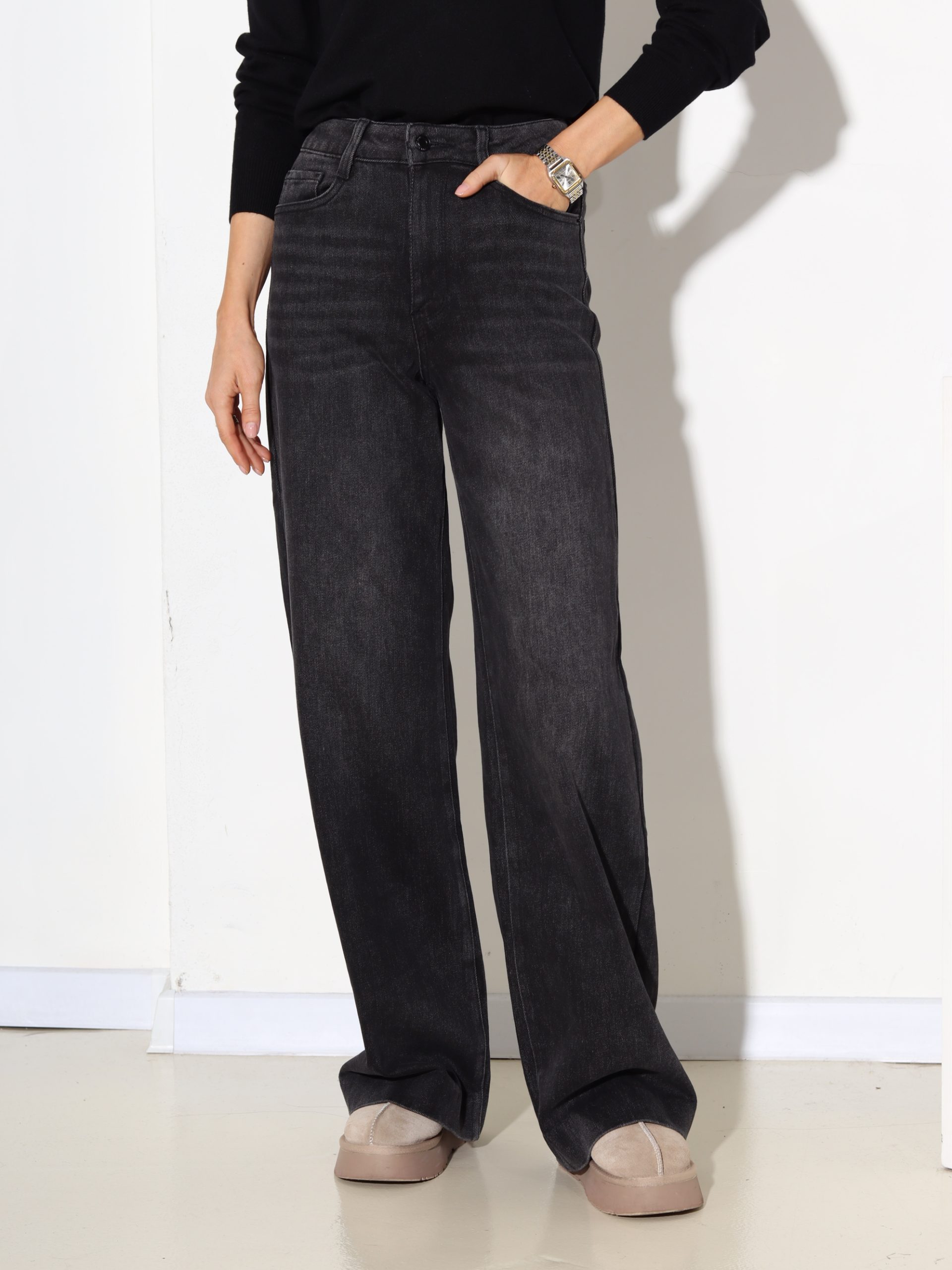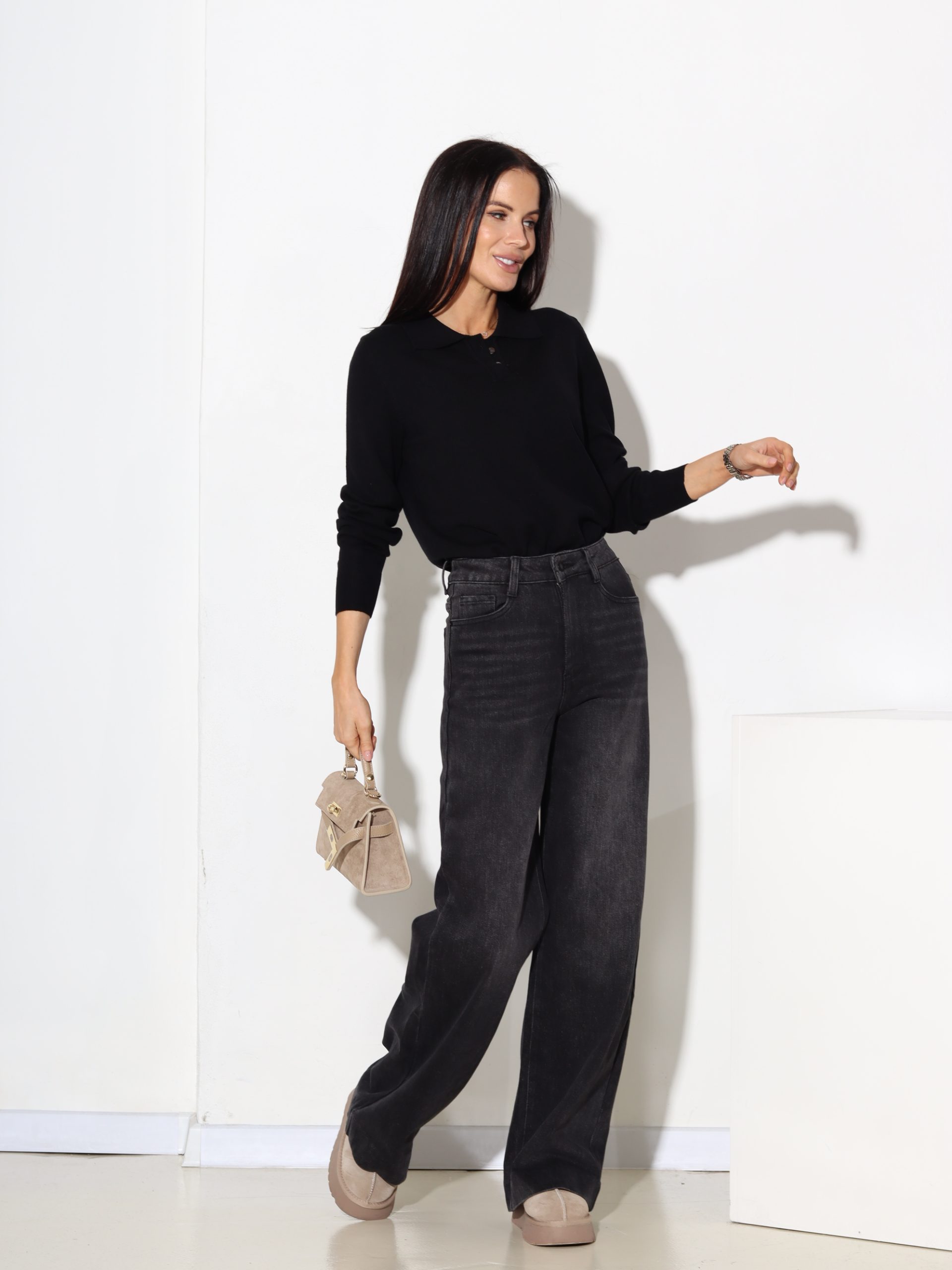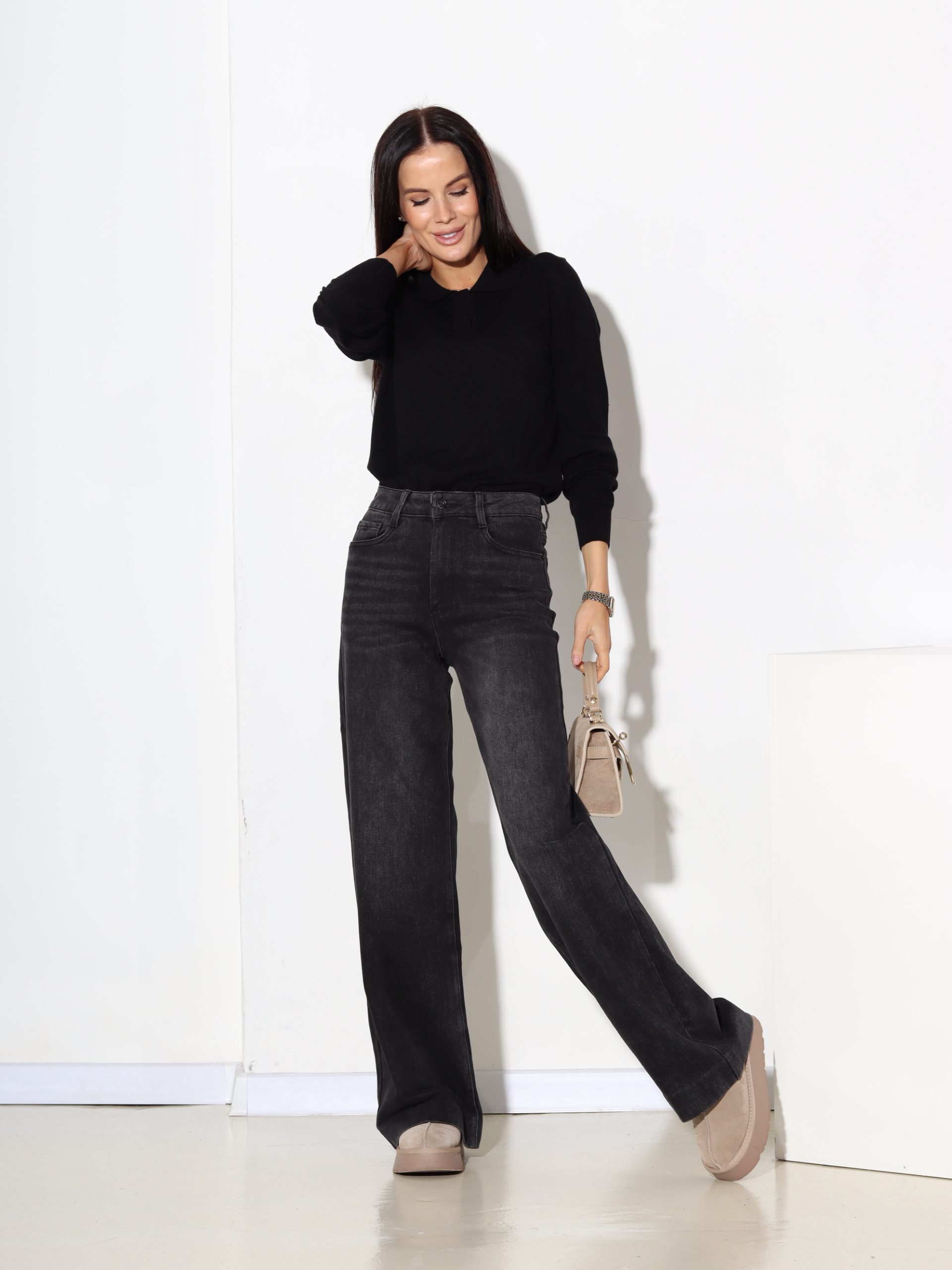 Melnas džinsa bikses ar balinājuma efektu, Laulijas firmas ‘Full length’ modeļa bikses, biksēm ir paaugstināta jostas vieta, kabatas un rāvējslēdzēja aizdare