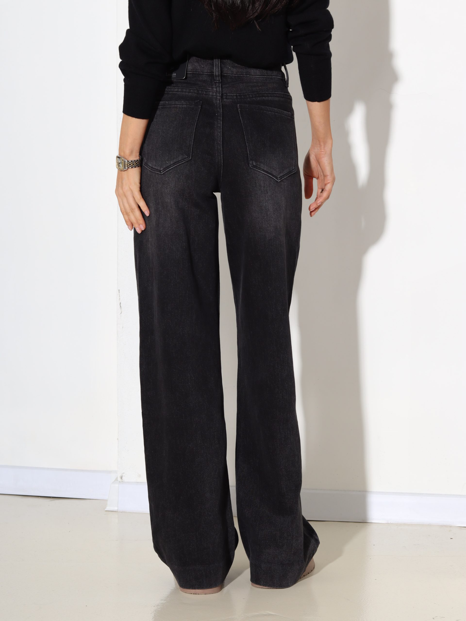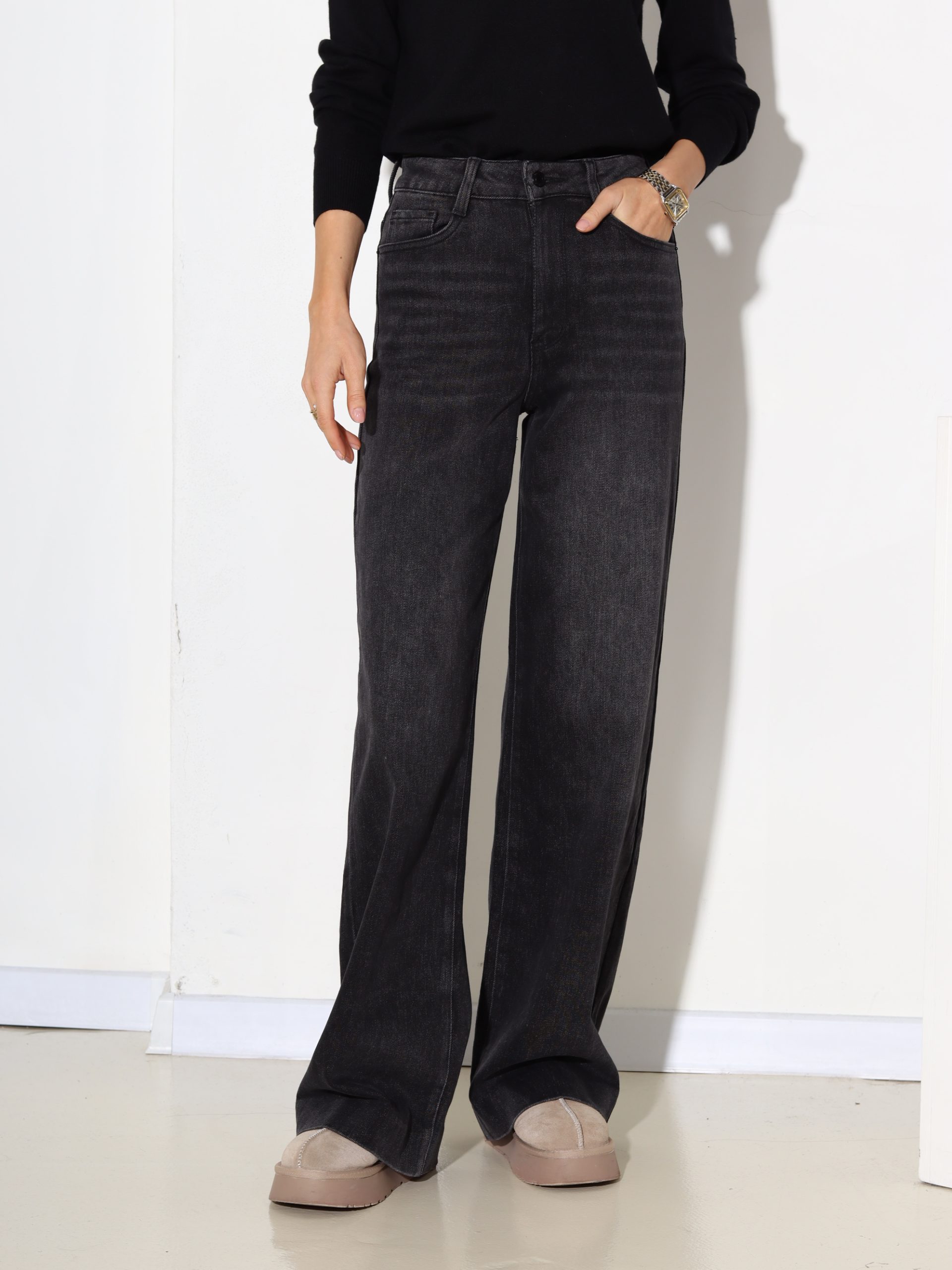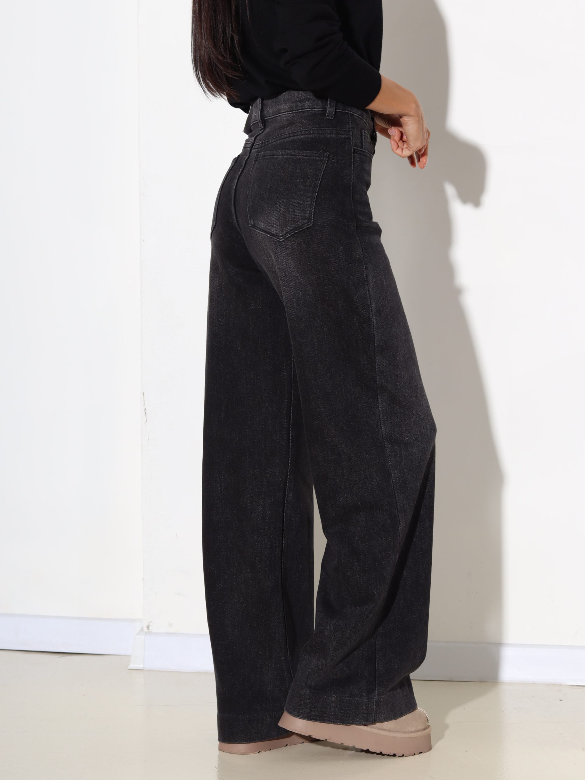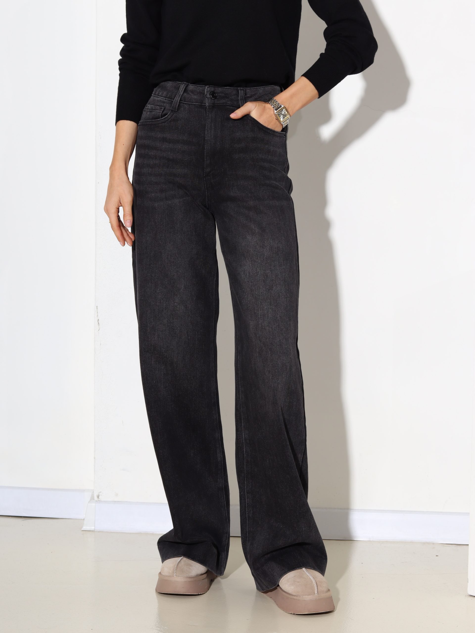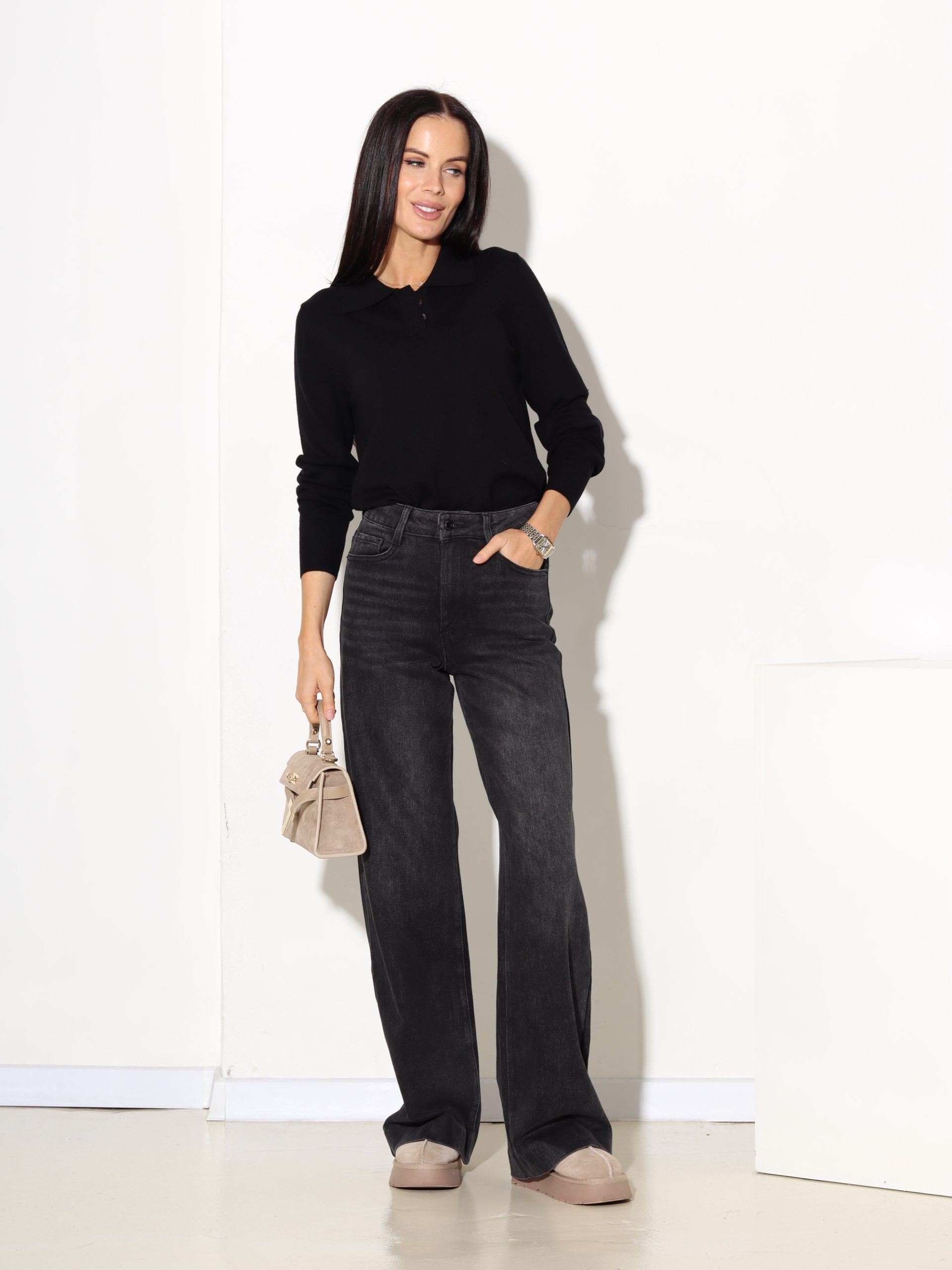Melnas džinsa bikses ar balinājuma efektu, Laulijas firmas ‘Full length’ modeļa bikses, biksēm ir paaugstināta jostas vieta, kabatas un rāvējslēdzēja aizdare